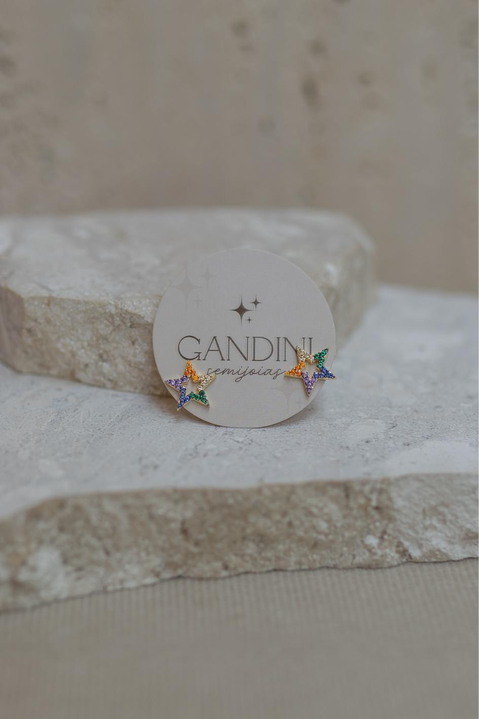 Brinco de estrela com zircônias coloridas no banho de ouro 18k.