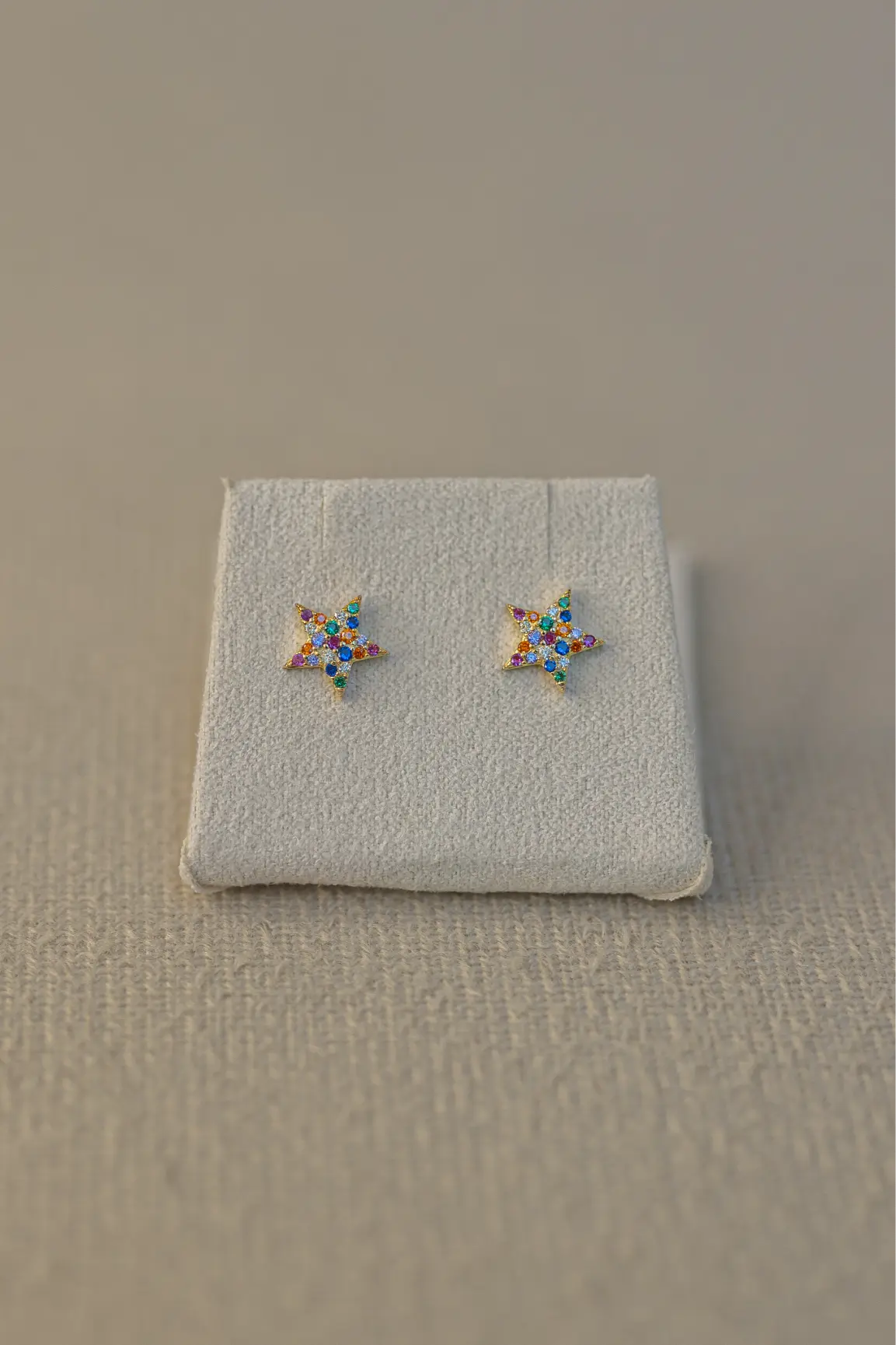 Brinco de estrela com zircônias coloridas prata 925 no banho de ouro 18k.