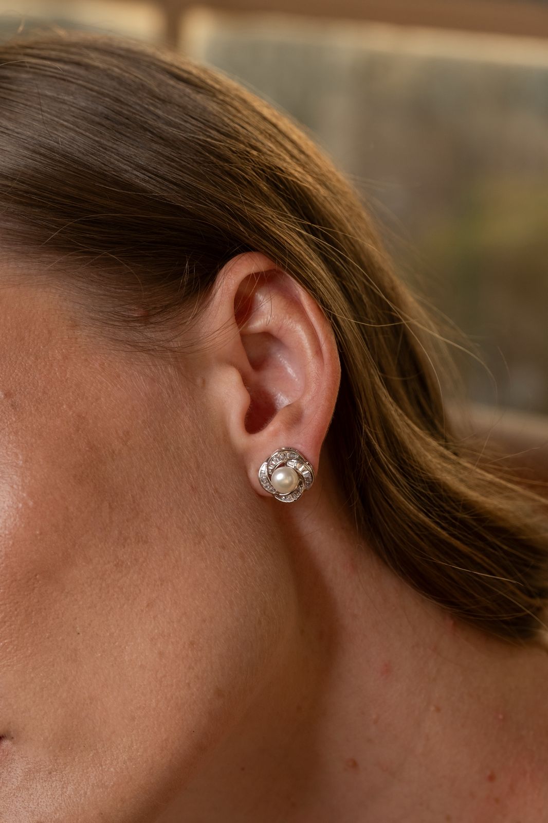 Brinco flor baguete com pérola natural no banho de ródio branco.