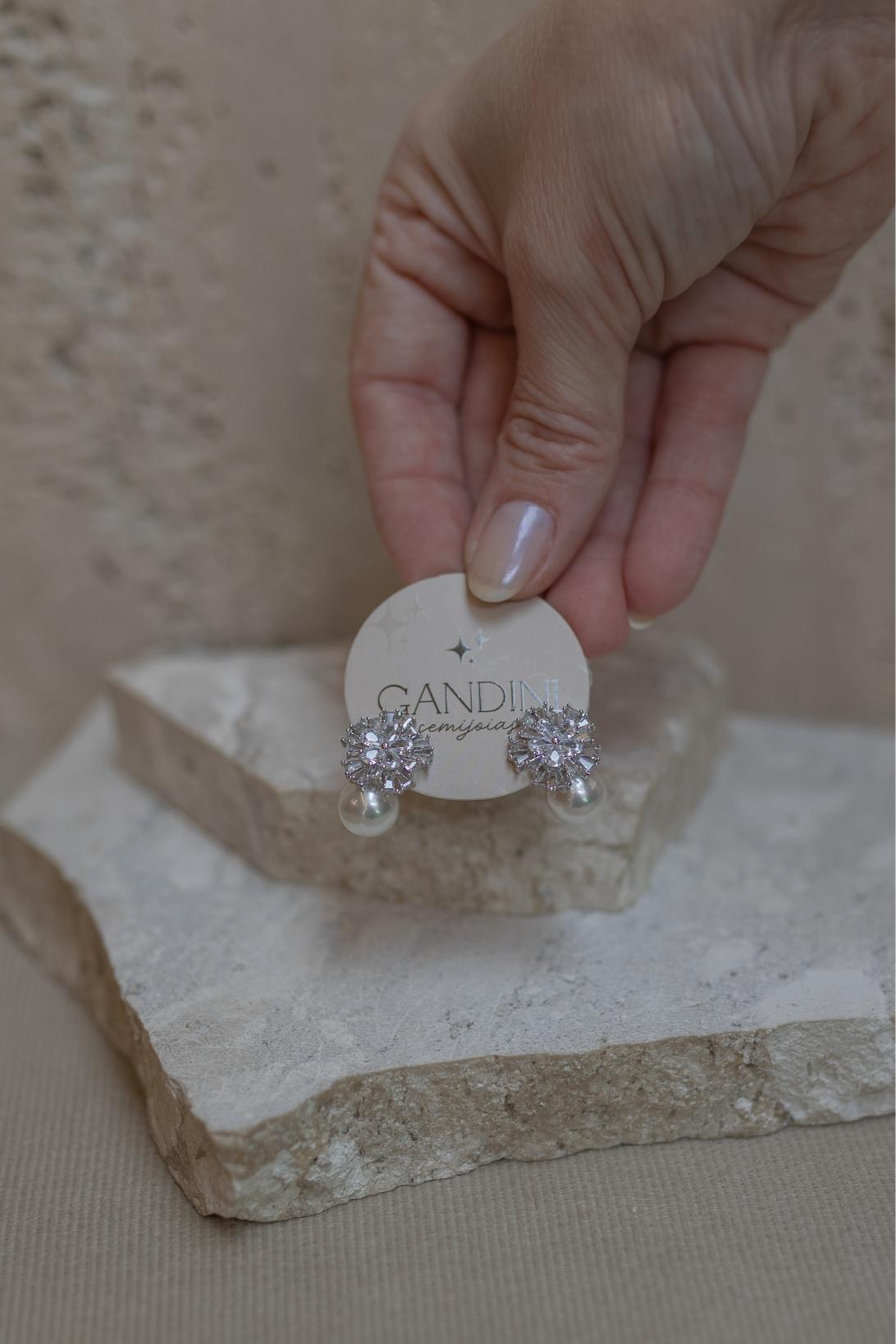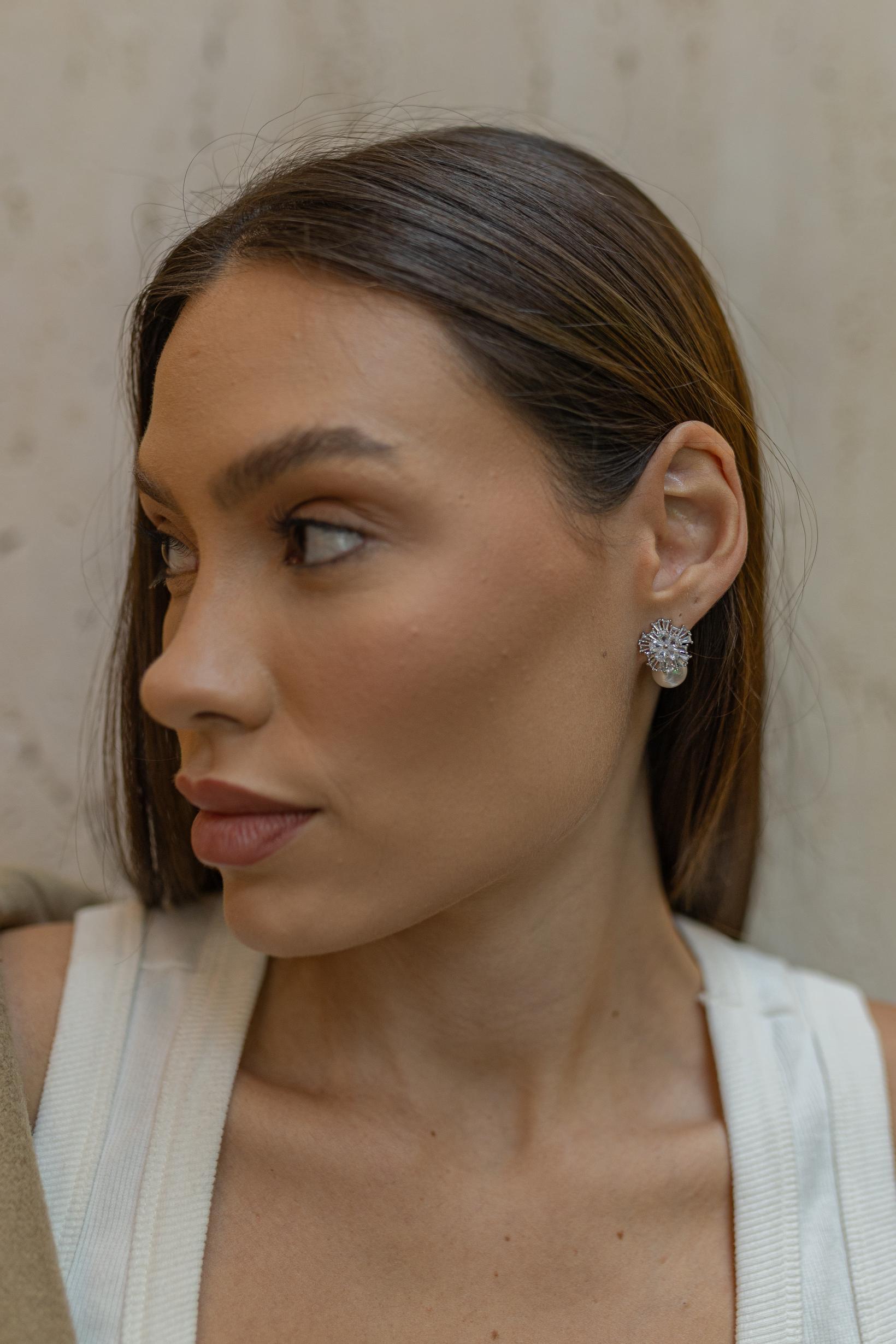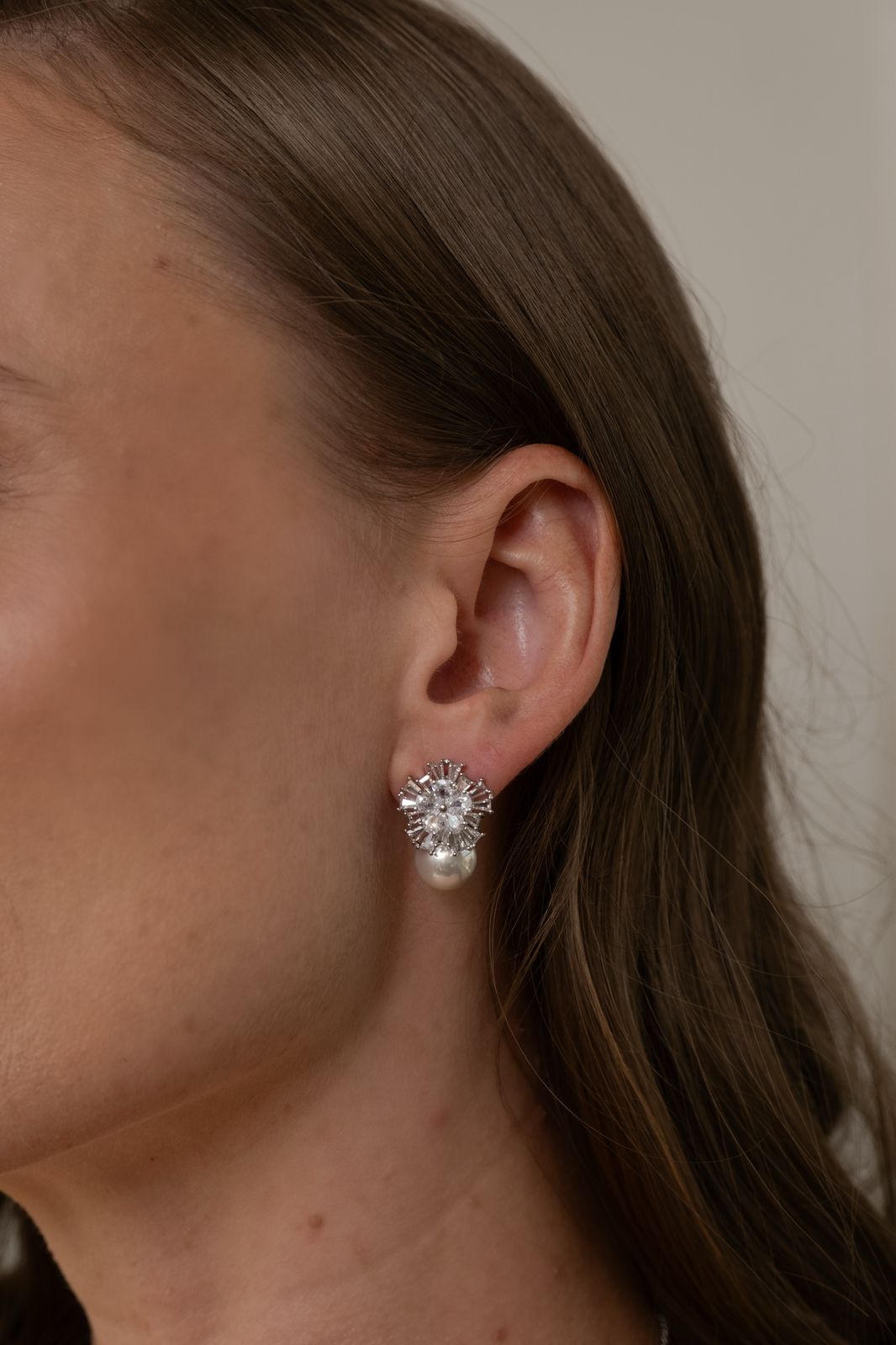 Brinco em formato de flor com zircônias em formato baguete e pérola no banho de ródio branco.