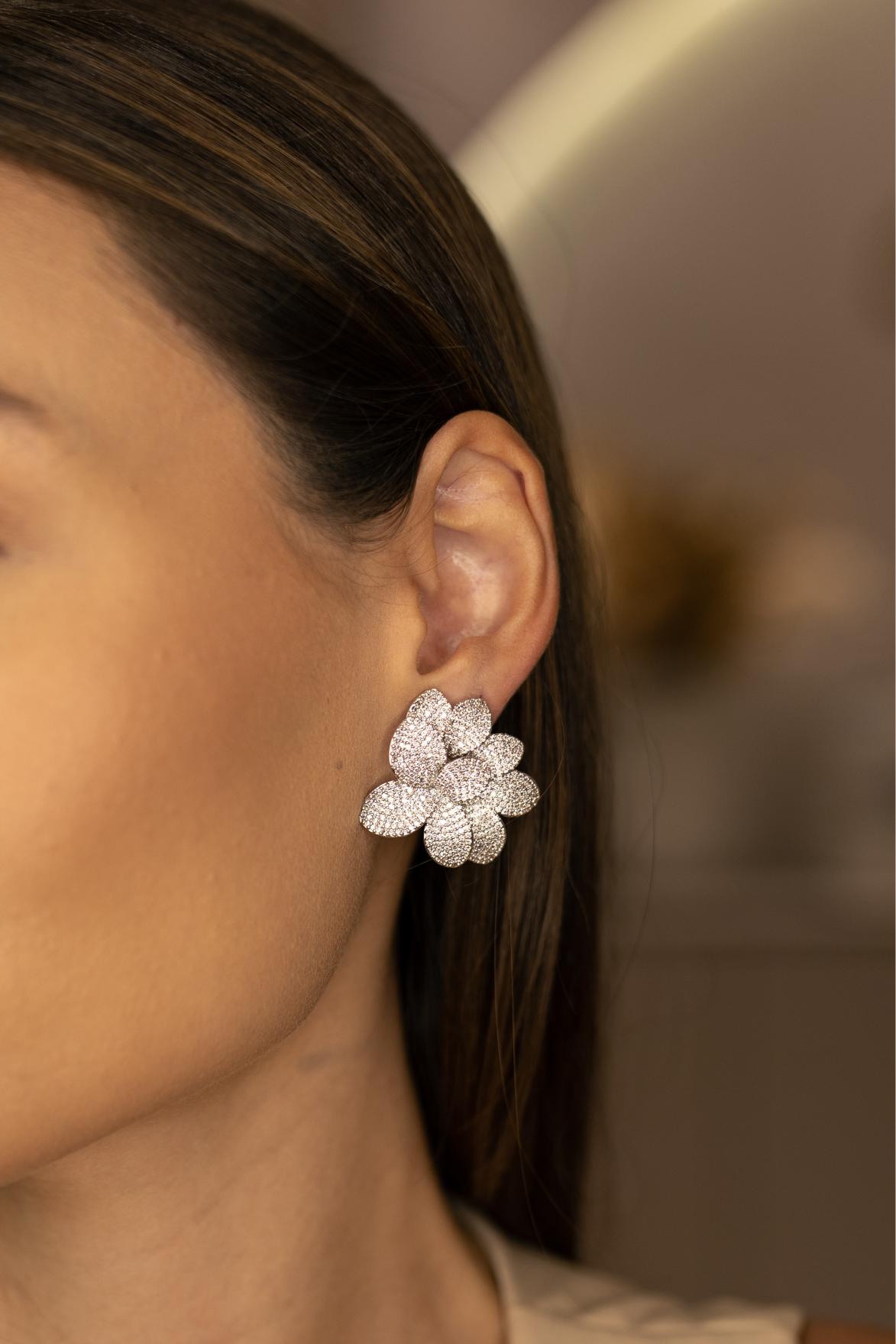 Brinco de flor de cravejado com zircônias cristal no banho de ródio branco.