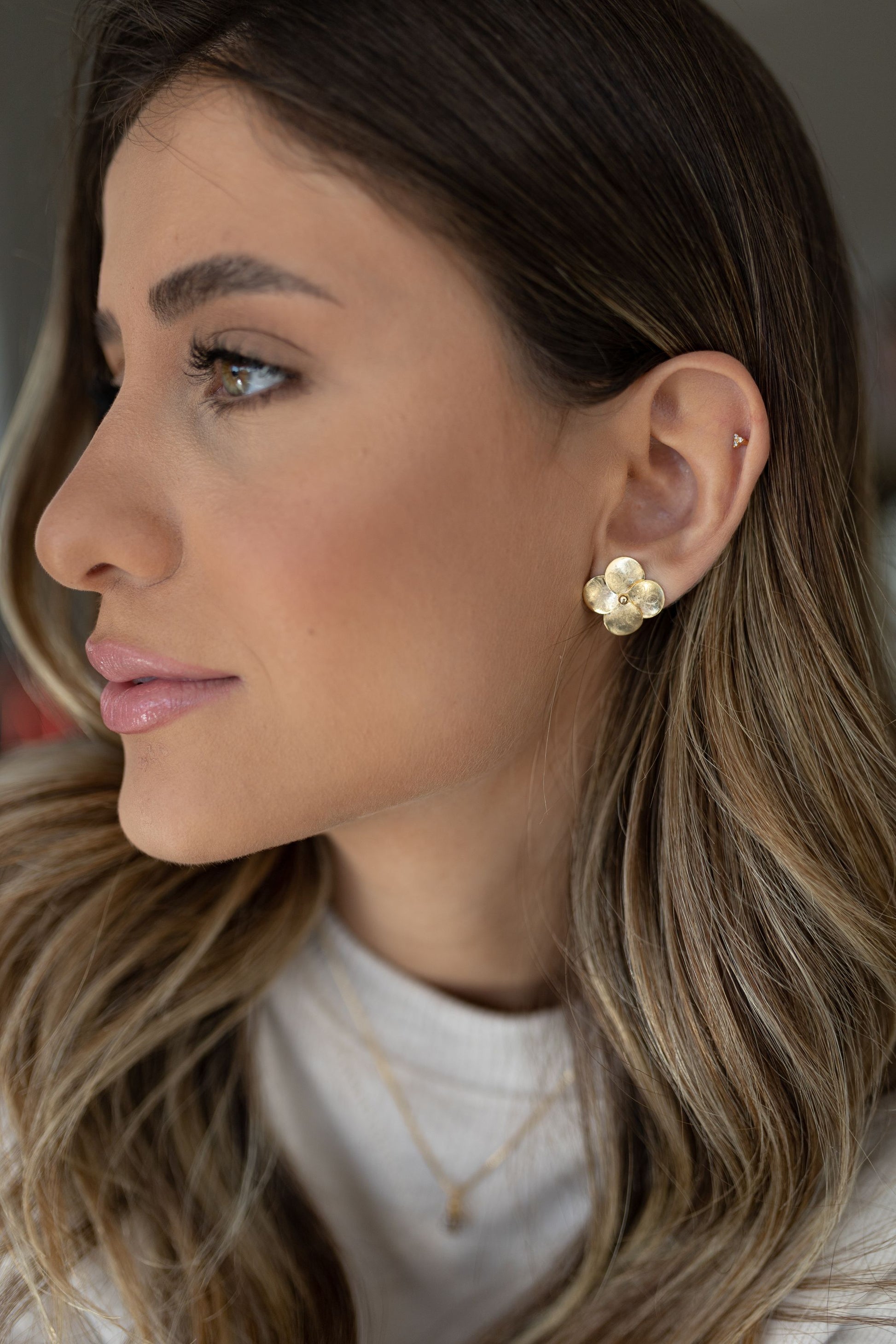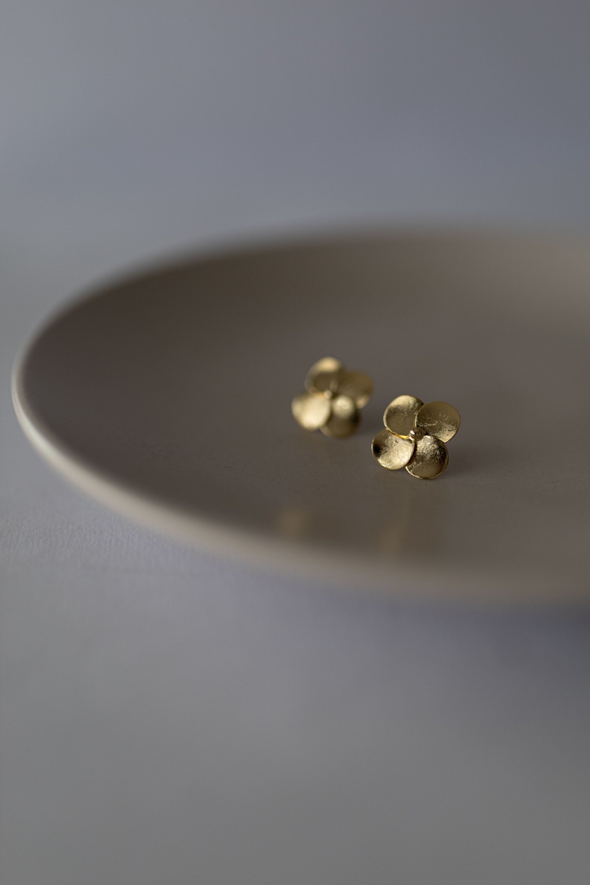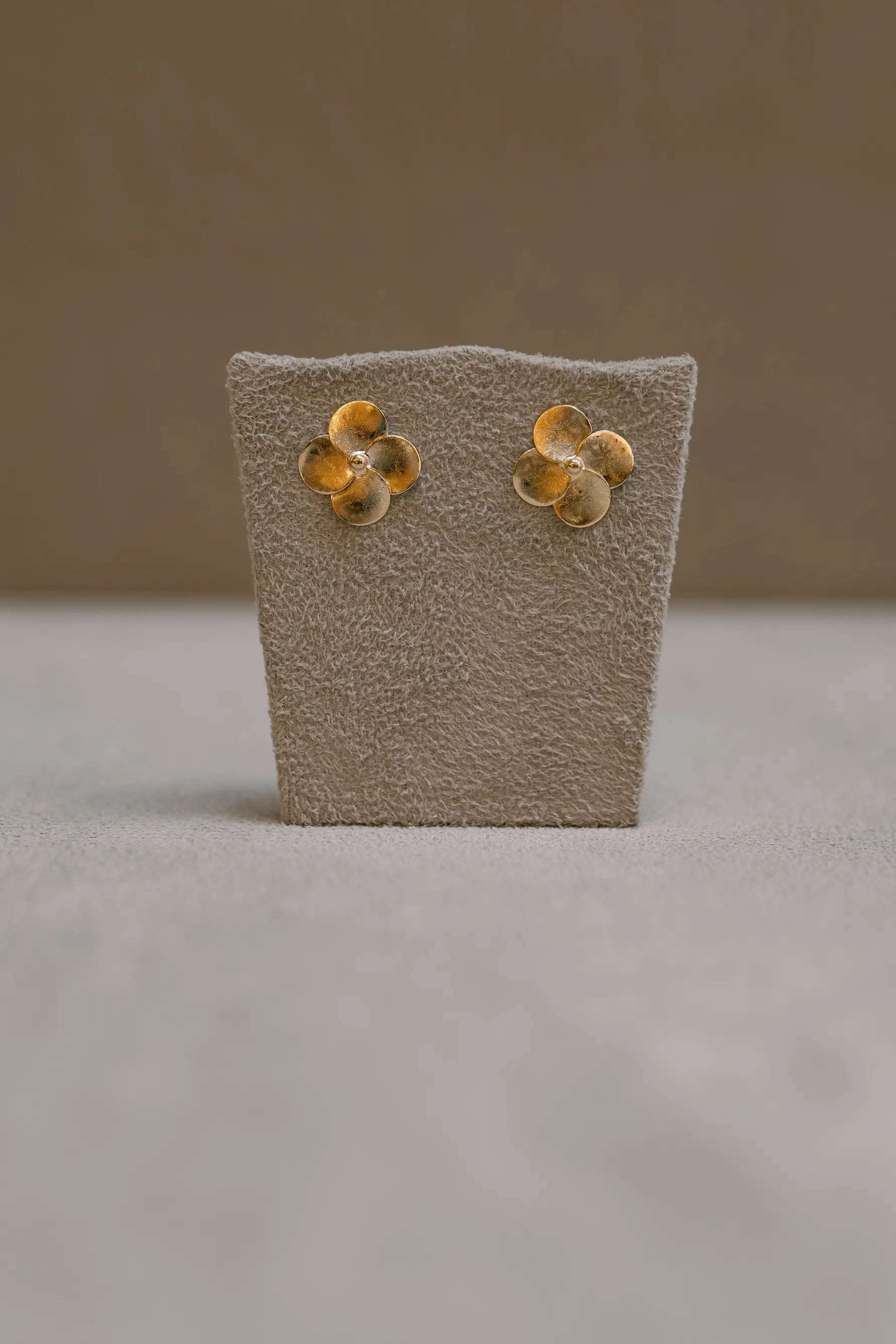Brinco com 4 pétalas escovada no banho de ouro 18k.