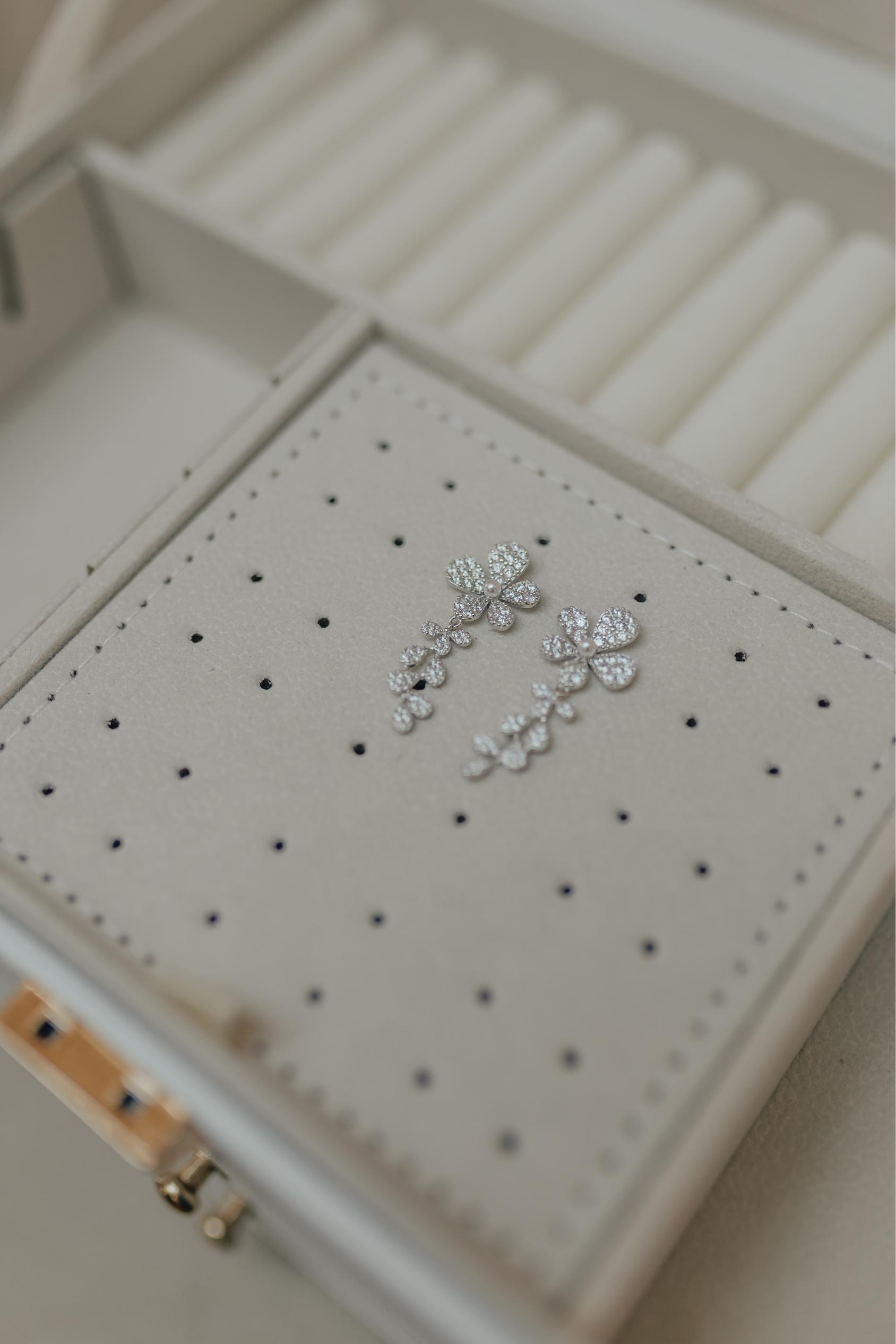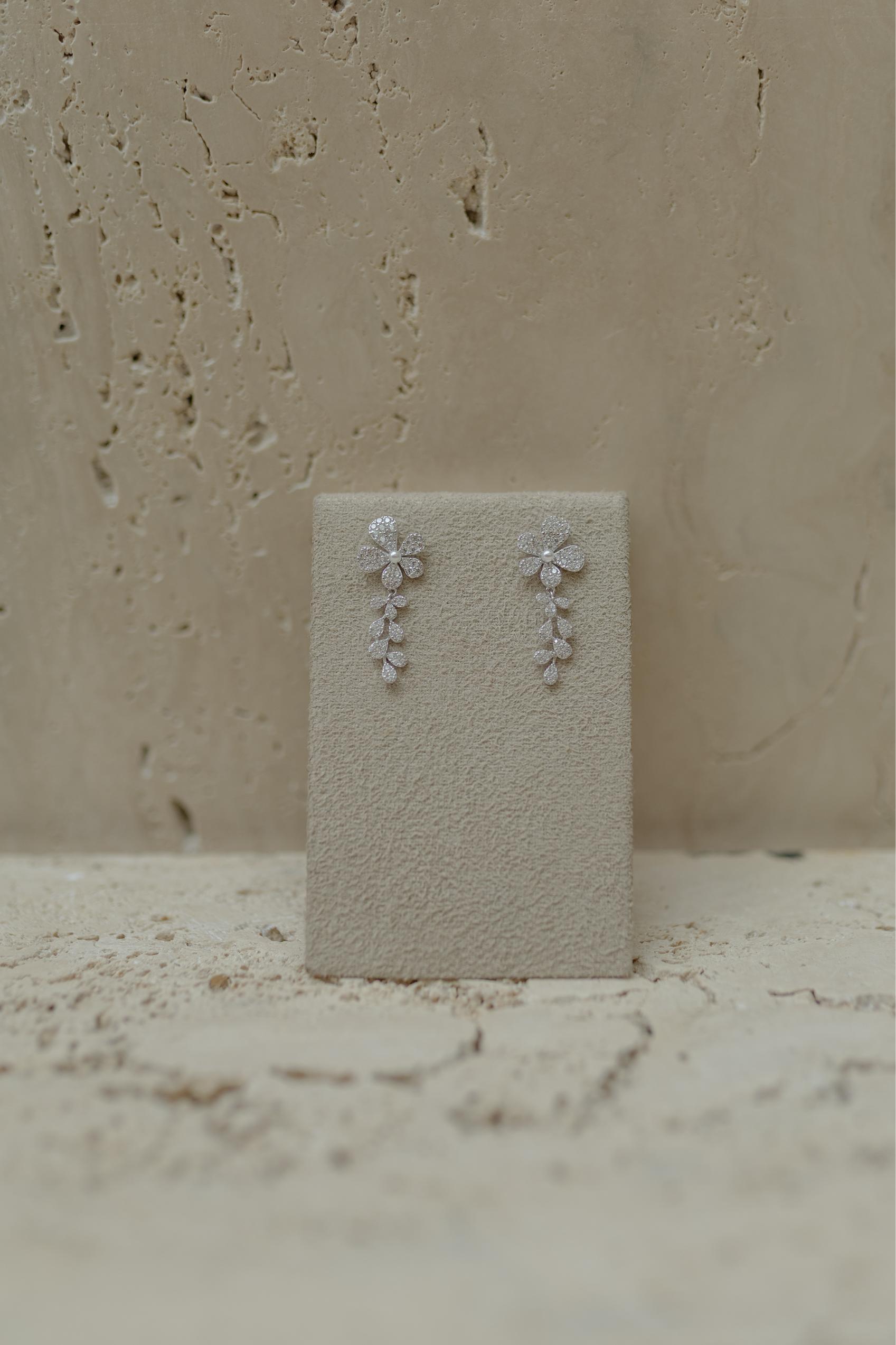 • Brinco Flor Petálas Pérola Prata 925 Ródio Branco