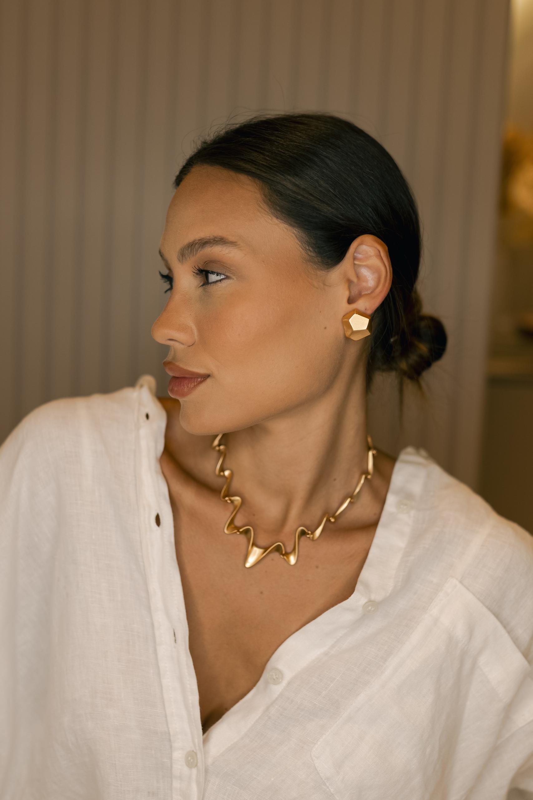Brinco de botão liso com design geométrico no banho fosco de ouro 18k.