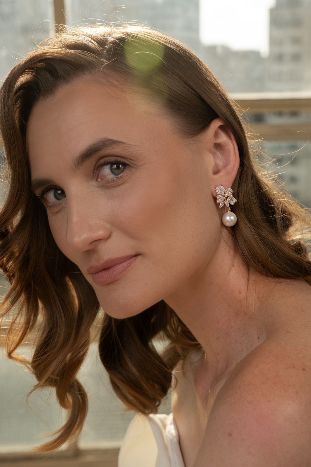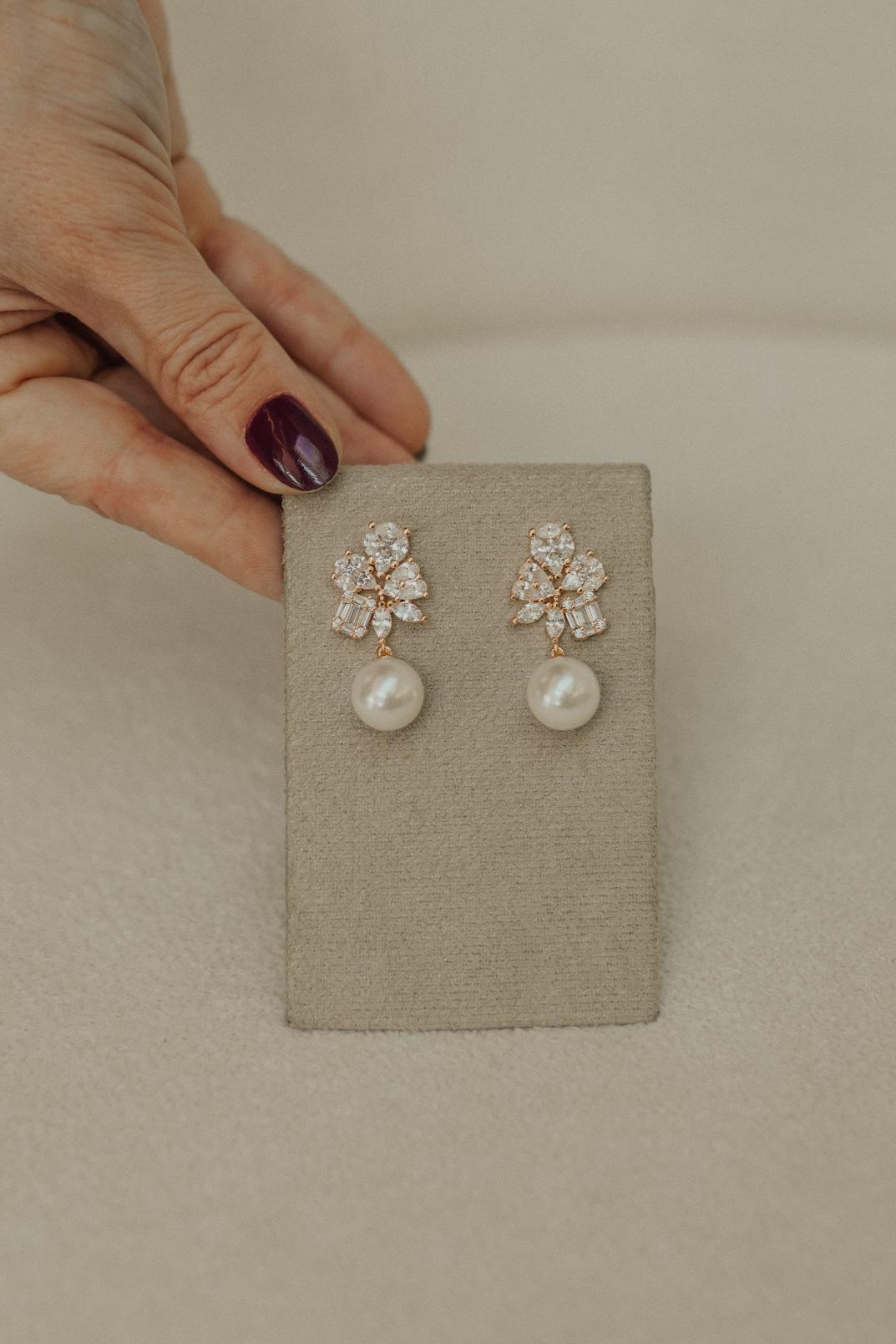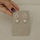 Brinco com zircônias em formatos geométricos na cor cristal com pérola e banho de ouro 18k.