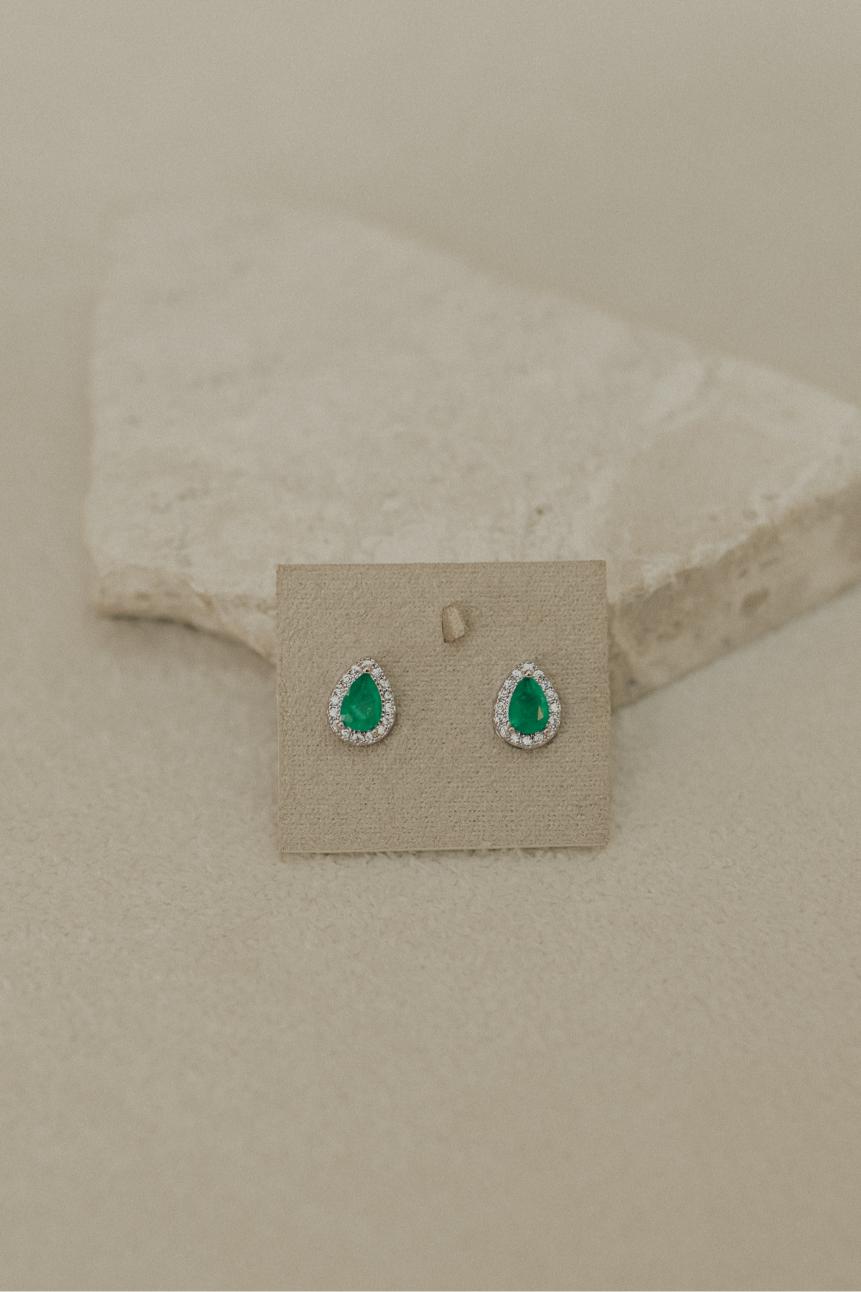 Brinco Gota Esmeralda Borda Cravejada Ródio Branco