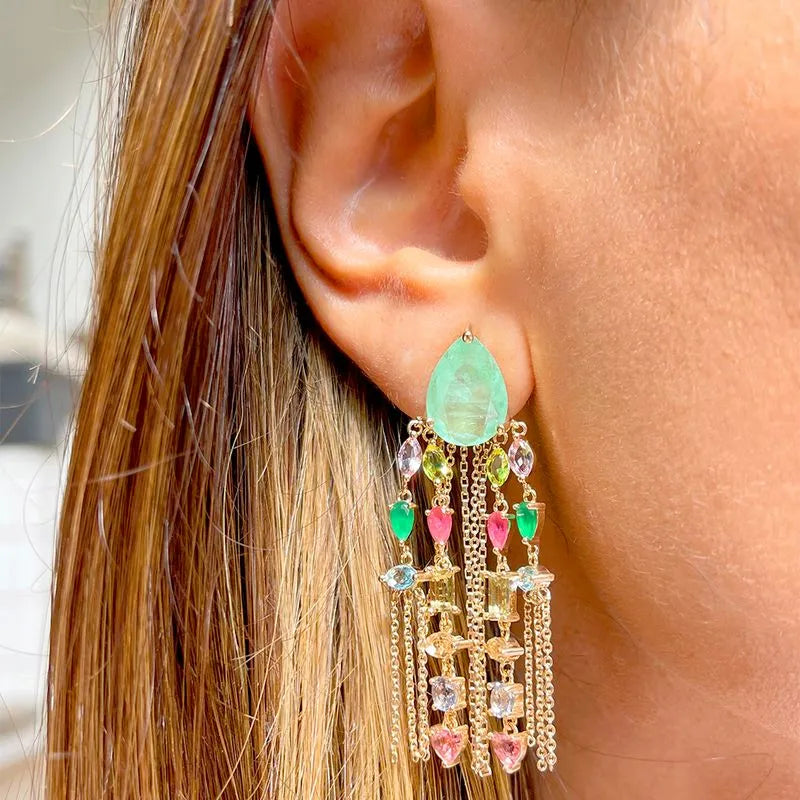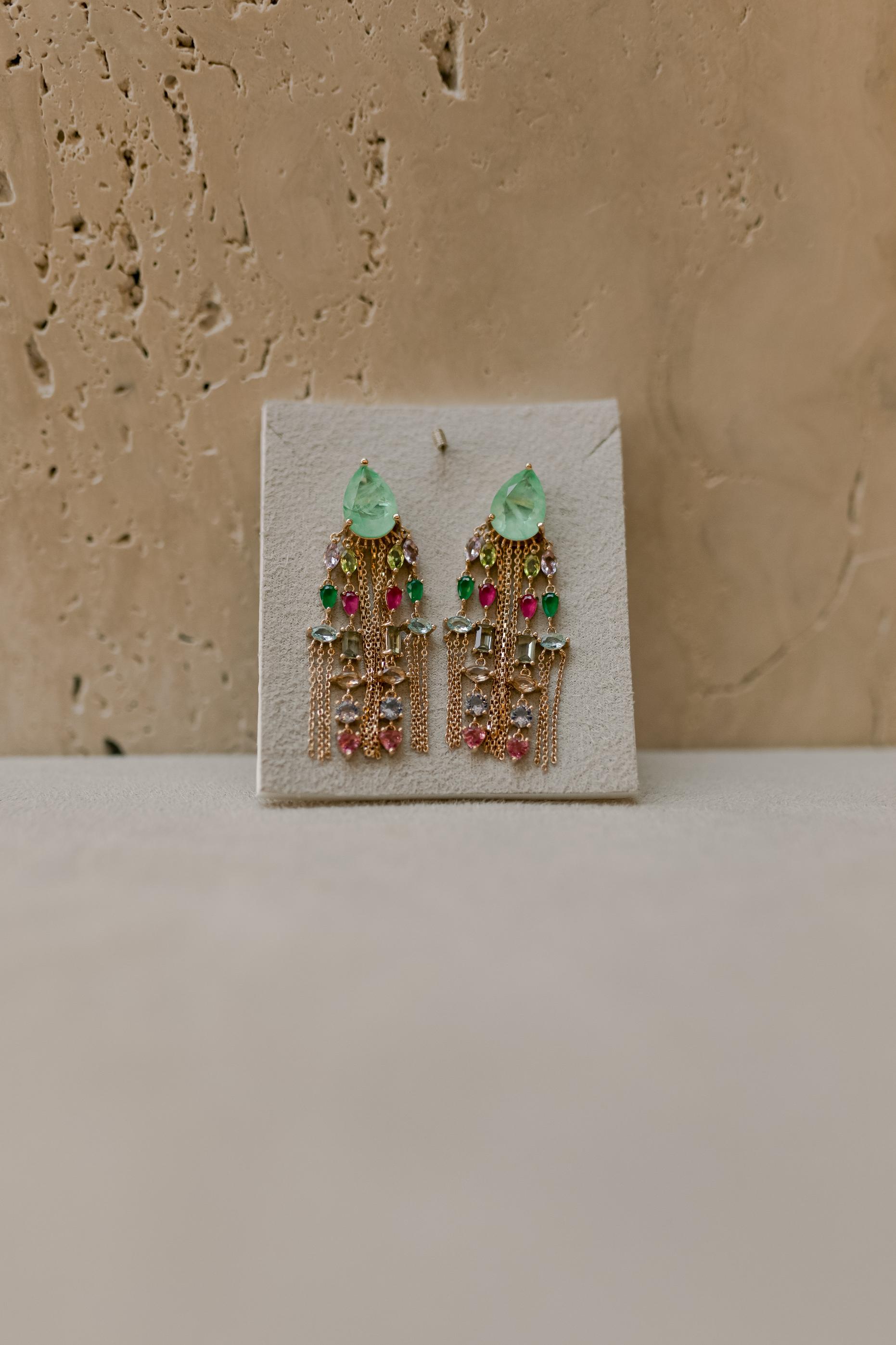 Brinco com gota Esmeralda Colombiana com detalhes de zircônias coloridas (esmeralda, rubi, peridoto e turmalina rosa) penduradas na corrente no banho de ouro 18k.