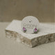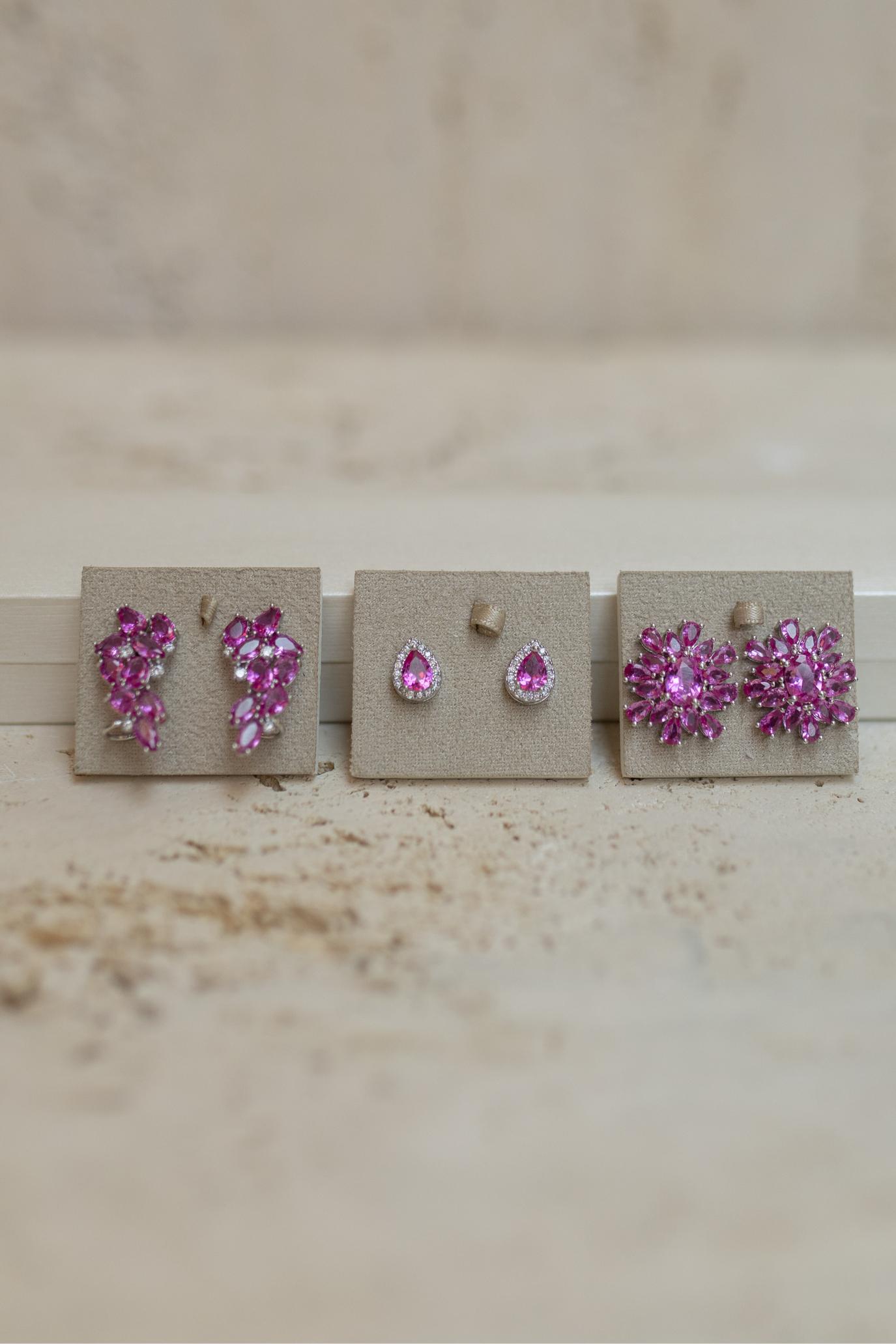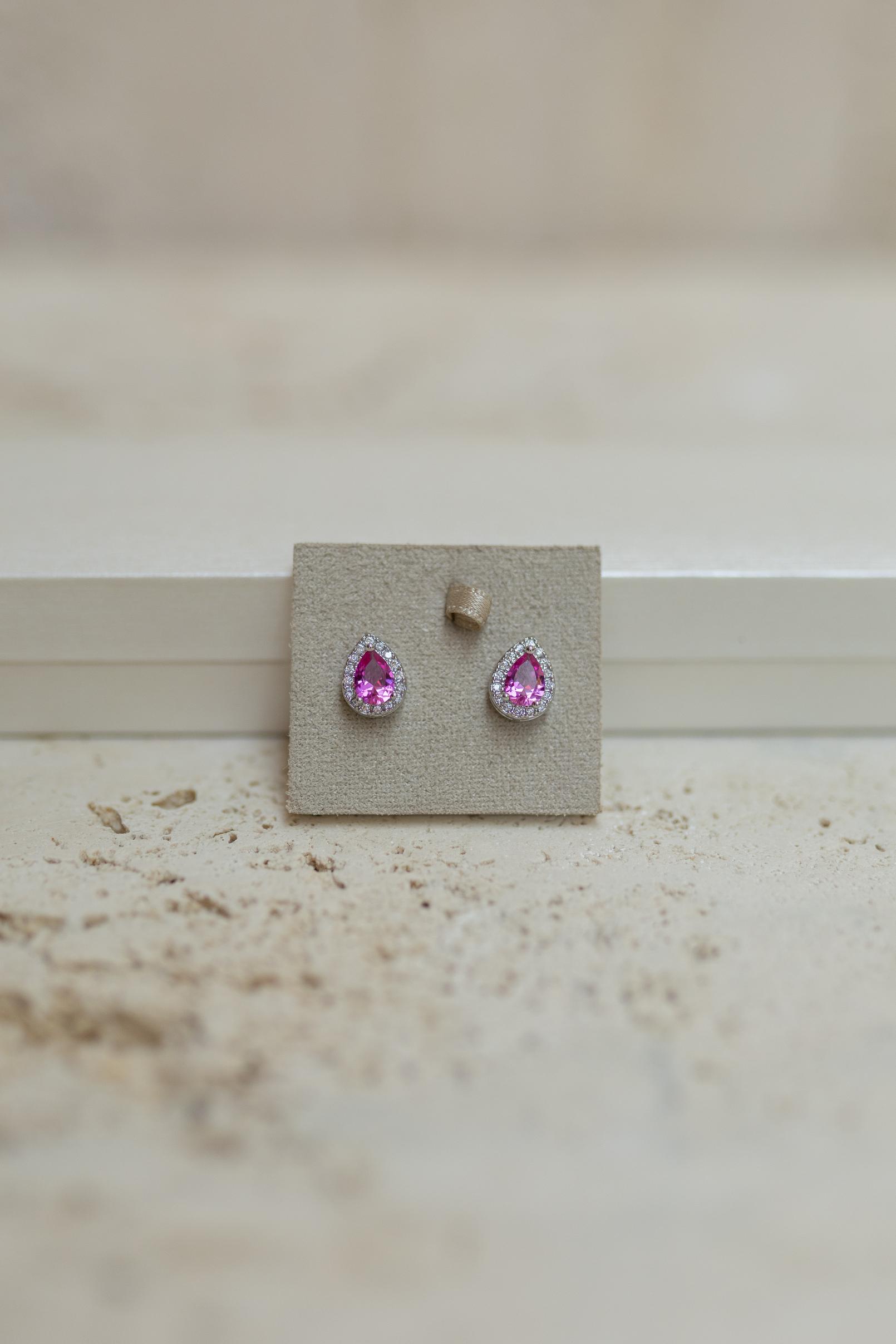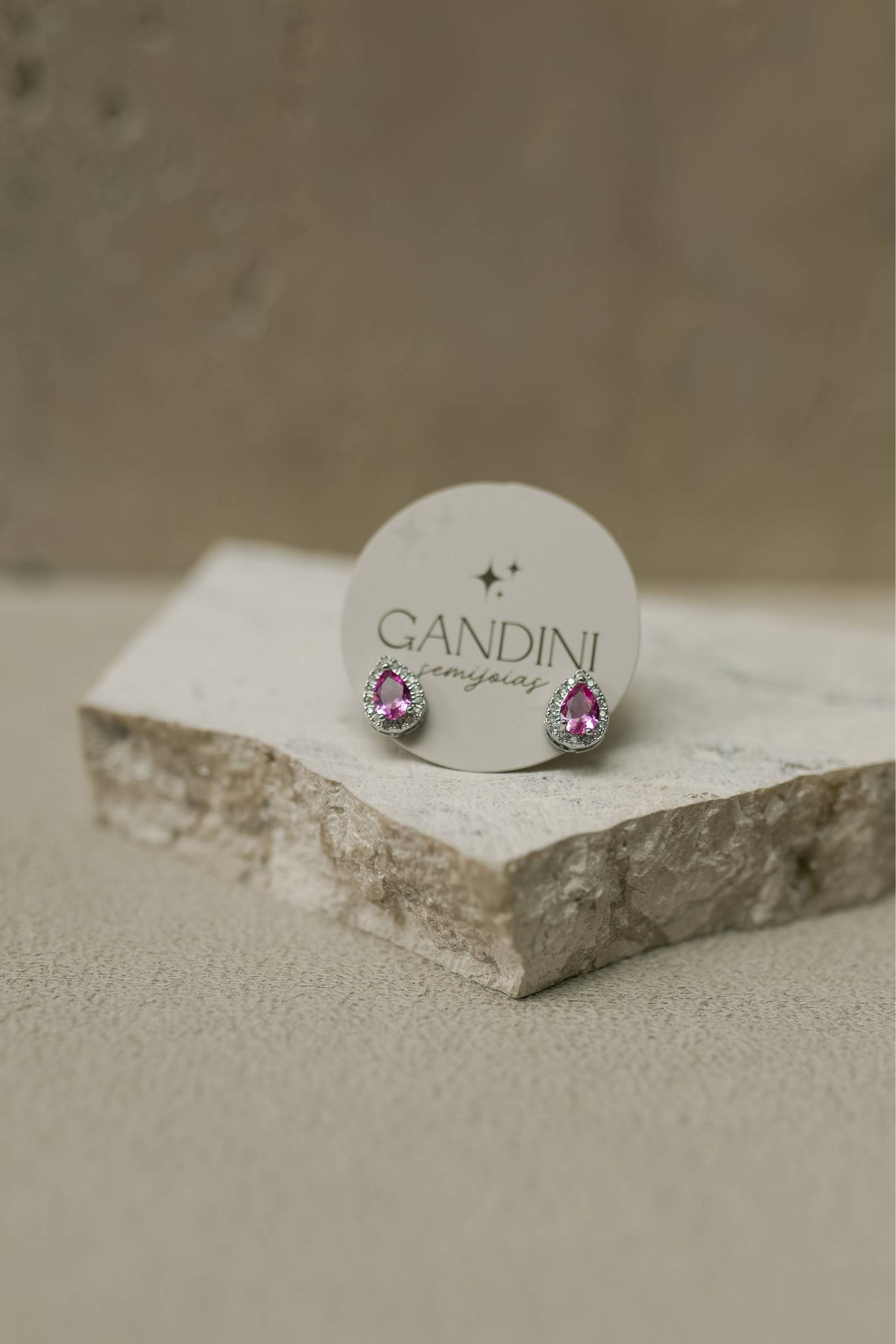 Brinco de gota pink com borda cravejada de zircônias na cor cristal, no banho de ródio branco.