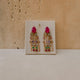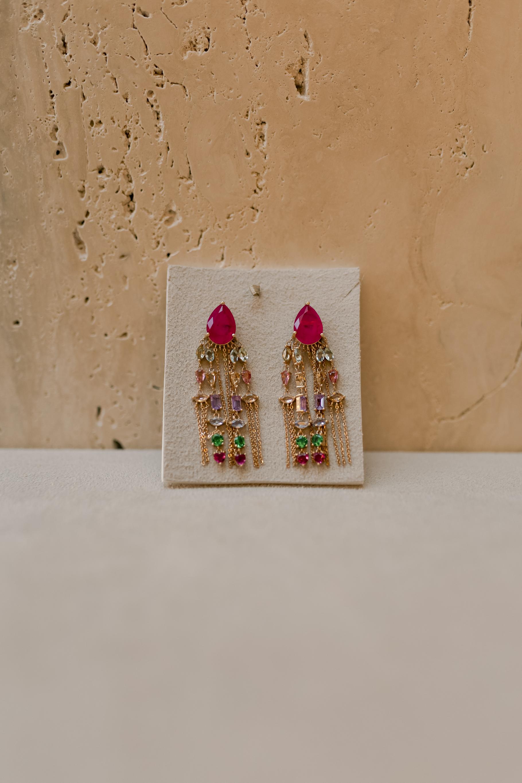 Brinco com gota Turmalina Pink com detalhes de zircônias coloridas penduradas na corrente no banho de ouro 18k.