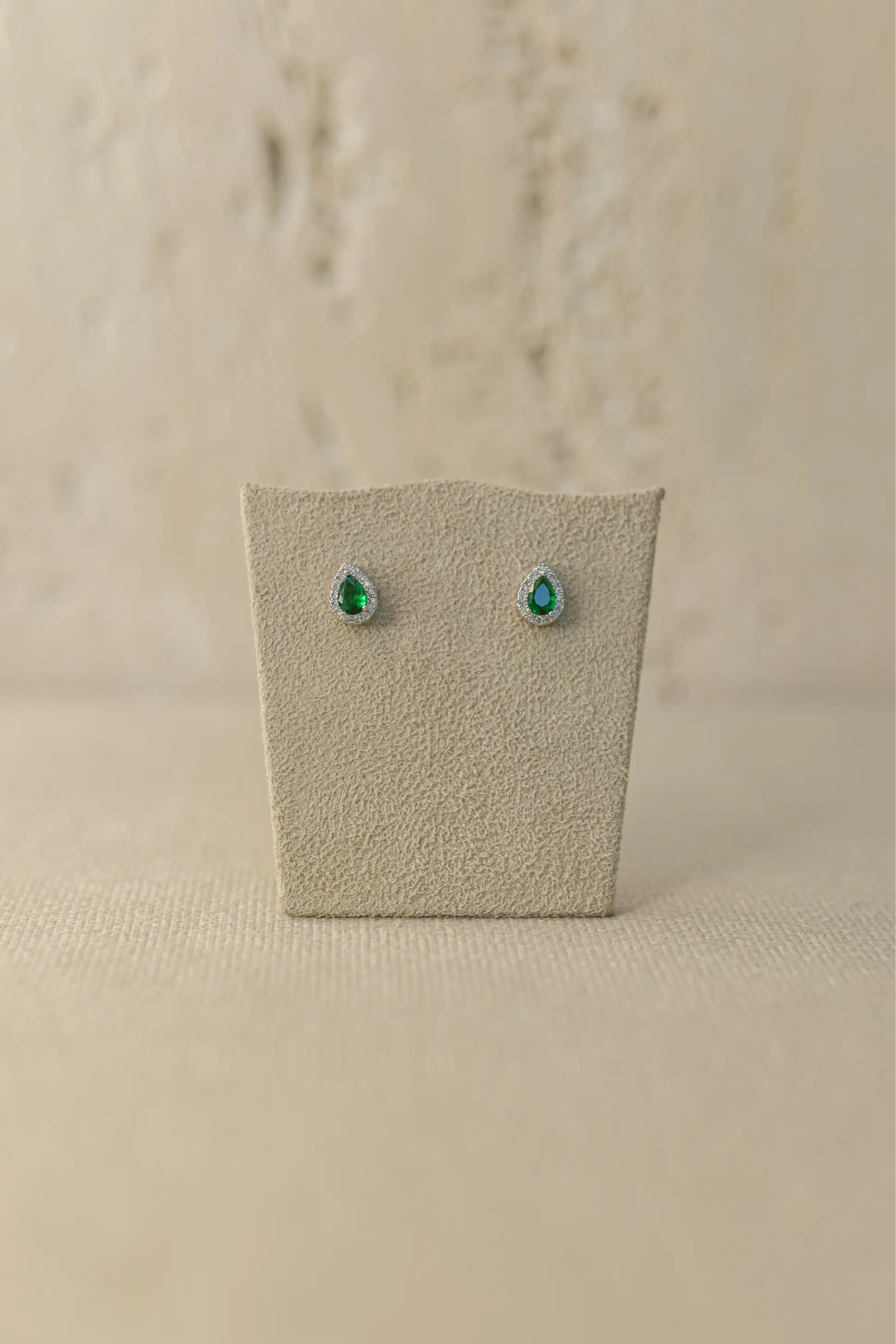 Brinco de gota verde com borda cravejada de zircônias na cor cristal, no banho de ródio branco.