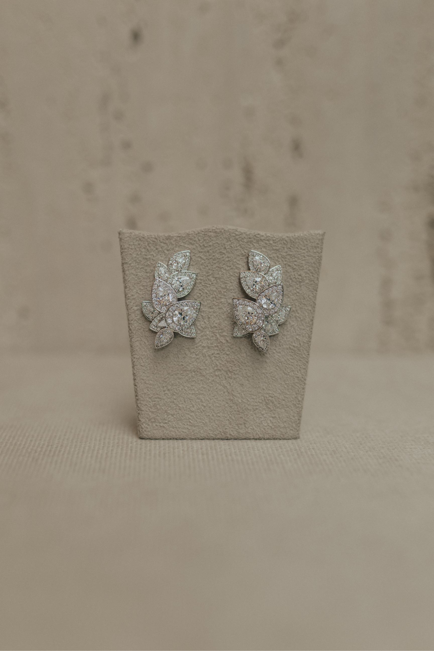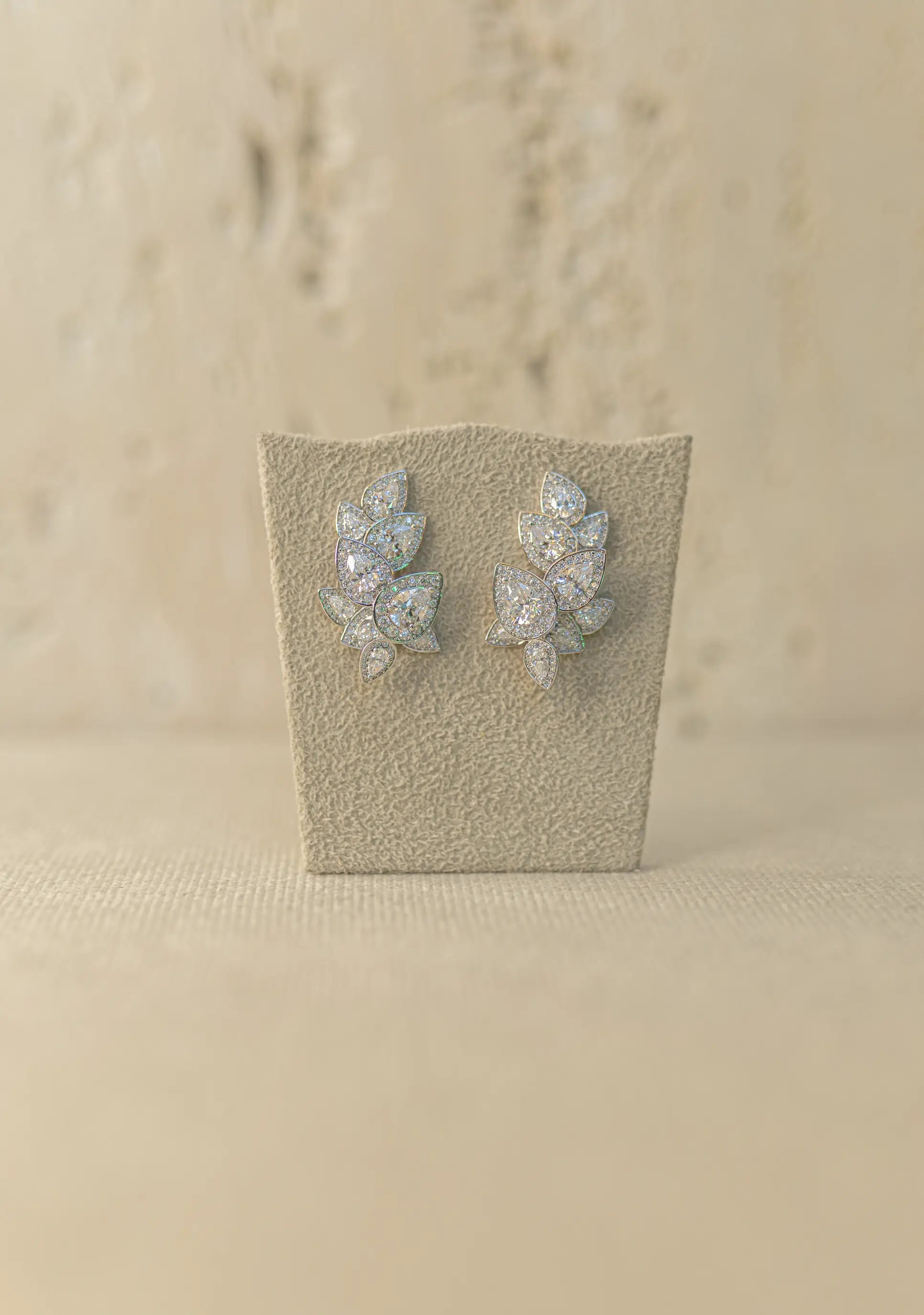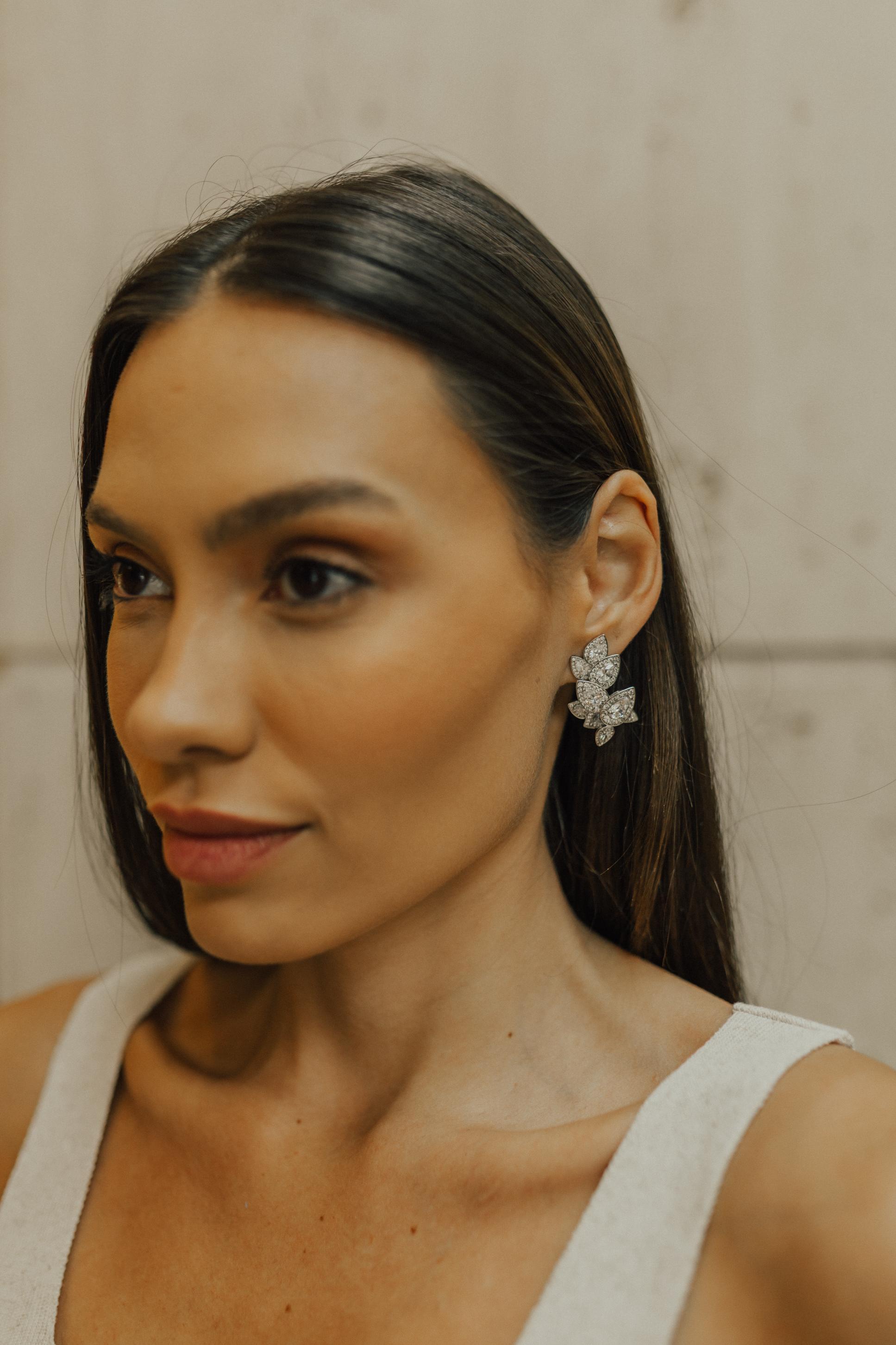 Brinco luxo com folhas cravejadas no banho de ródio branco.
