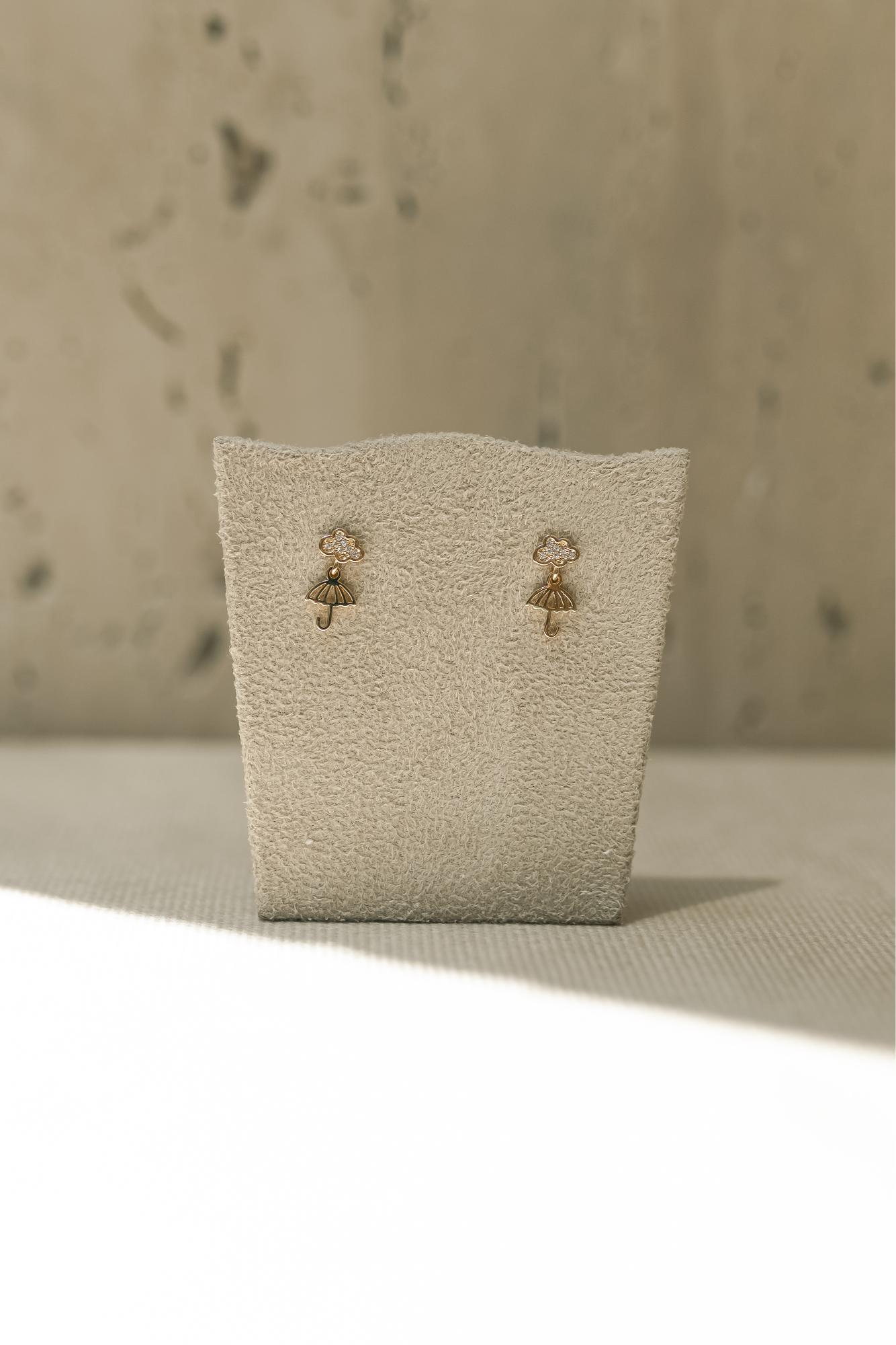 Brinco infantil de nuvem e guarda-chuva com zircônias na cor cristal no banho de ouro 18k.