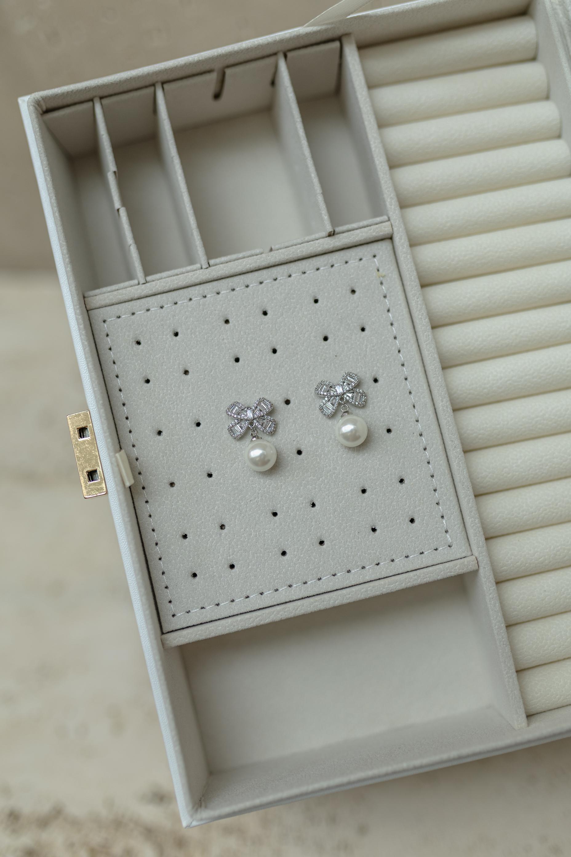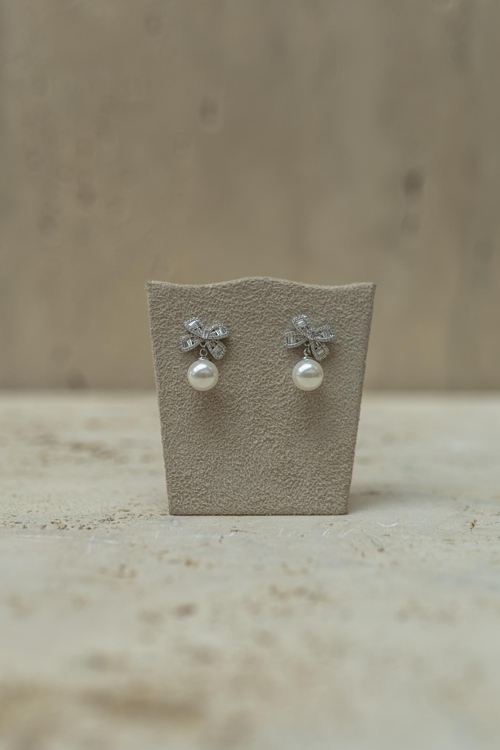 Brinco de laço na cor cristal no banho de ouro 18k com detalhe pérola shell.