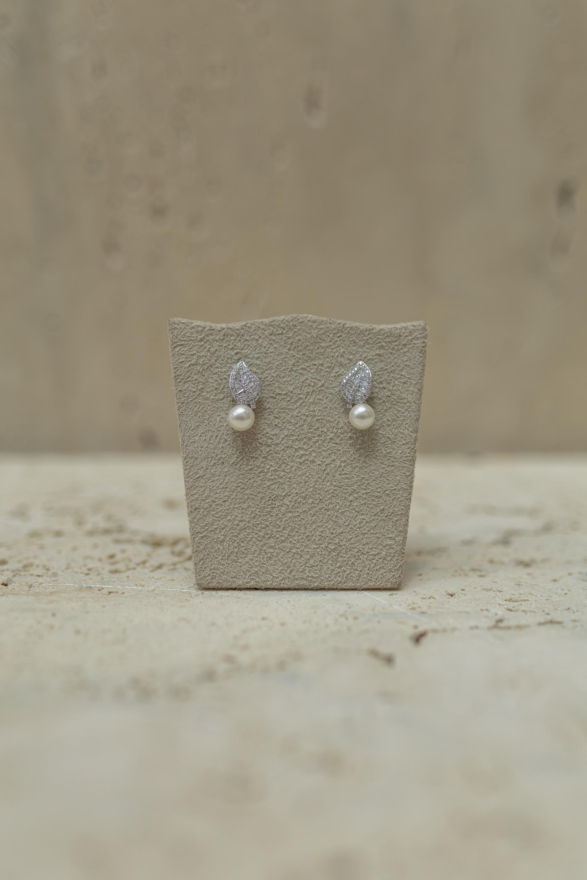 Brinco super delicado com detalhe de folha e pérola no banho de ródio branco.