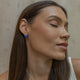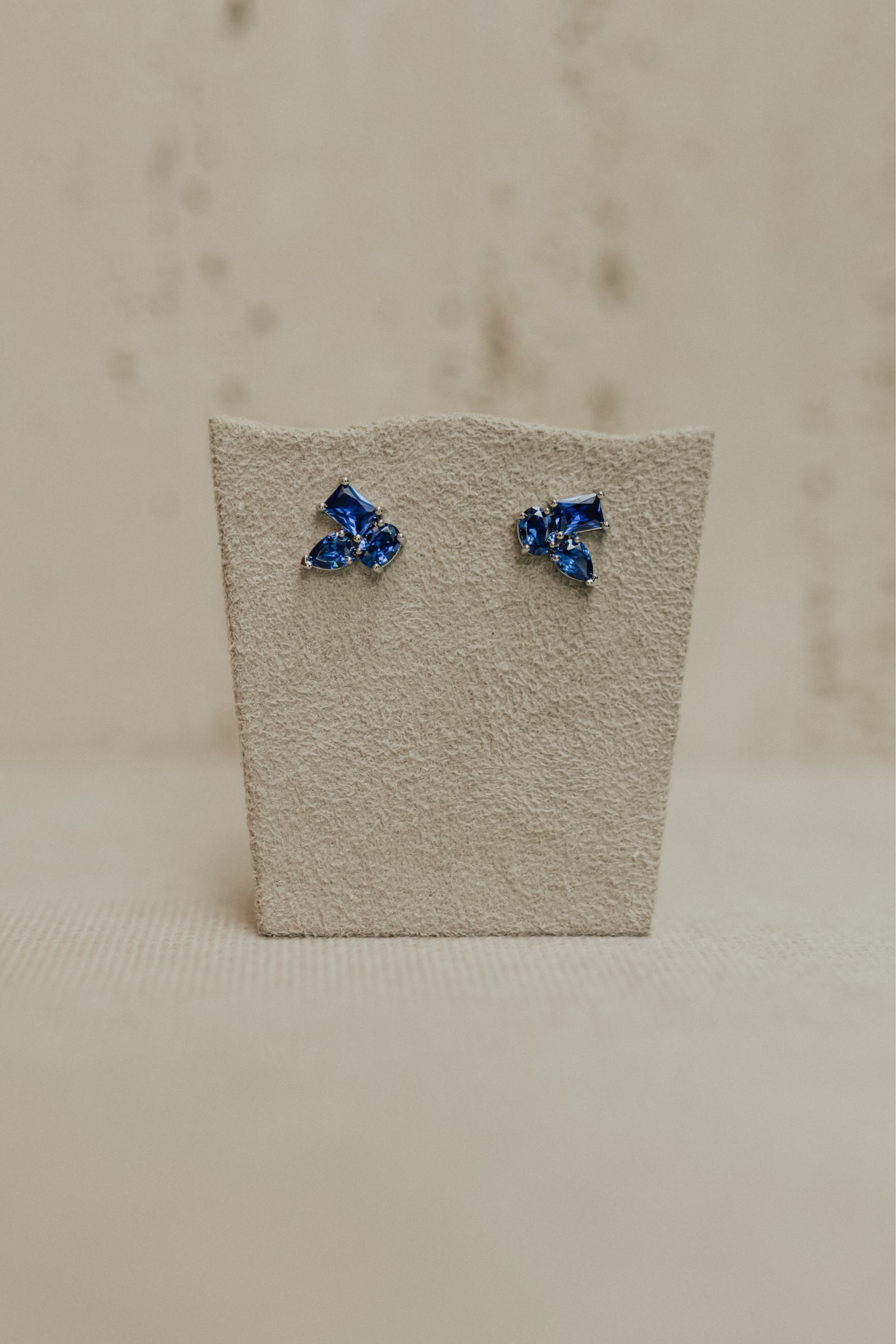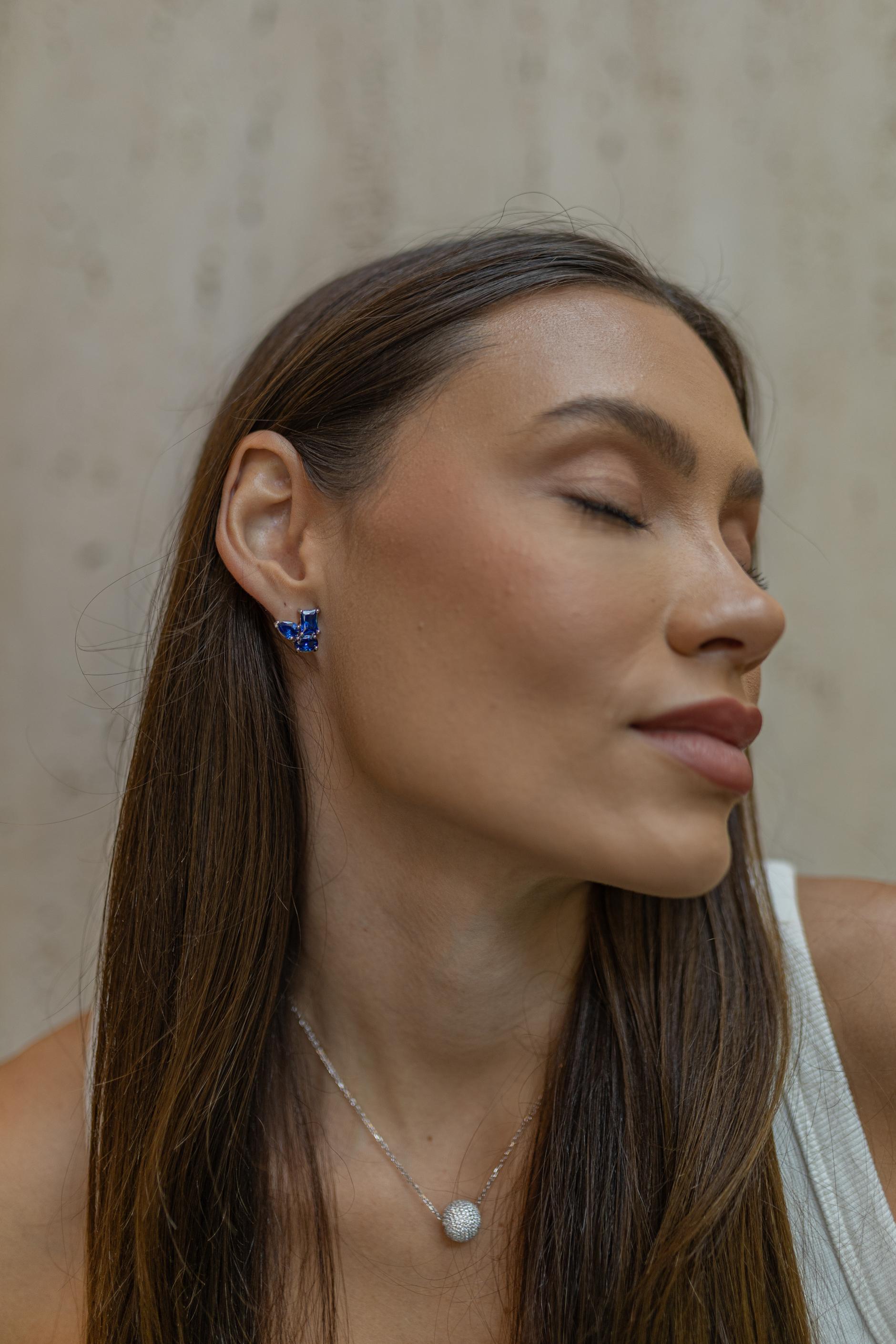 As formas geométricas surgiram nas coleções de semijoias e joias como uma tendência que se adapta facilmente a diversos estilos. o brinco pequeno contém pedras de azul lapidadas nos formatos de retângulo, oval e gota posicionadas lado a lado no banho de ródio branco.
