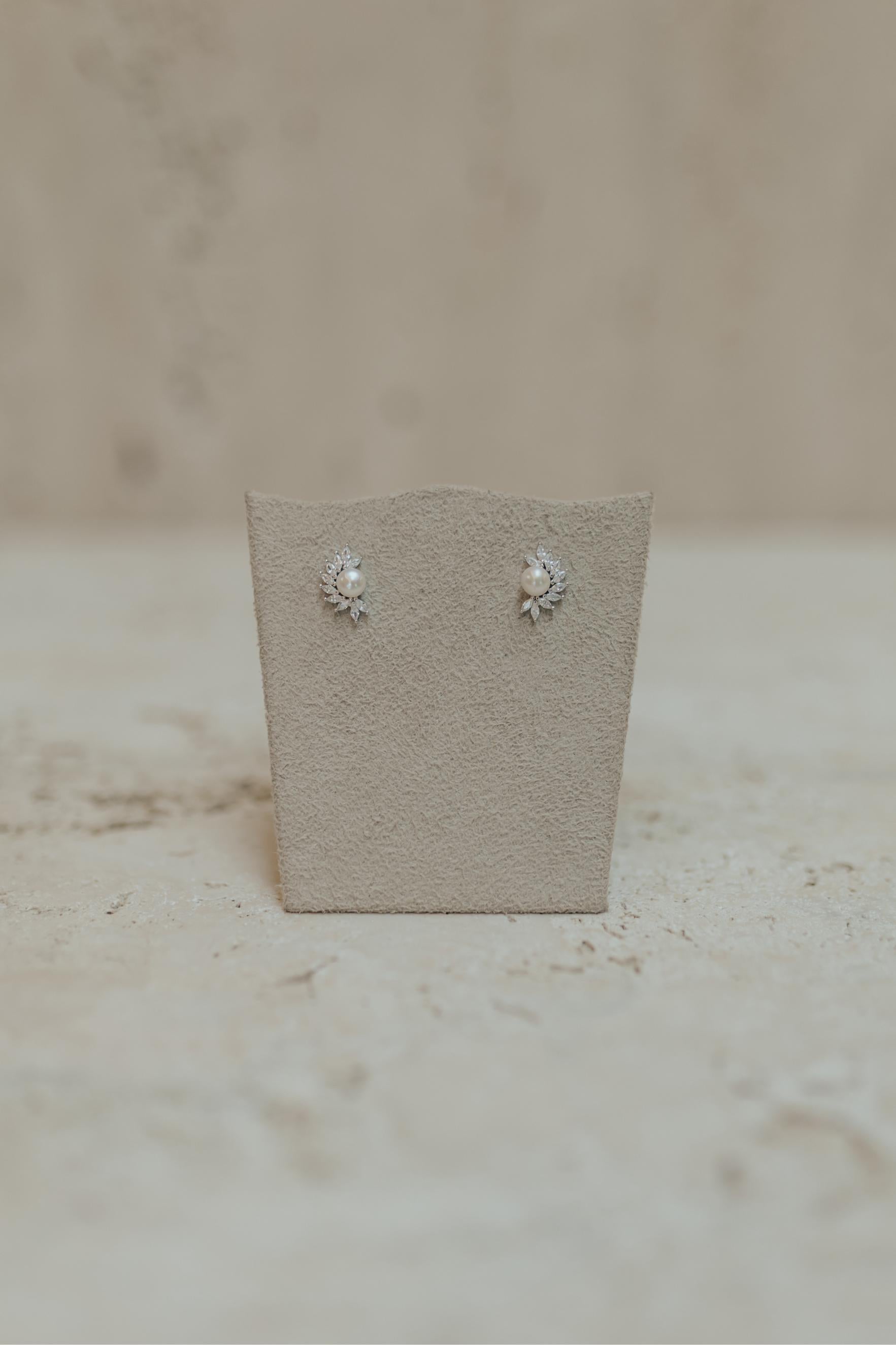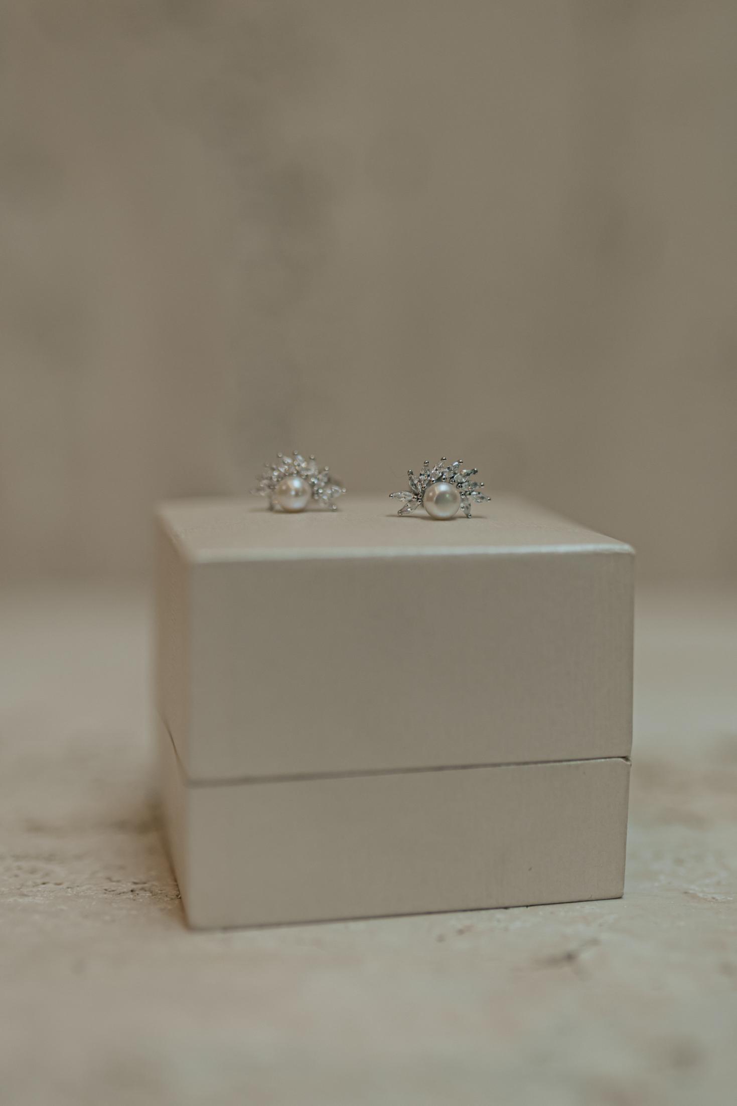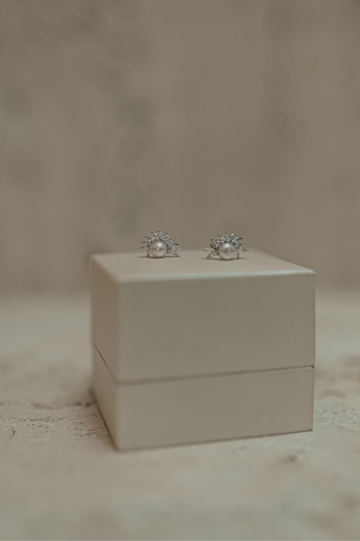 Brinco mini leque em navetes com zircônias na cor cristal e pérola na prata 925 e banho de ródio branco.