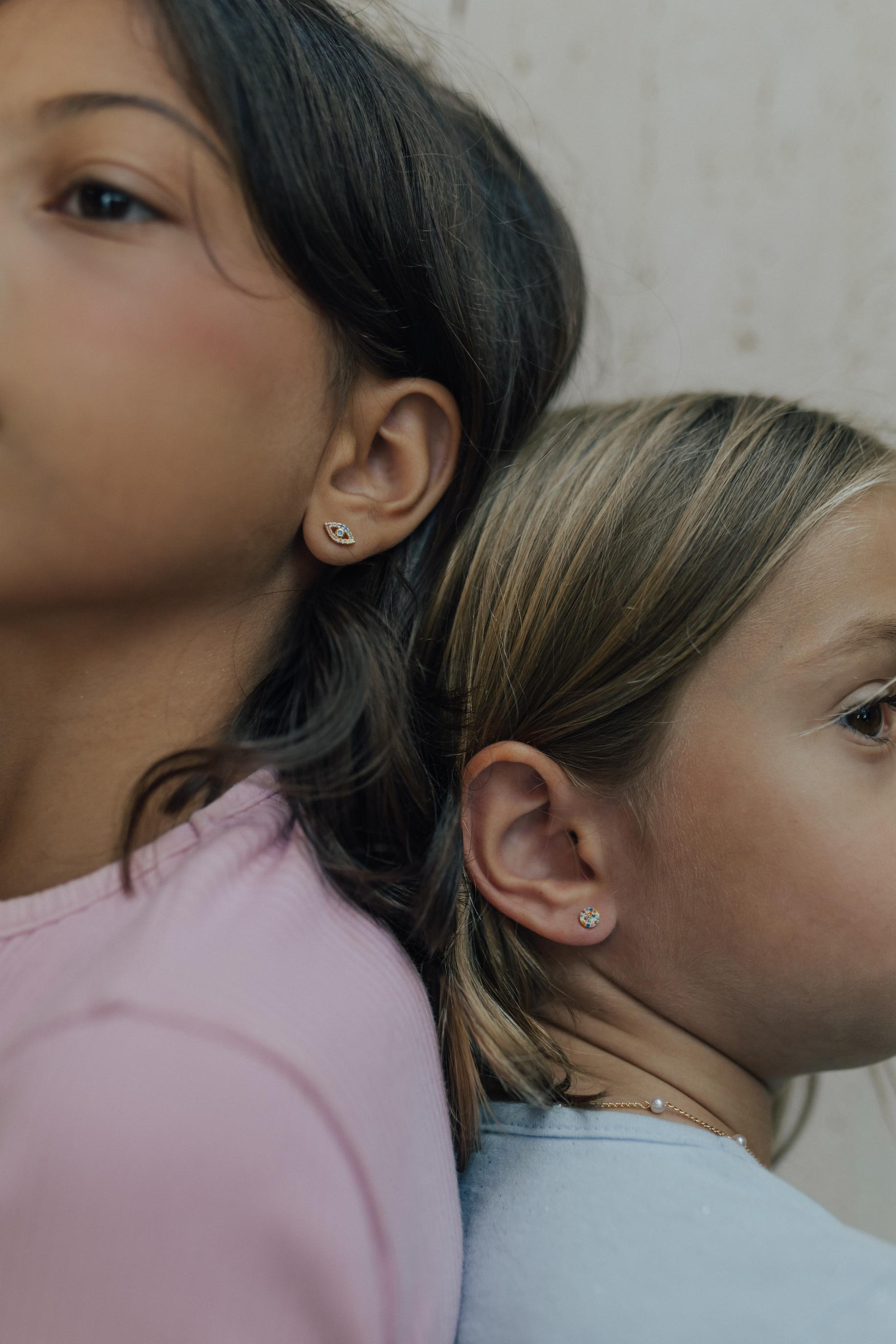 Brinco no formato de olho grego com zircônias coloridas na prata 925 e banho de ouro 18k.