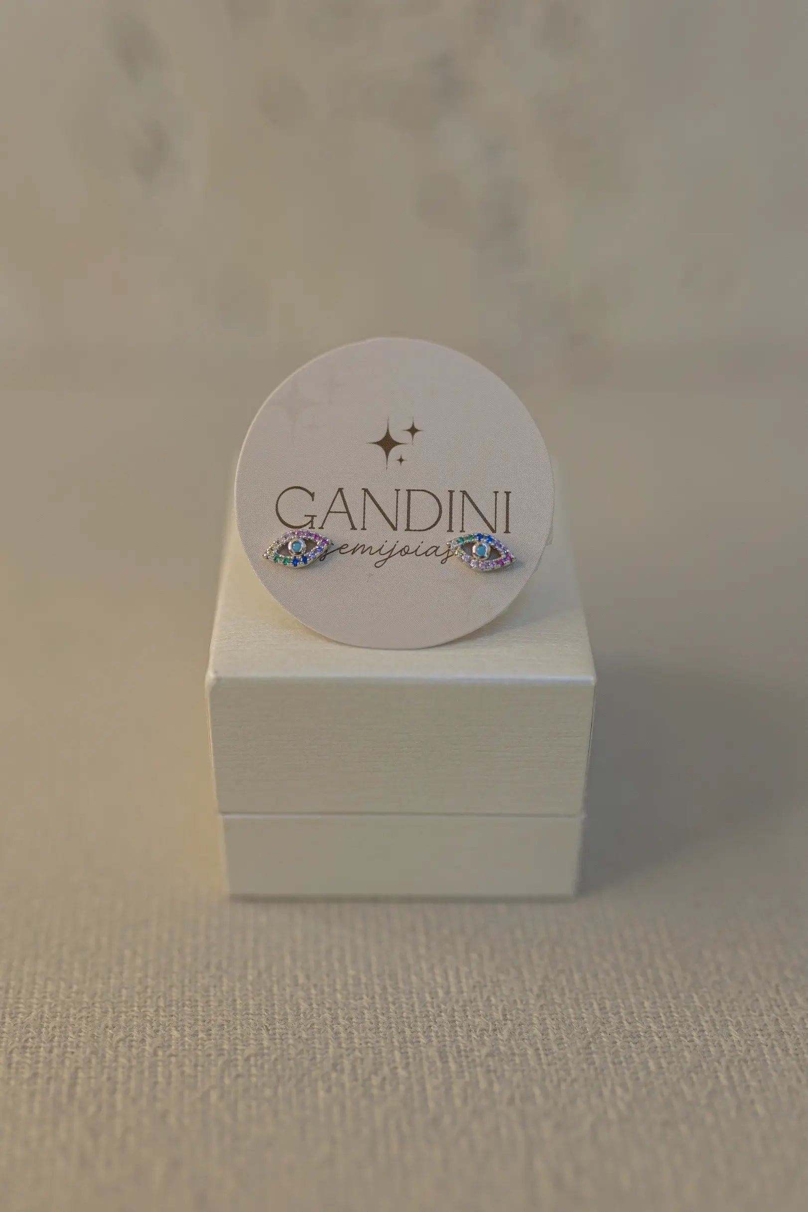 Brinco no formato de olho grego com zircônias coloridas na prata 925 e banho de ródio branco.