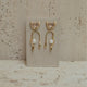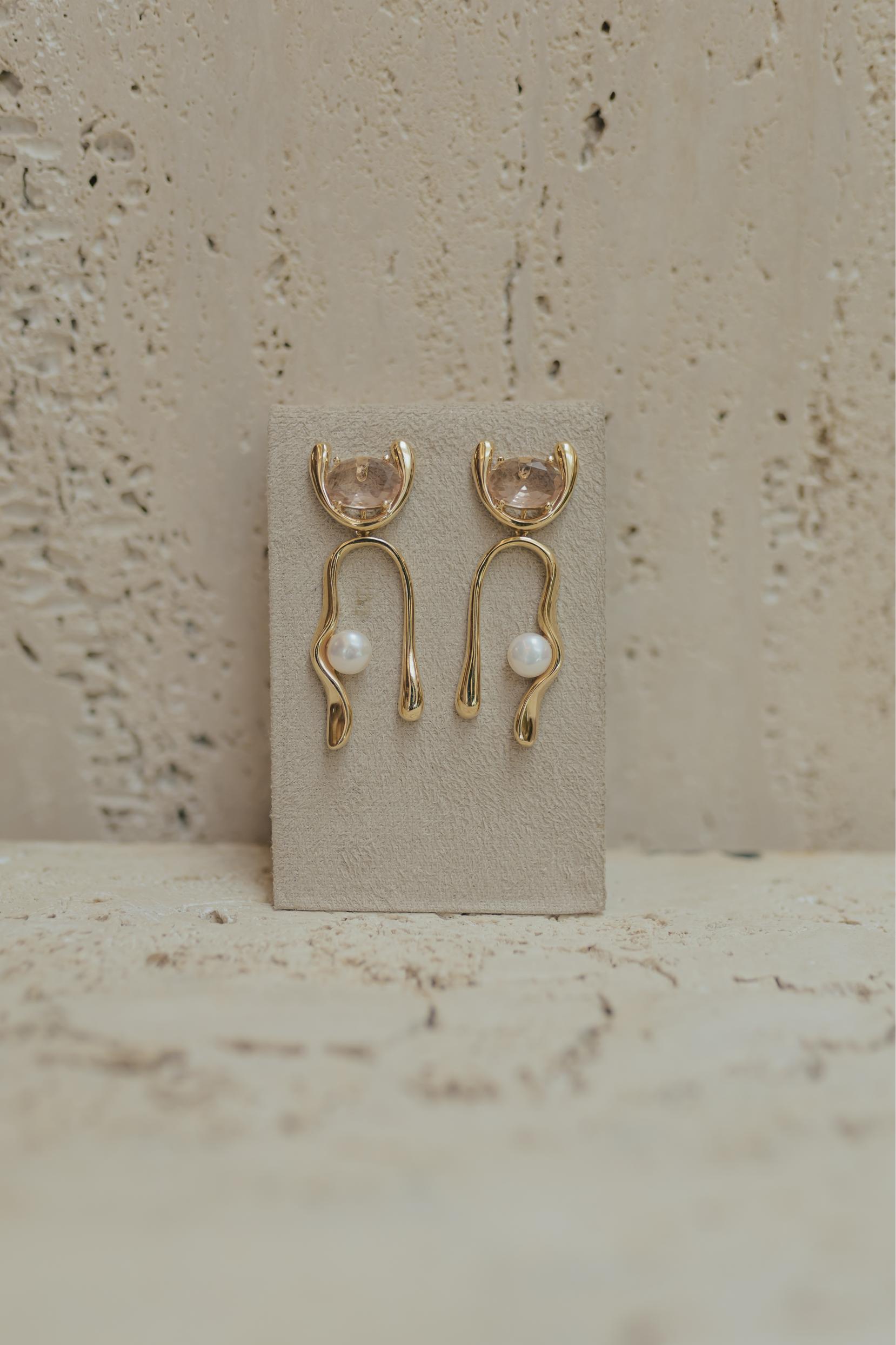 Brinco Pêndulo Meia Lua Zircônias e Pérola Dourado
