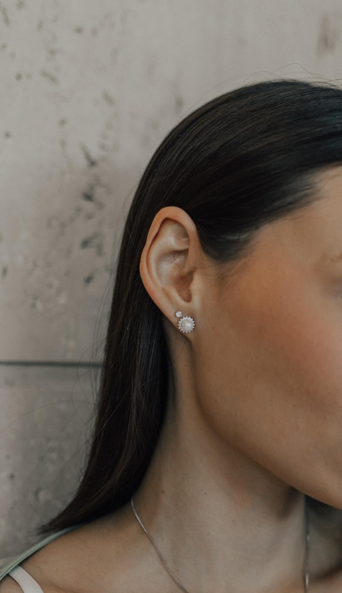 Brinco com mini pérola com borda cravejada no banho de ródio branco.