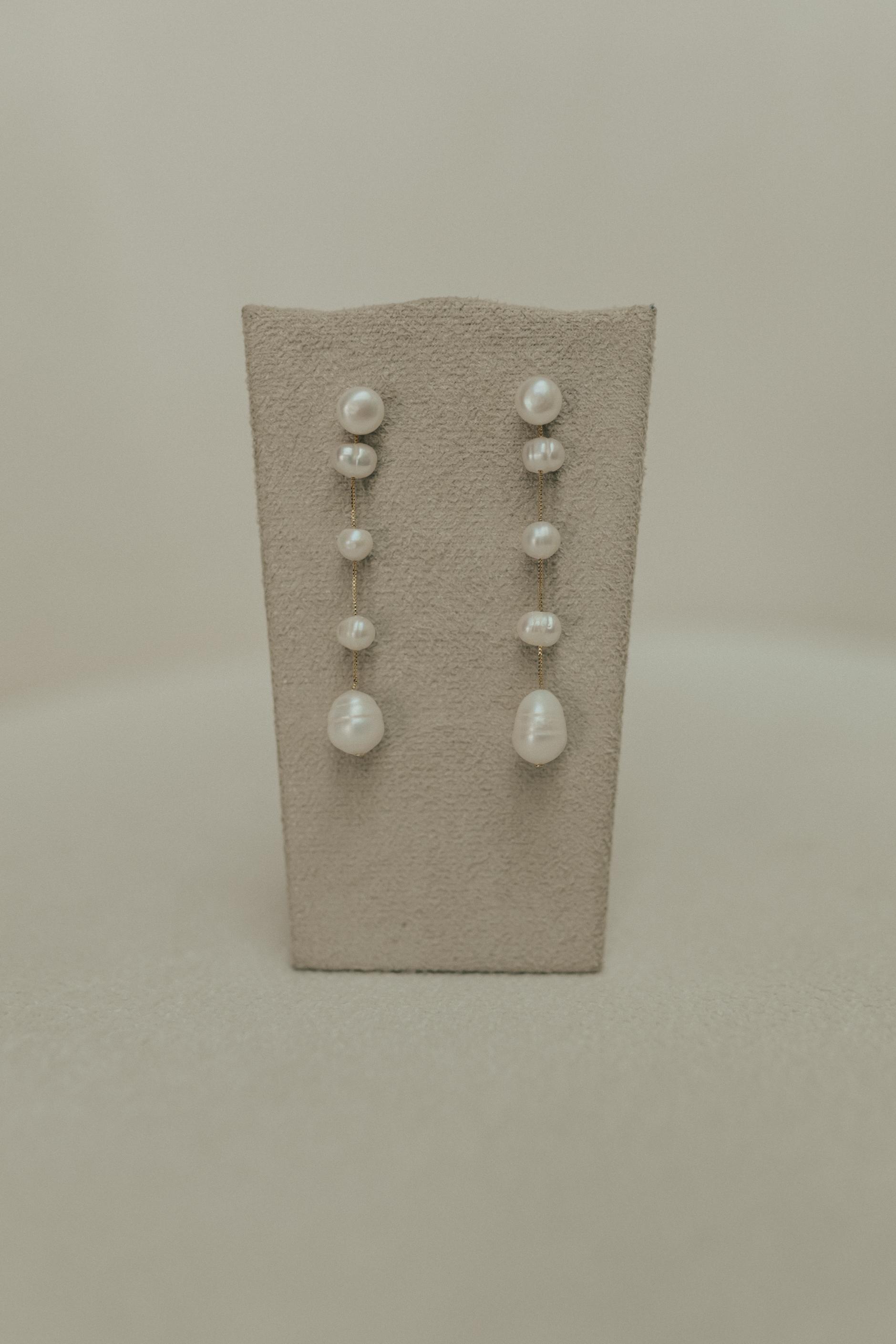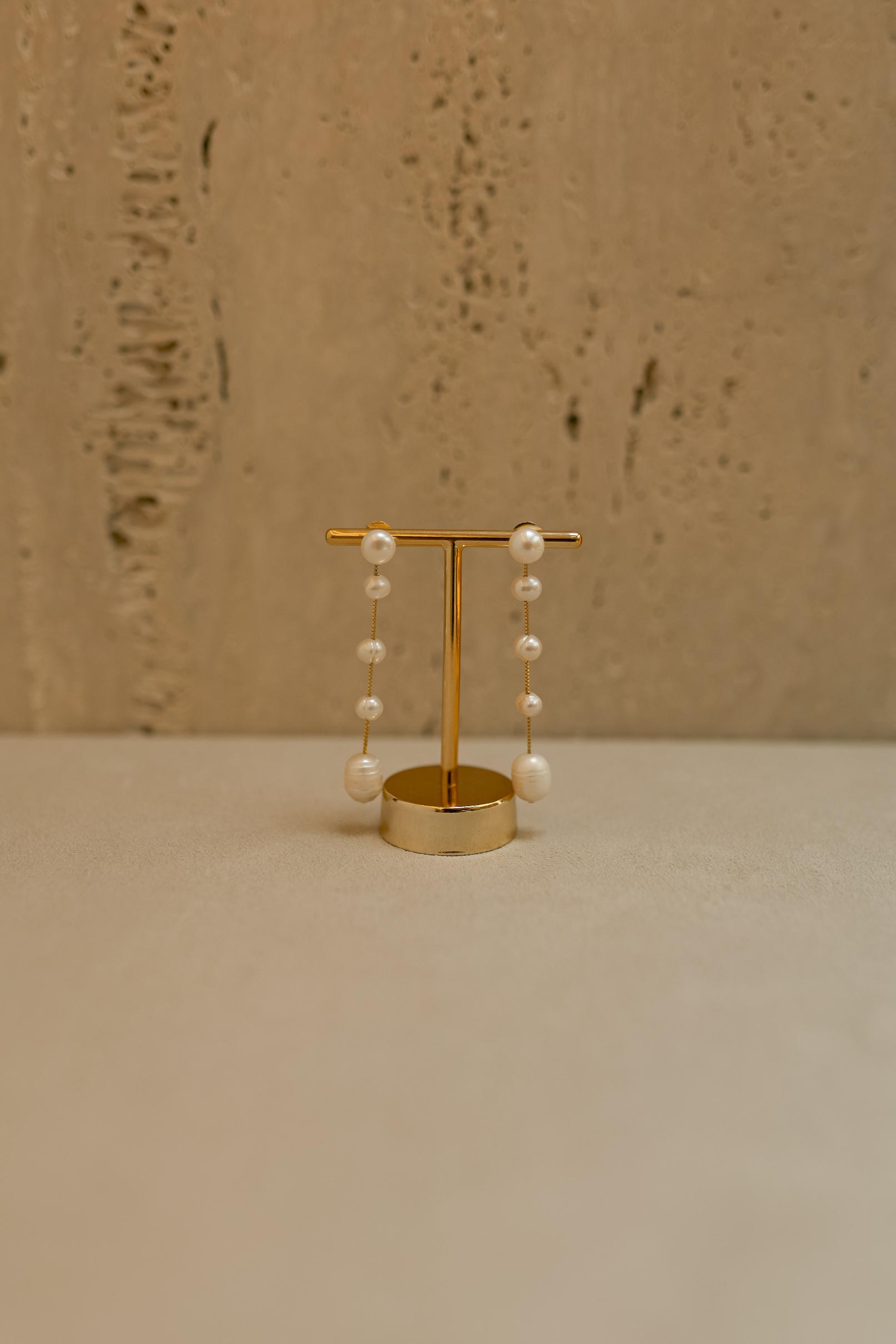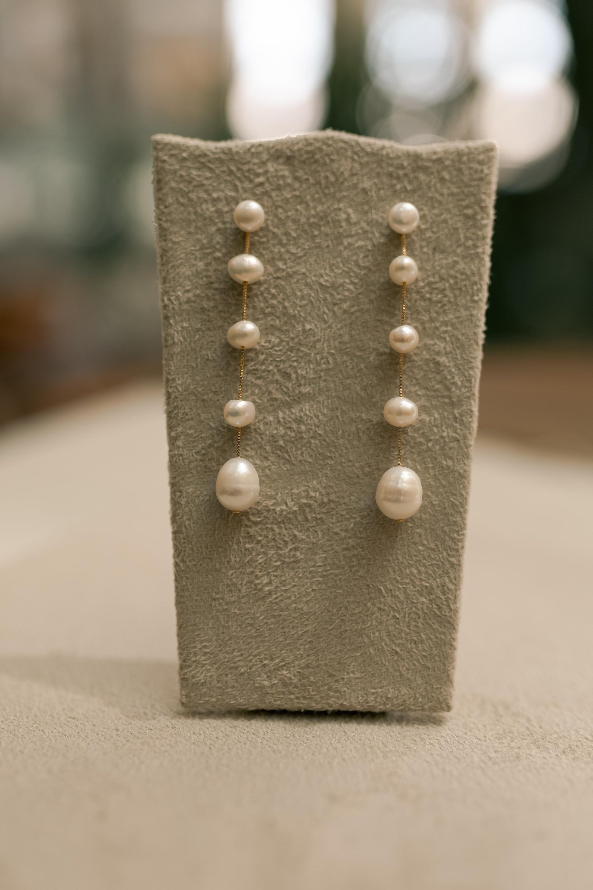 O Brinco de 5 Pérolas de água doce no estilo pêndulo é elegante e sofisticado, perfeito para complementar looks de festa e eventos especiais.