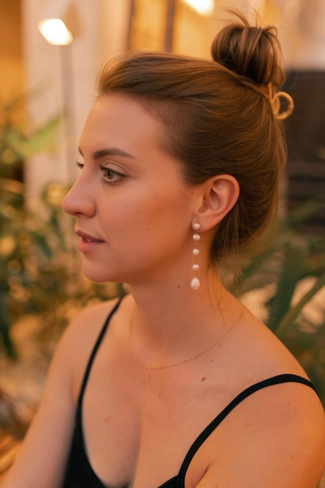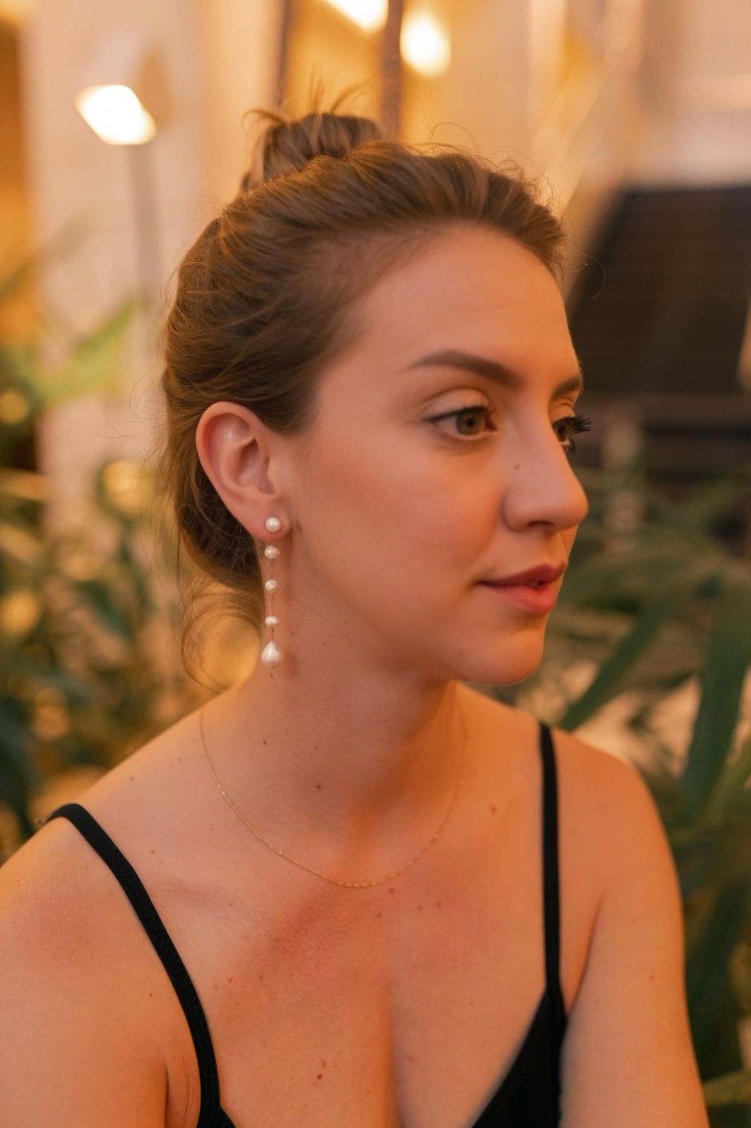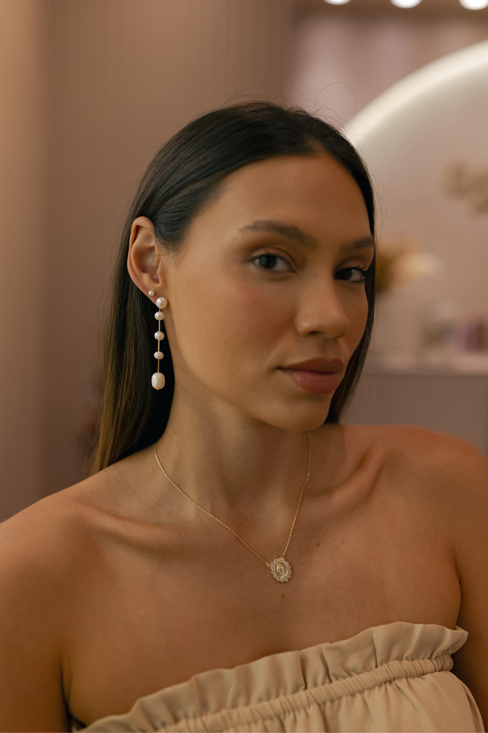 É possível usar o brinco de duas formas: só o brinquinho de pérolas de cima, sem a cascata, ou ele longo com a cascata super elegante, super versátil.