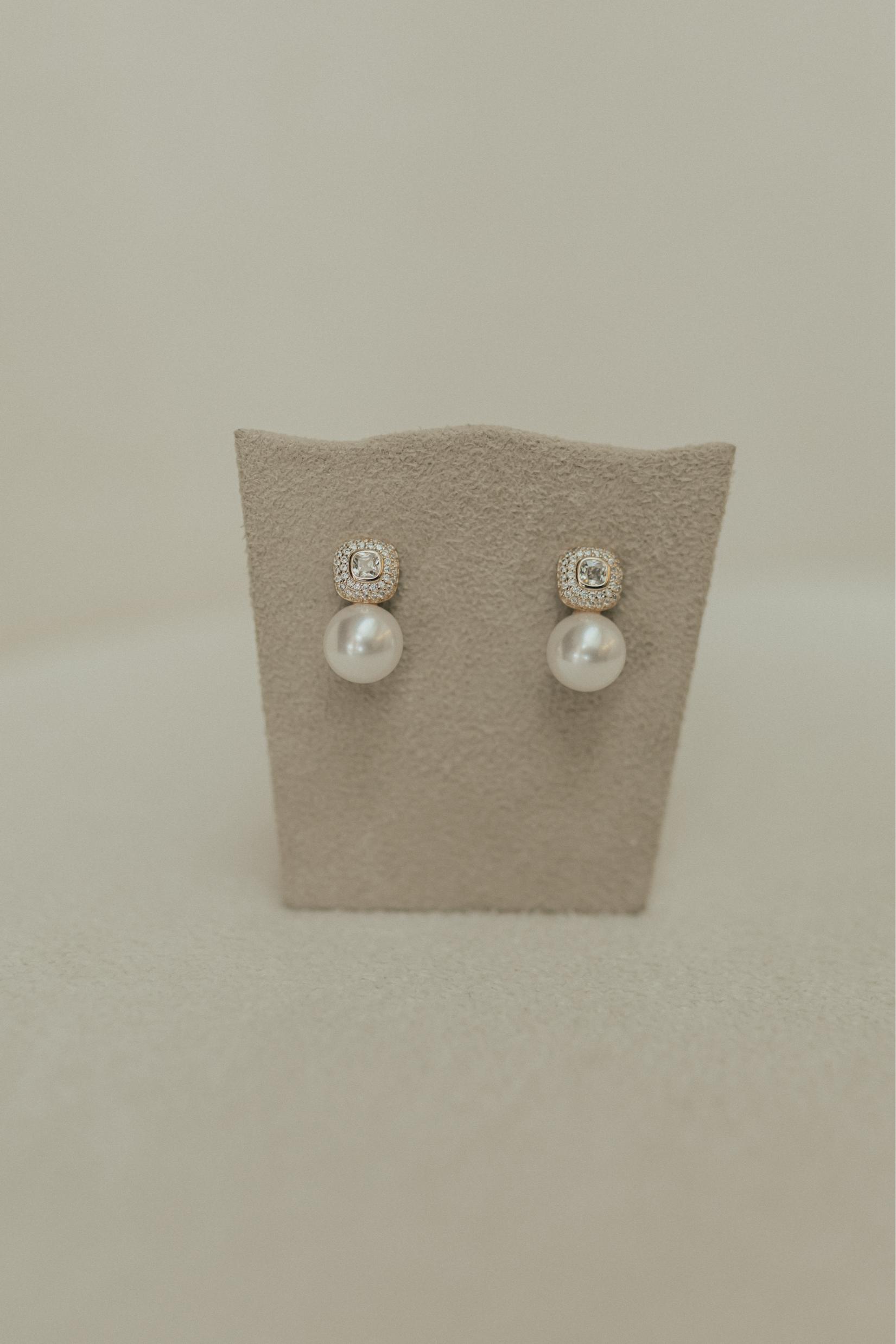 Brinco clássico com zircônias na cor cristal e banho de ouro 18k com destaque para pérola shell.