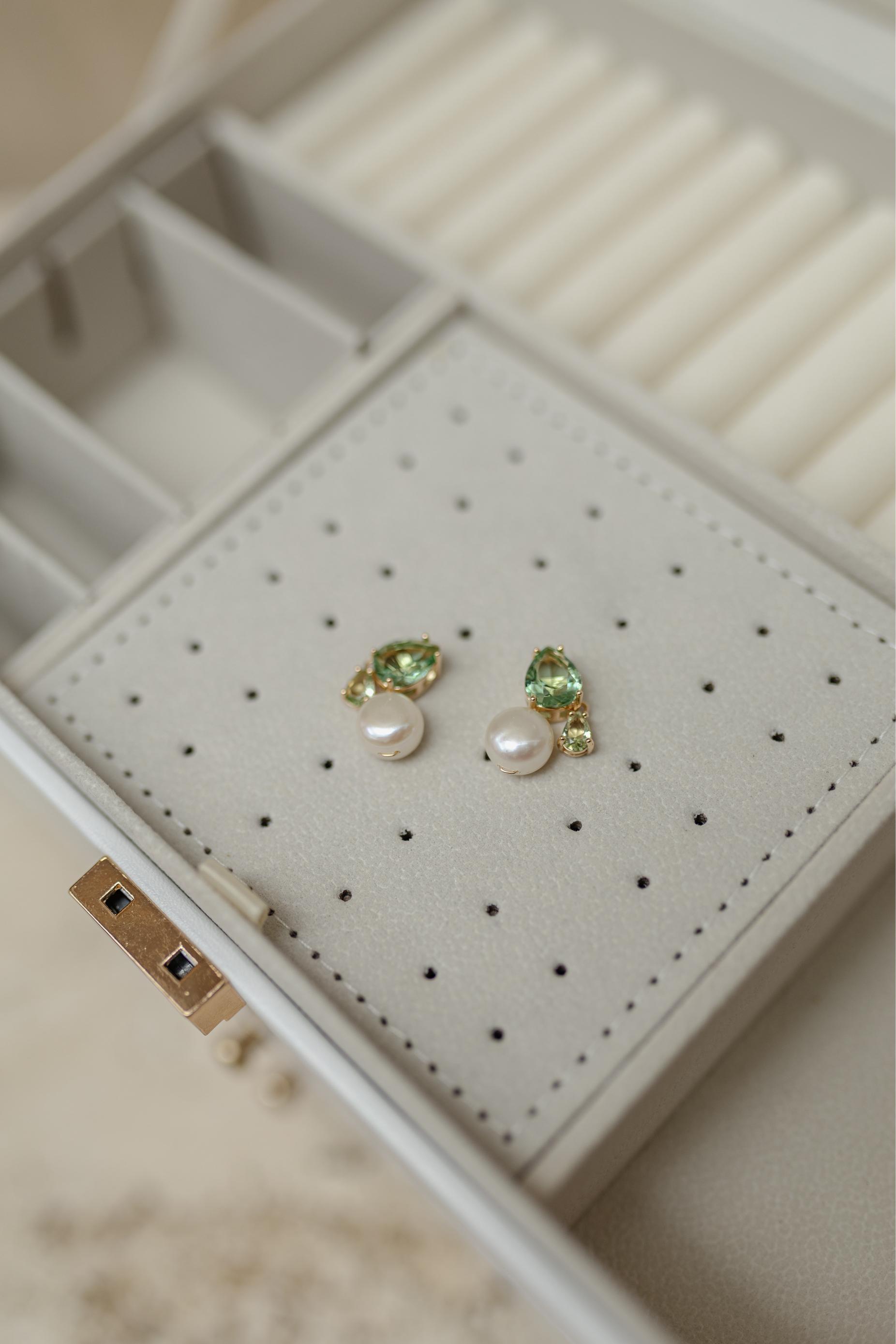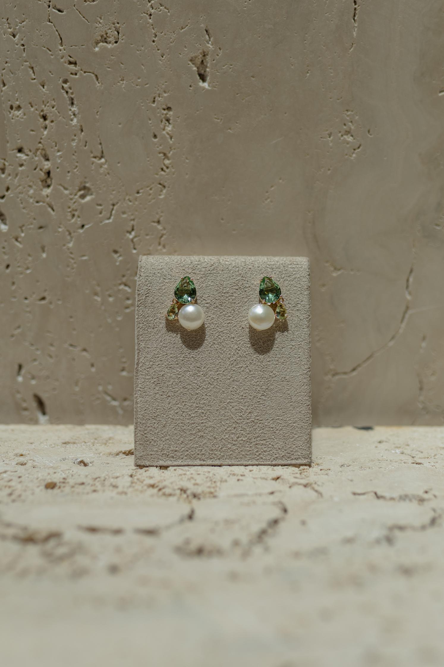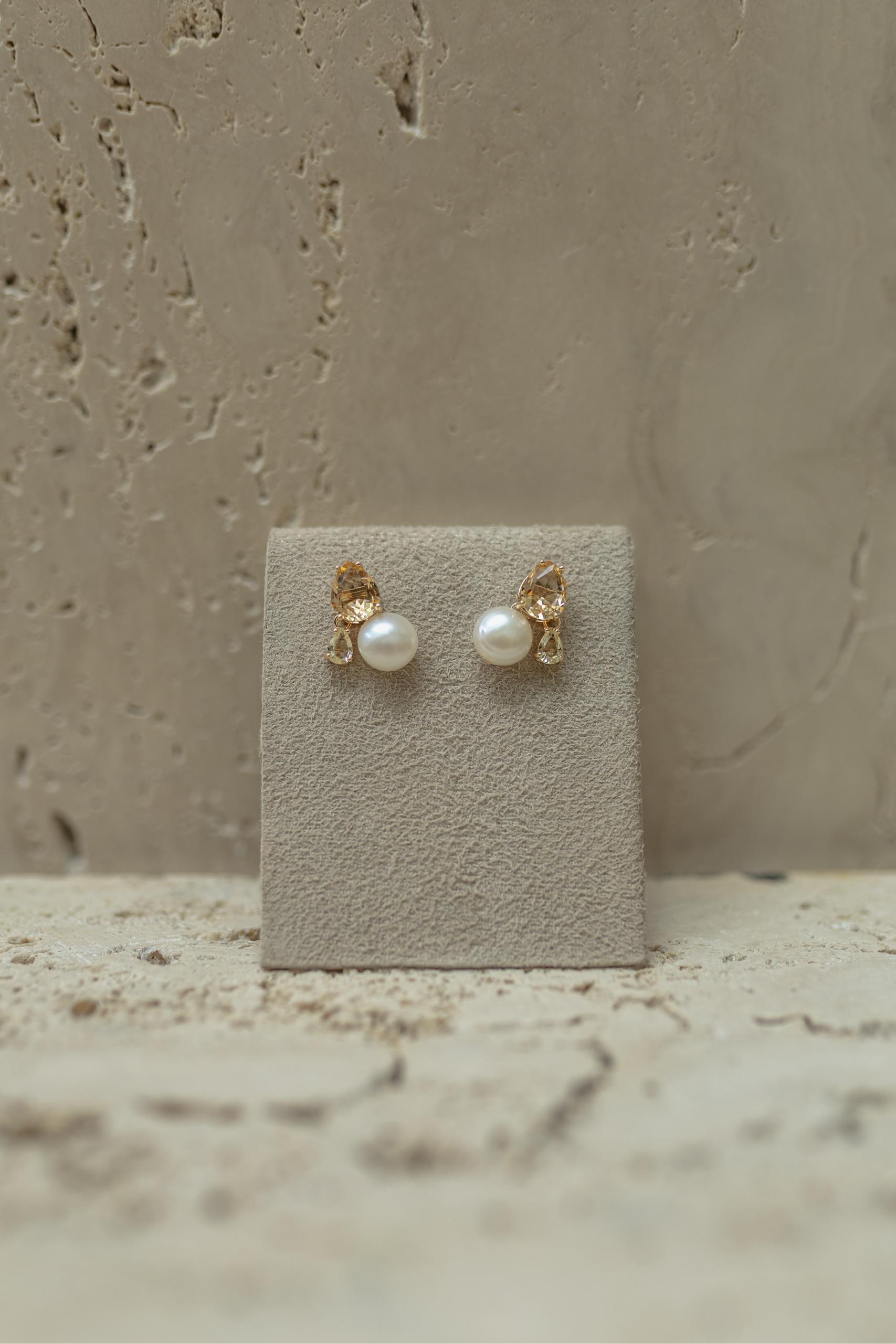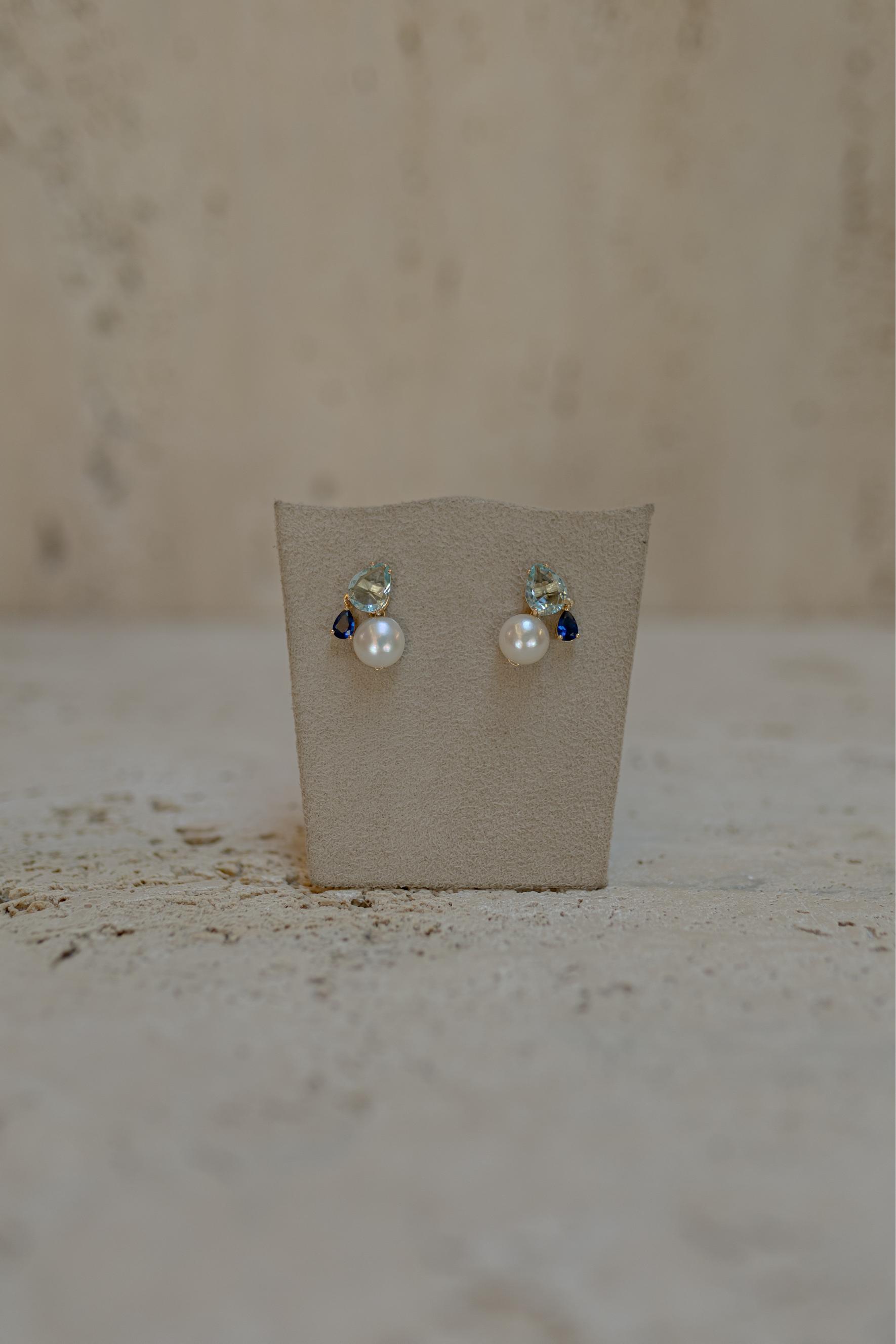 Brinco de gota com detalhe de pérola e quartzo azul no banho de ouro 18k.