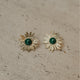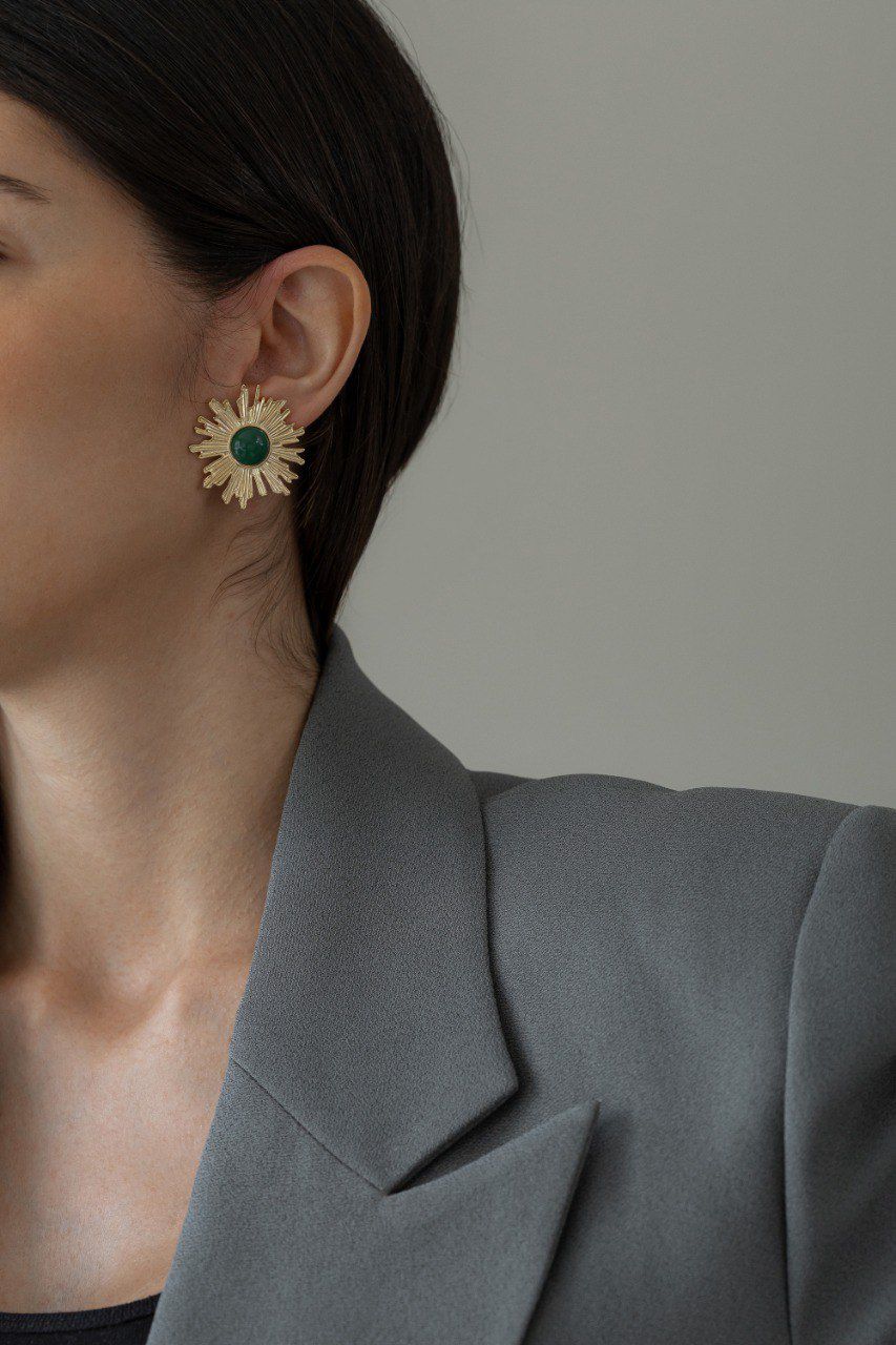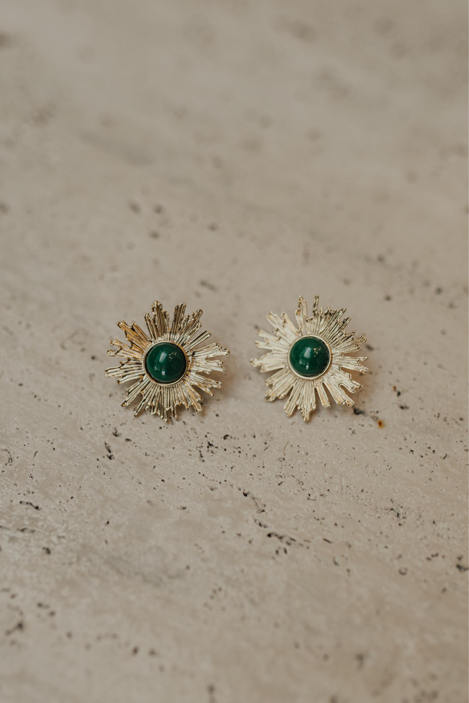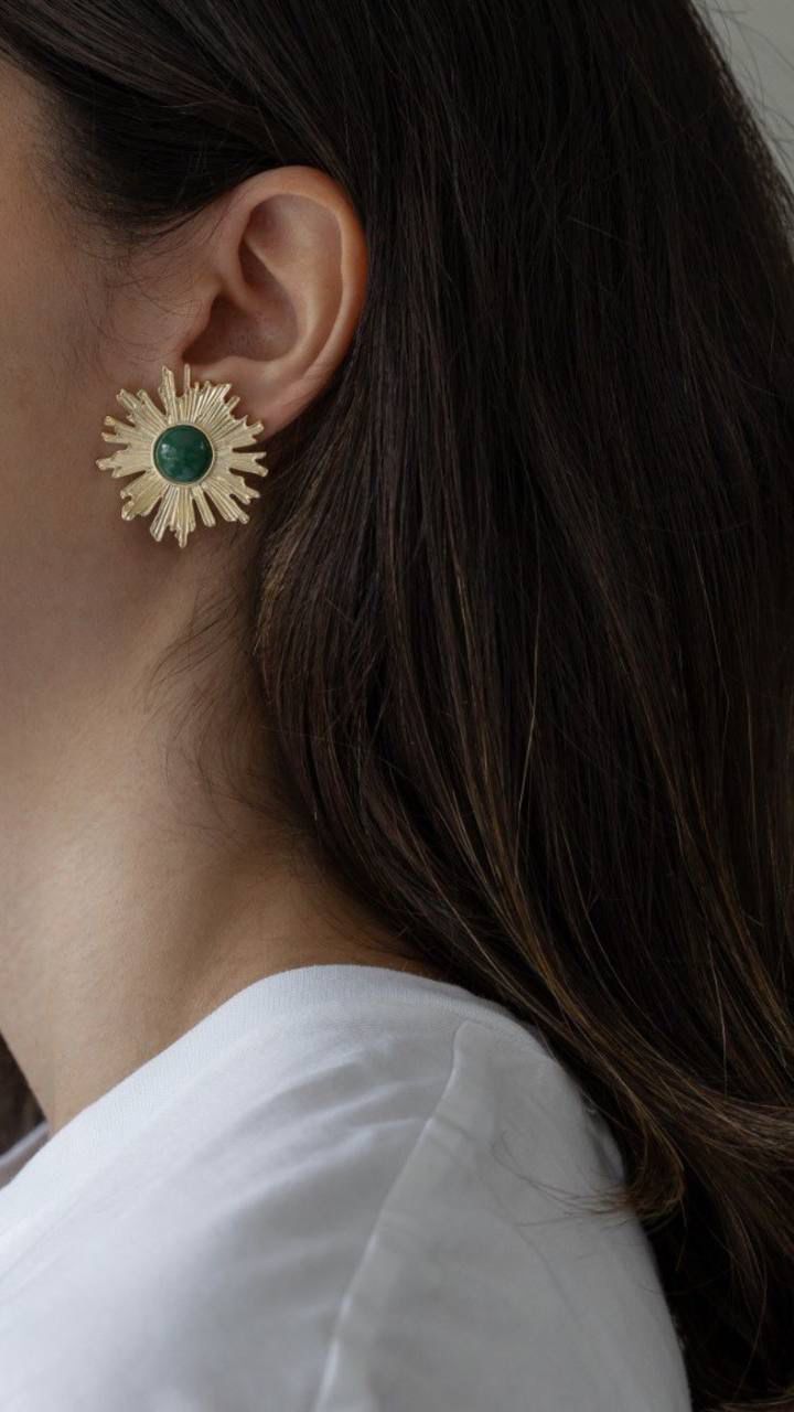 Brinco com raios de sol no banho de ouro 18k com resina acrílica central na cor verde bandeira.