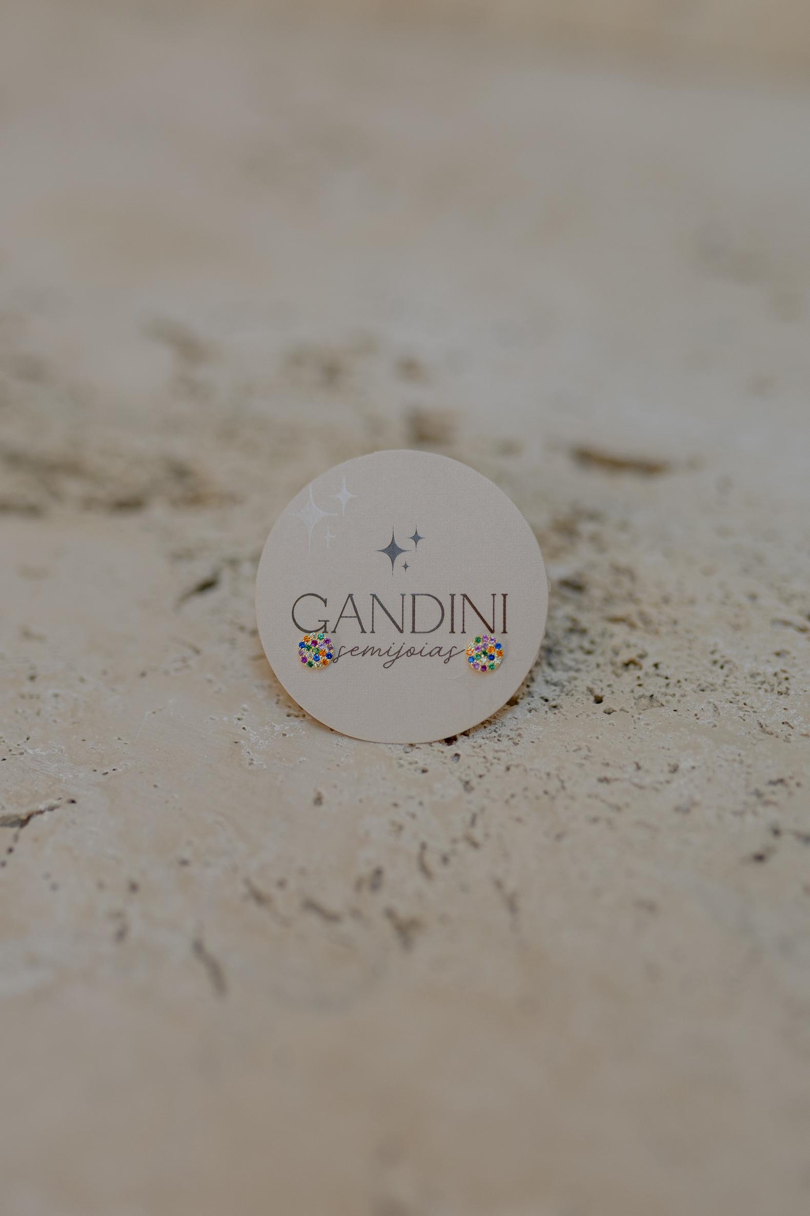 Brinco redondo cravejado com microzircônias coloridas na prata 925 e banho de ouro 18k.