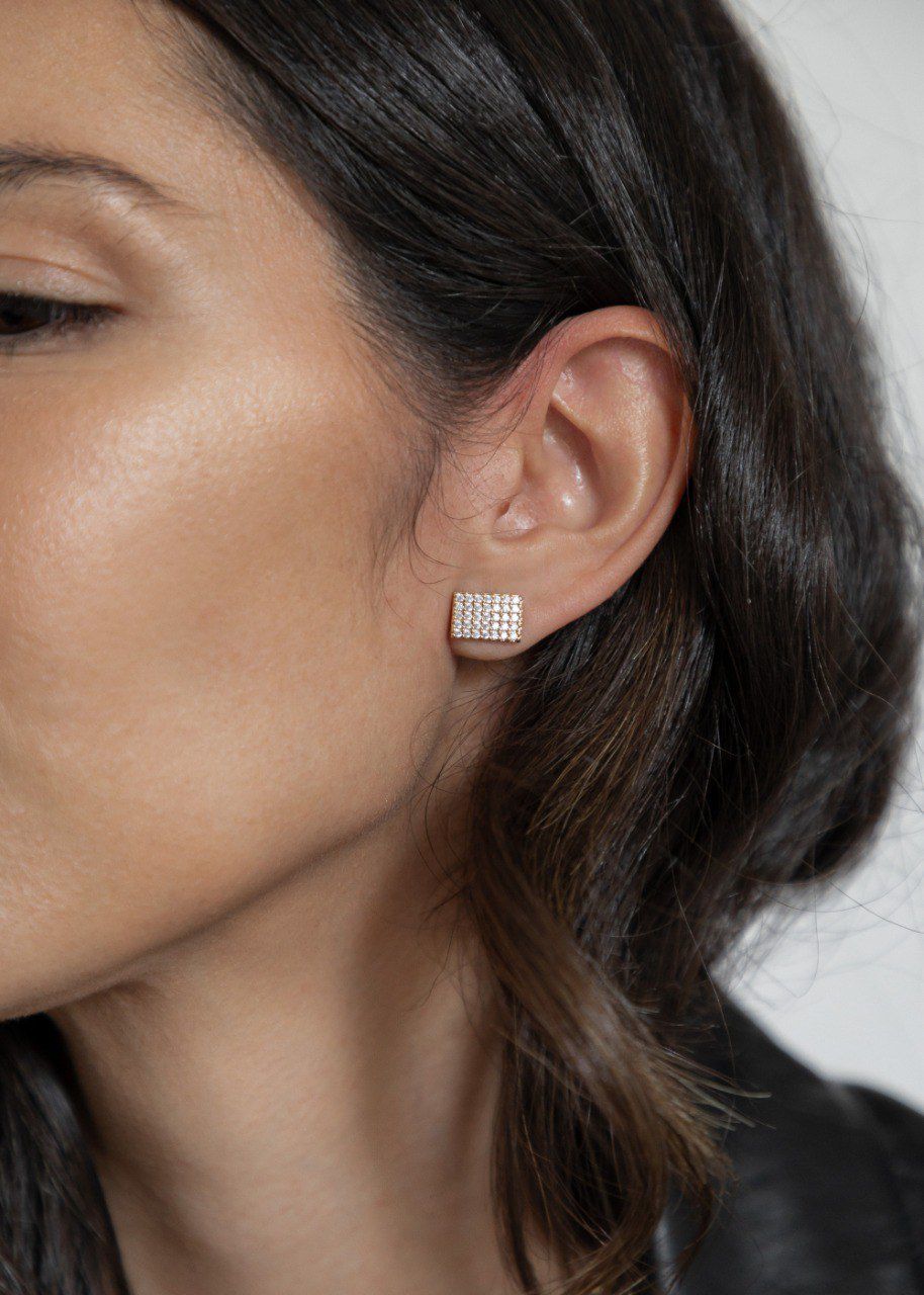 Brinco retangular todo cravejado com microzircônias no banho de Dourado 18k.