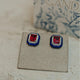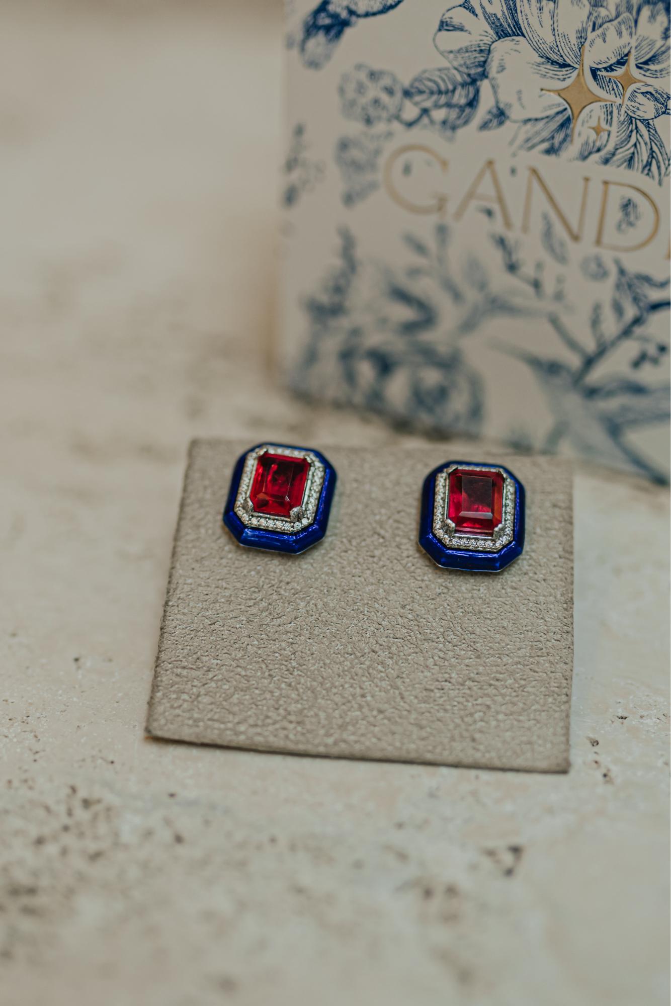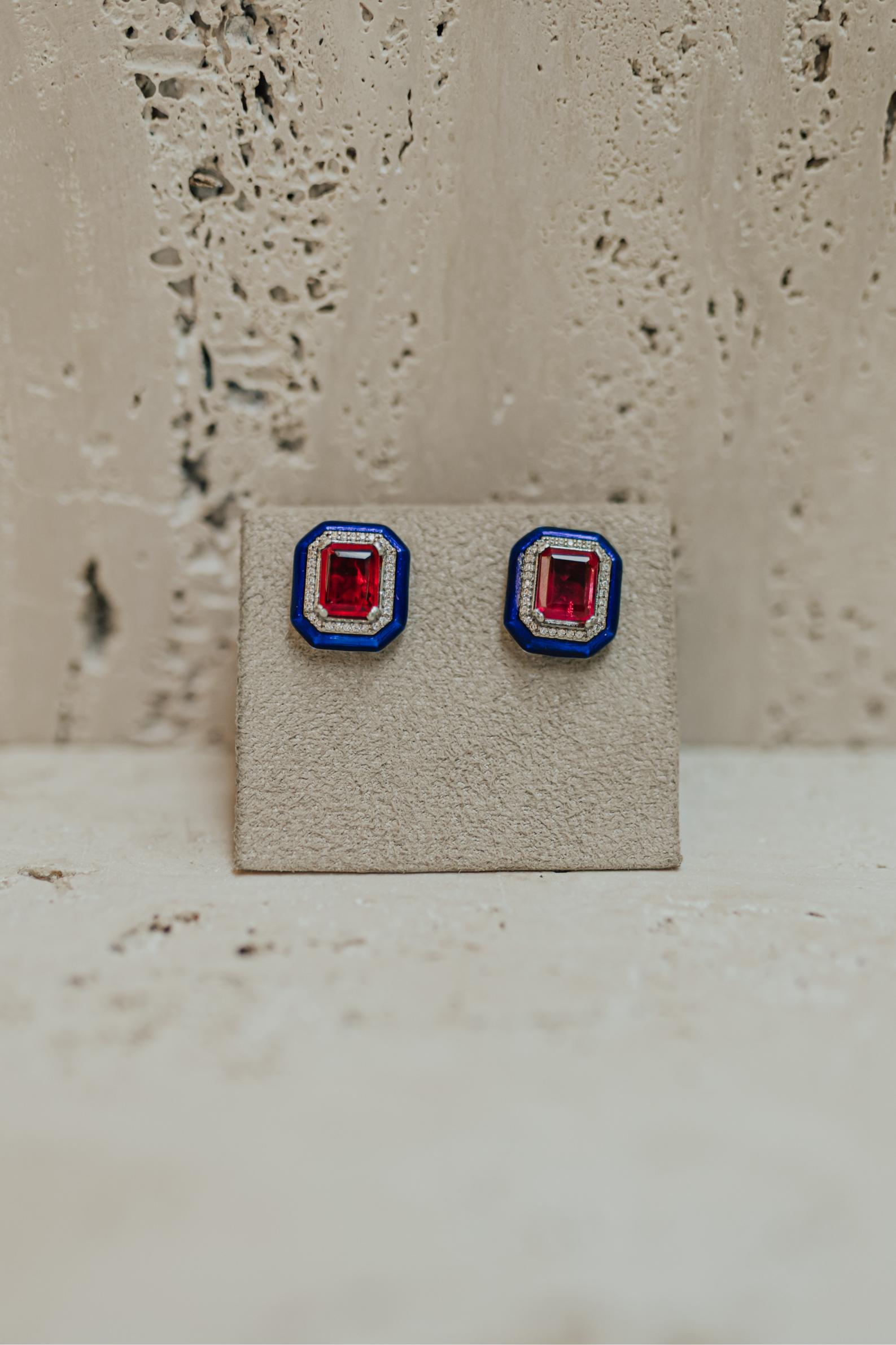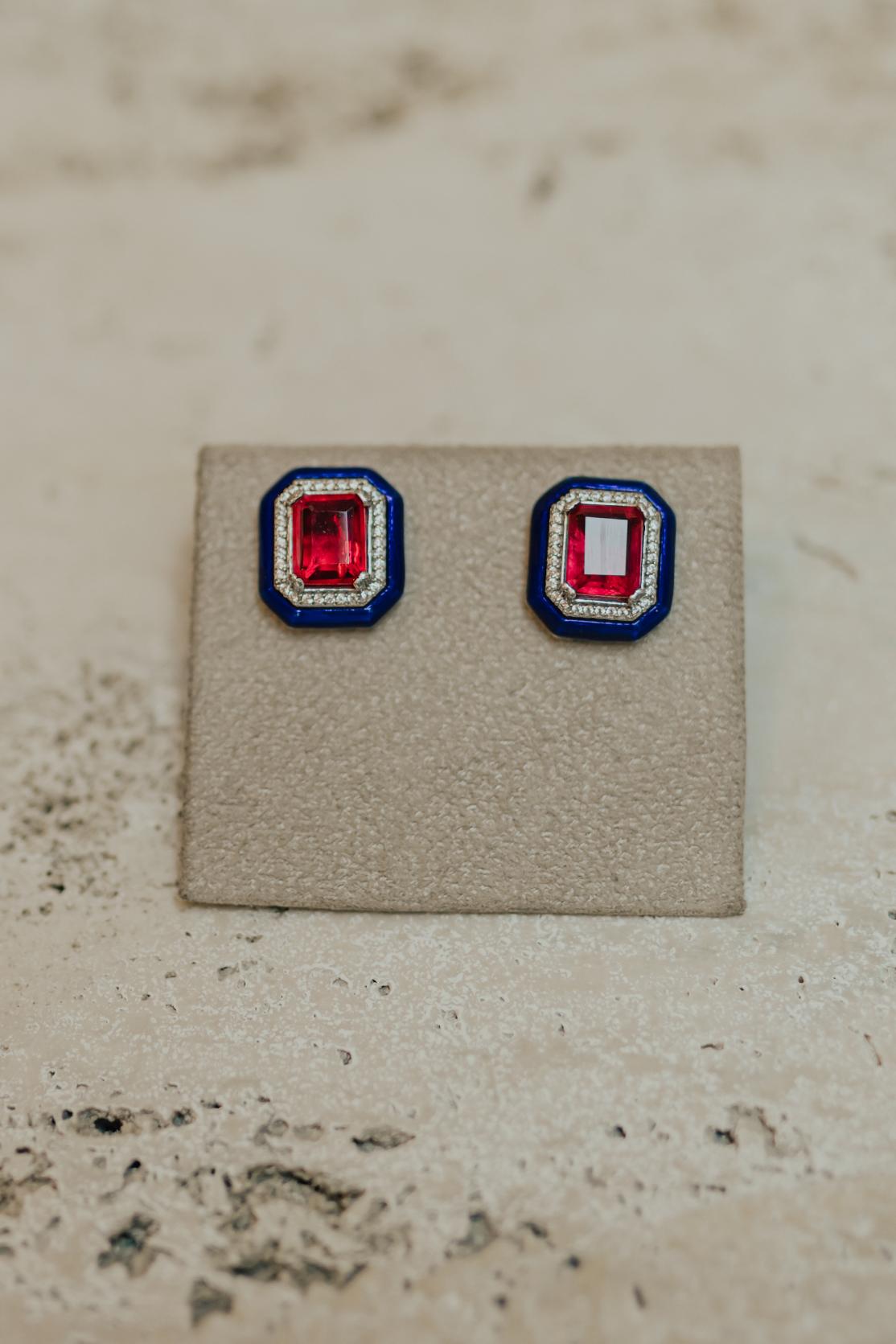 Brinco retangular com pedra rubi borda cravejada de zircônias na cor cristal e esmaltação azul marinho no banho de ródio branco.