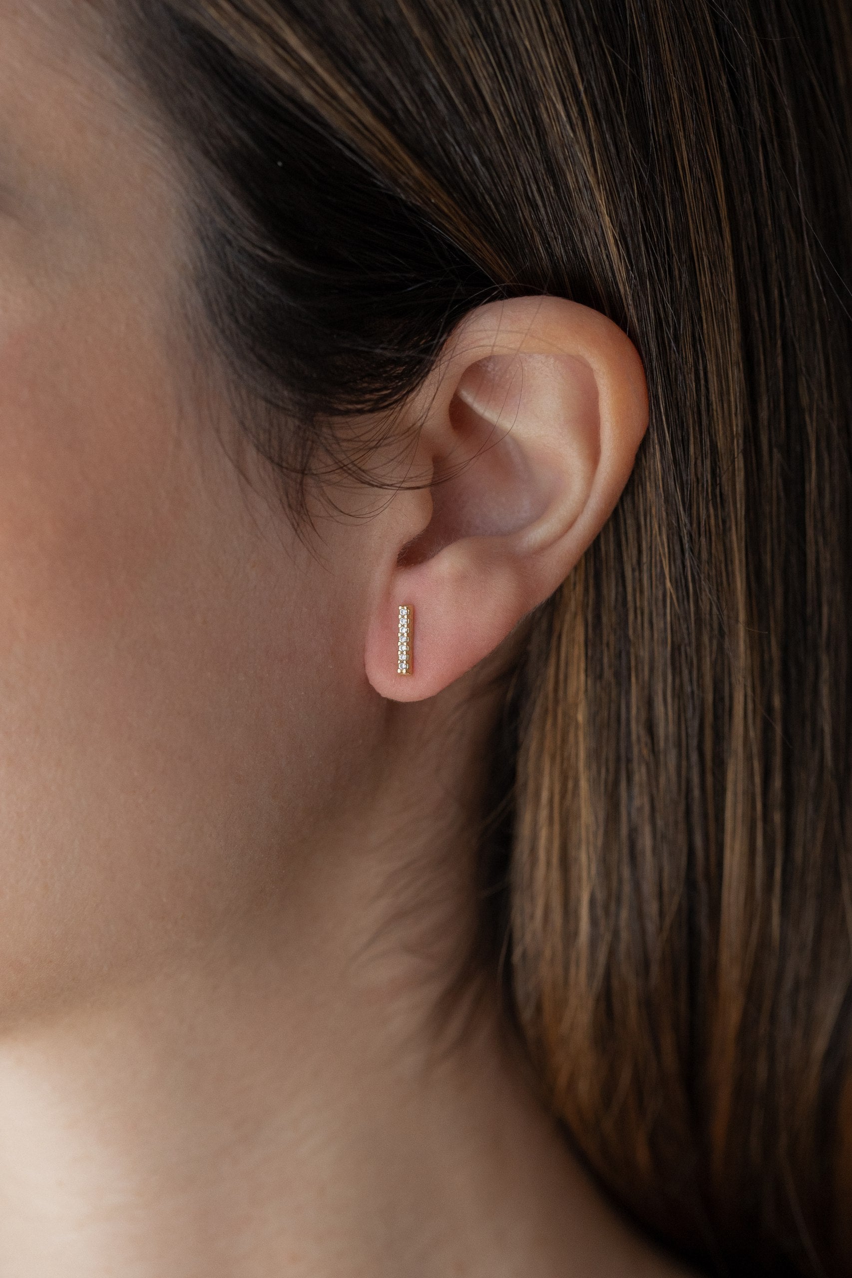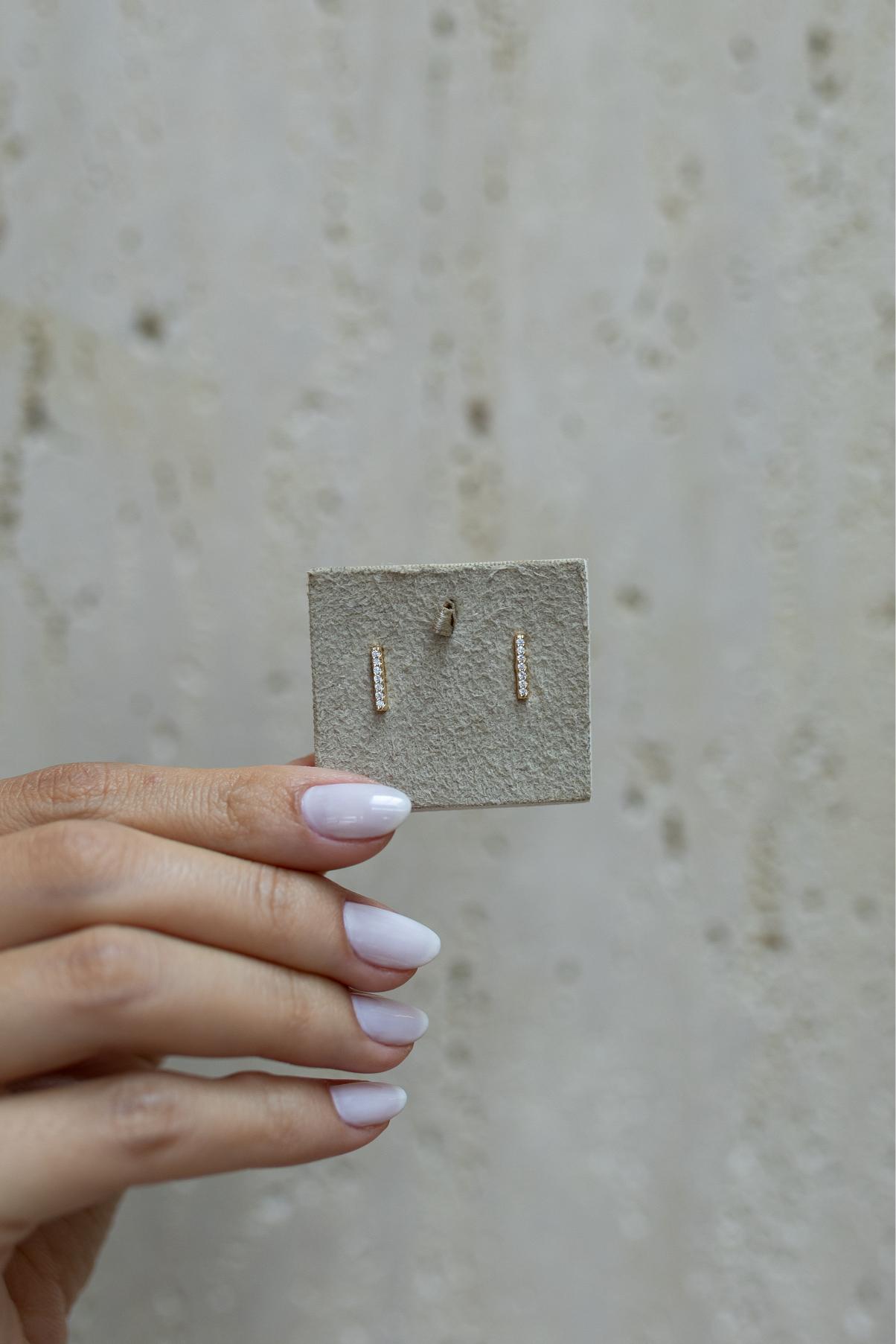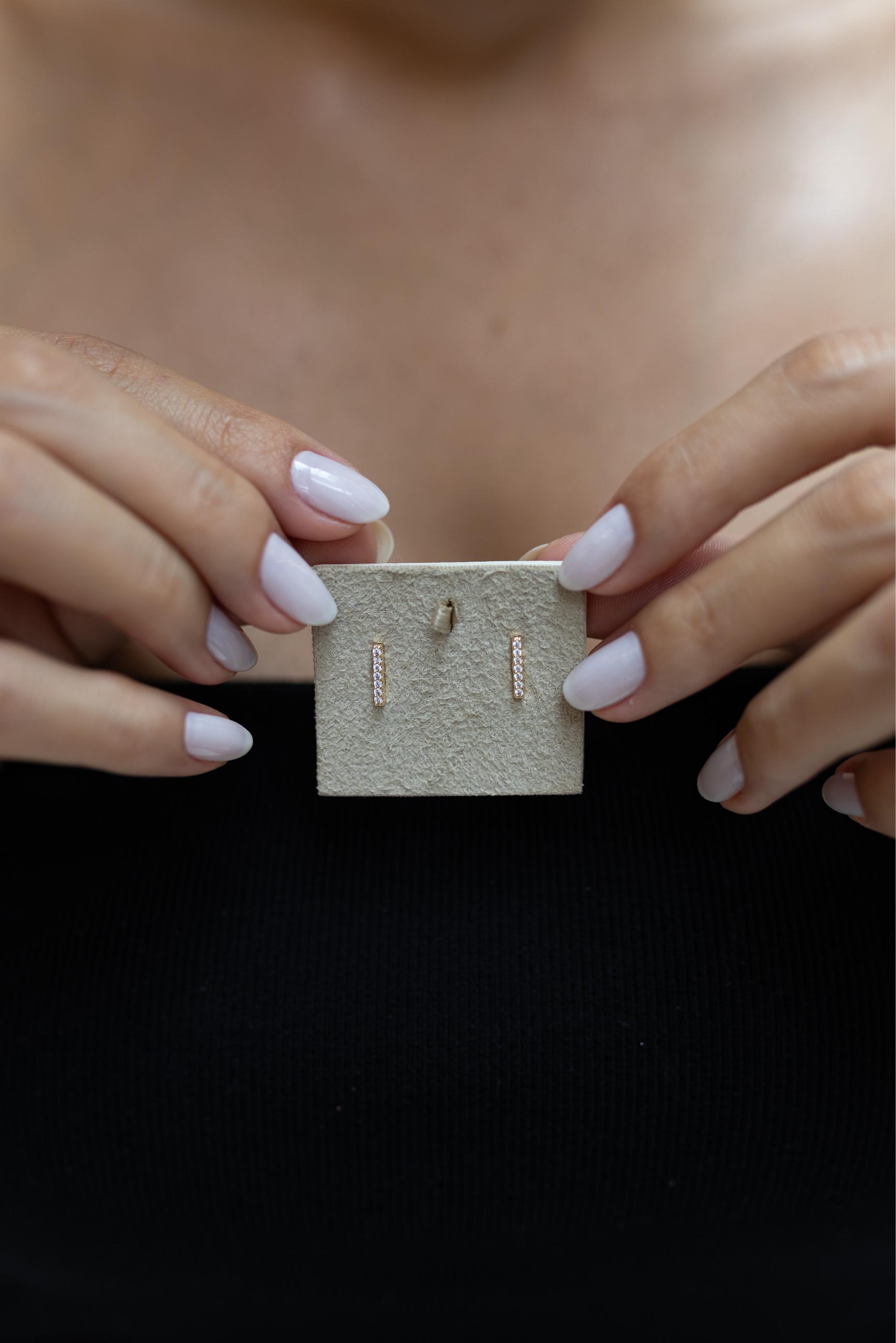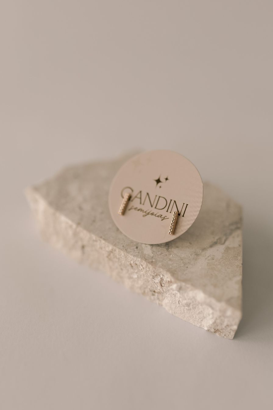 Brinco reto com cravação de micro zircônias na cor cristal. Banhados a ouro 18k ou ródio branco.