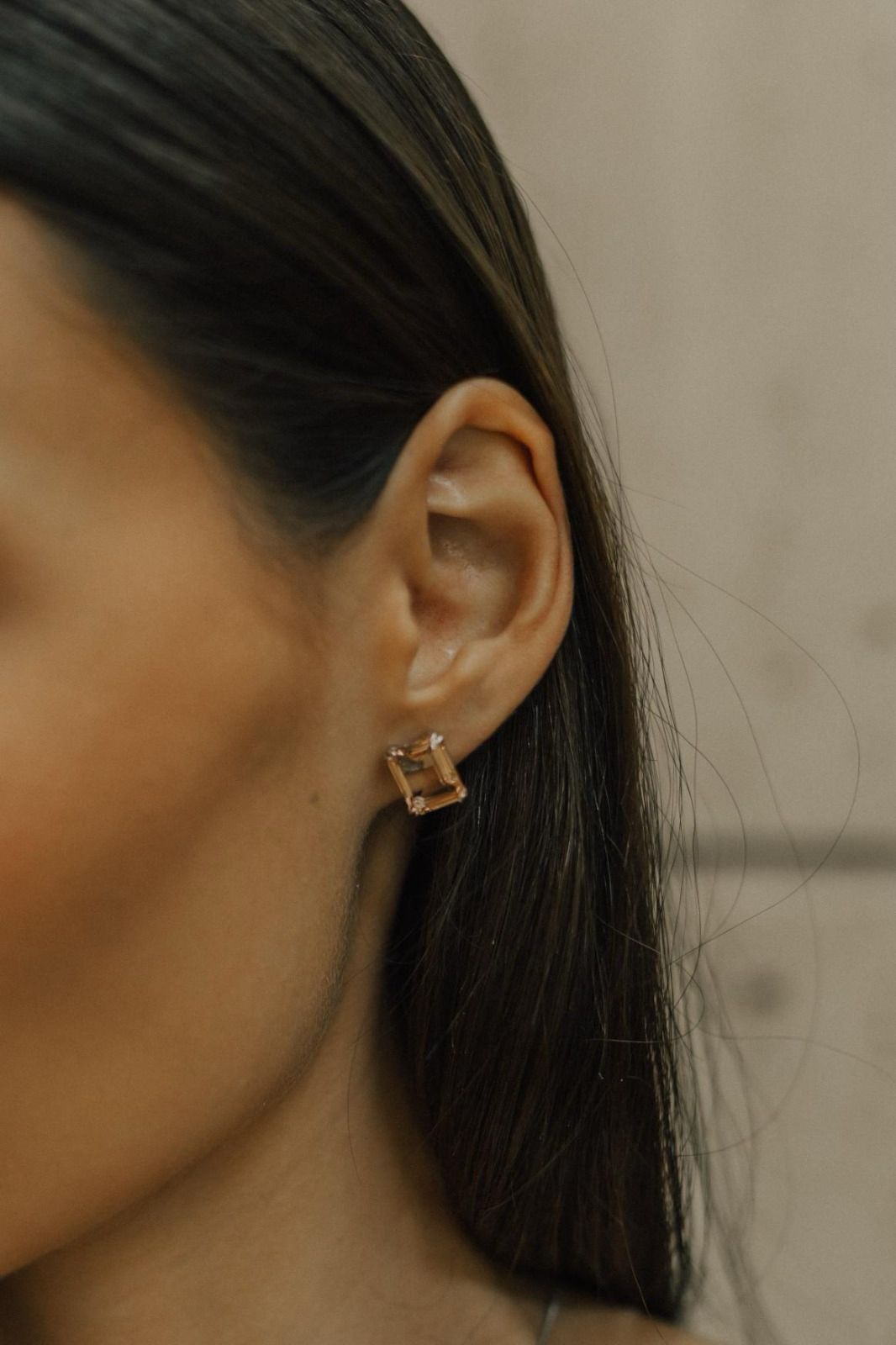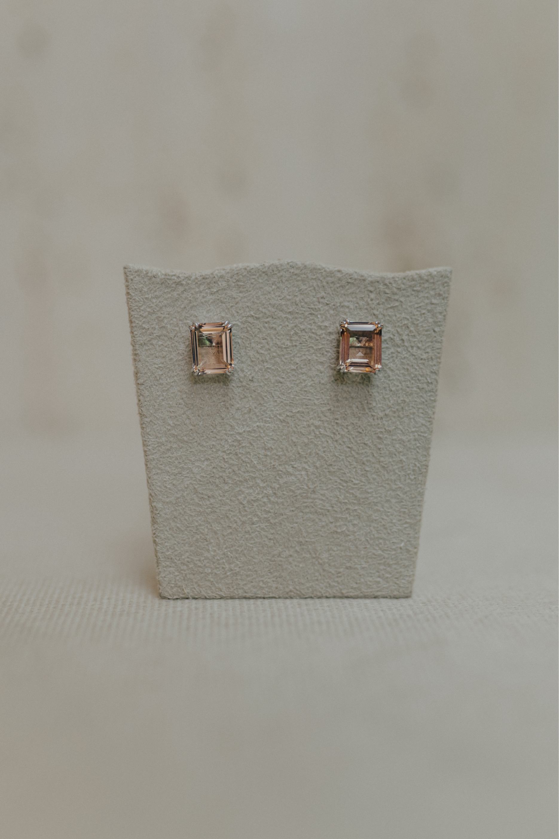 Brinco solitário retangular com pedra morganita no banho de ródio branco.