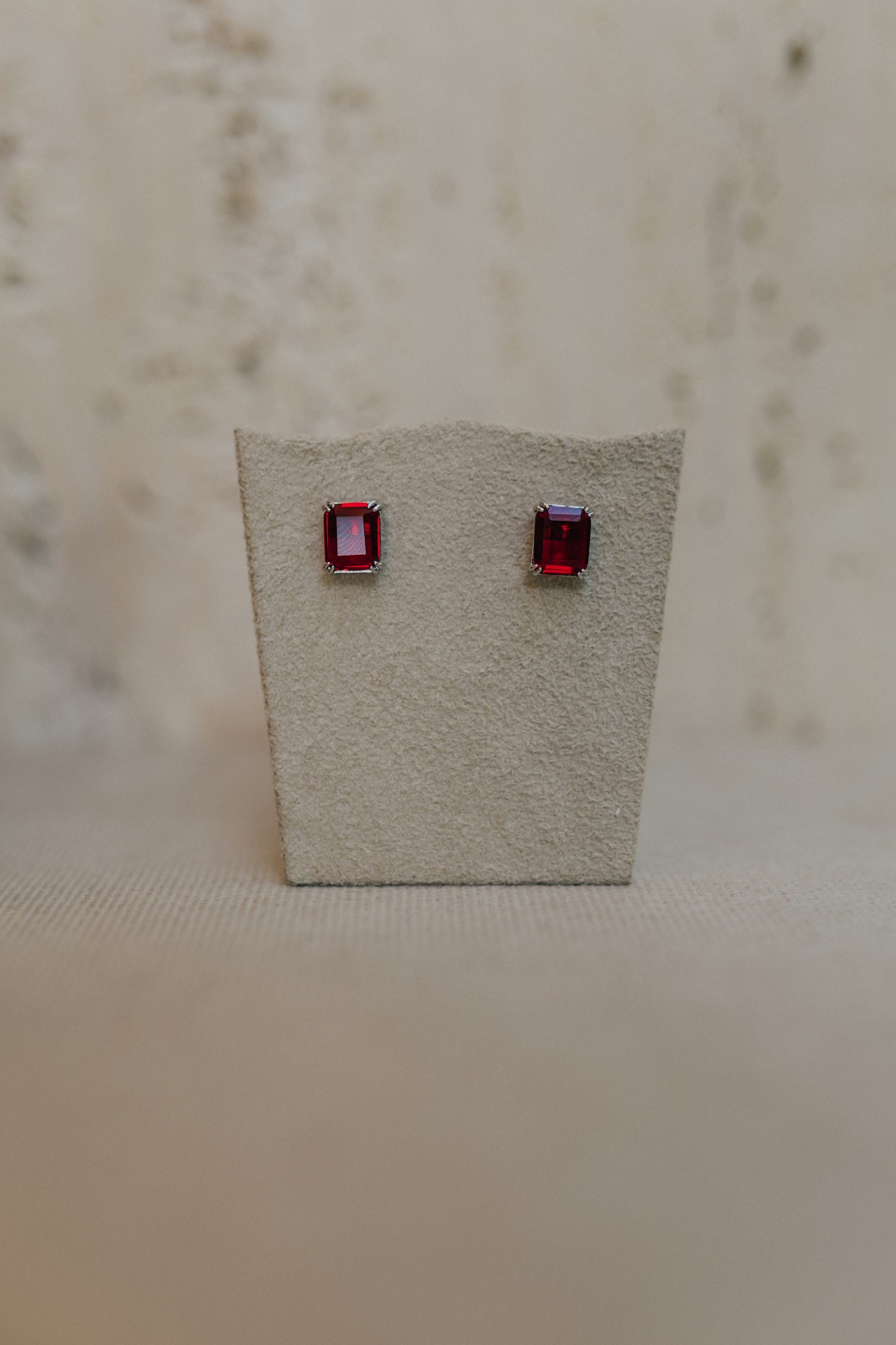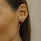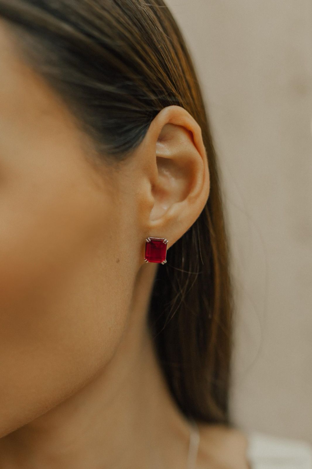 Brinco solitário retangular com pedra rúbi no banho de ródio branco.