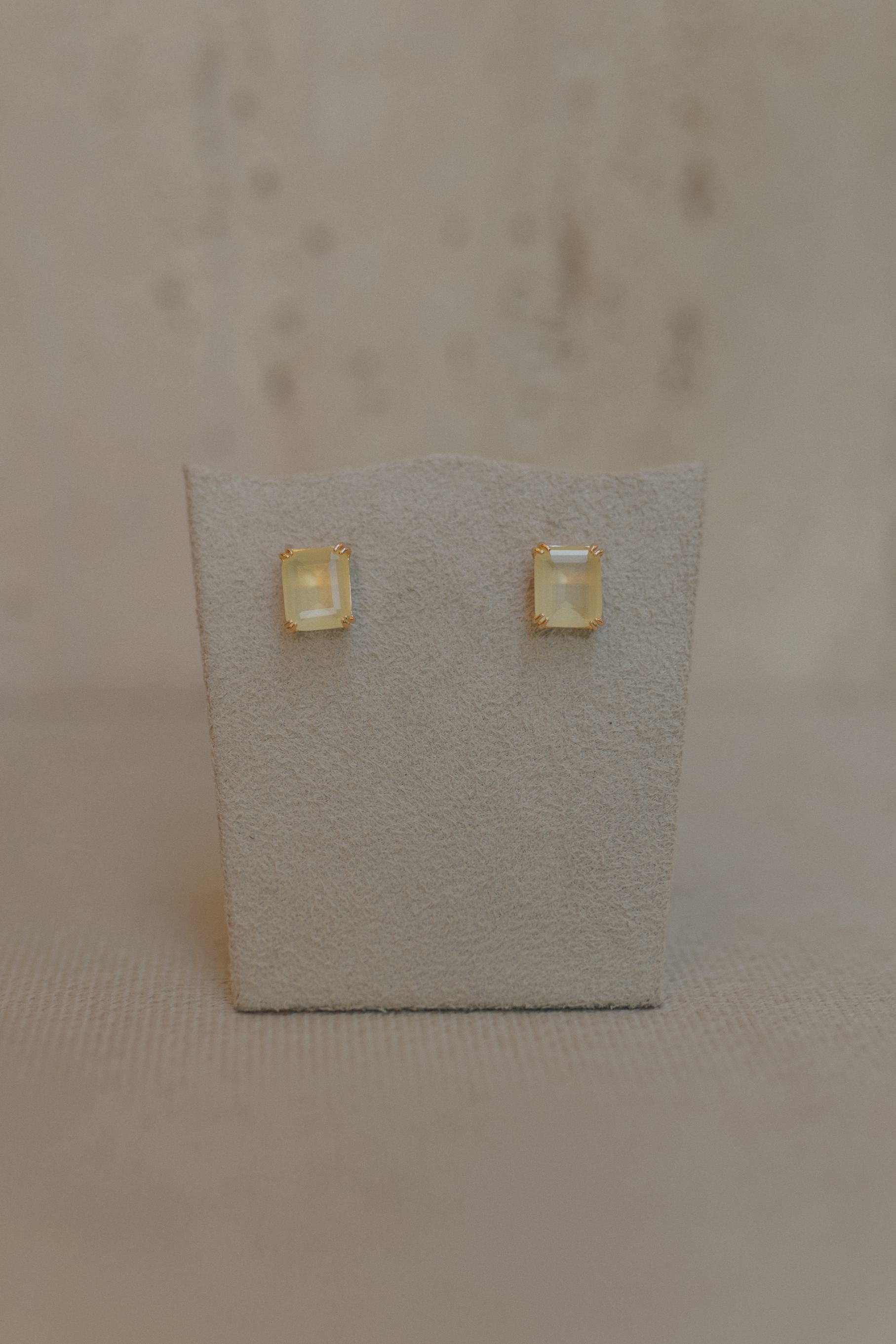 Brinco solitário retangular com pedra safira amarela no banho de ouro18k.