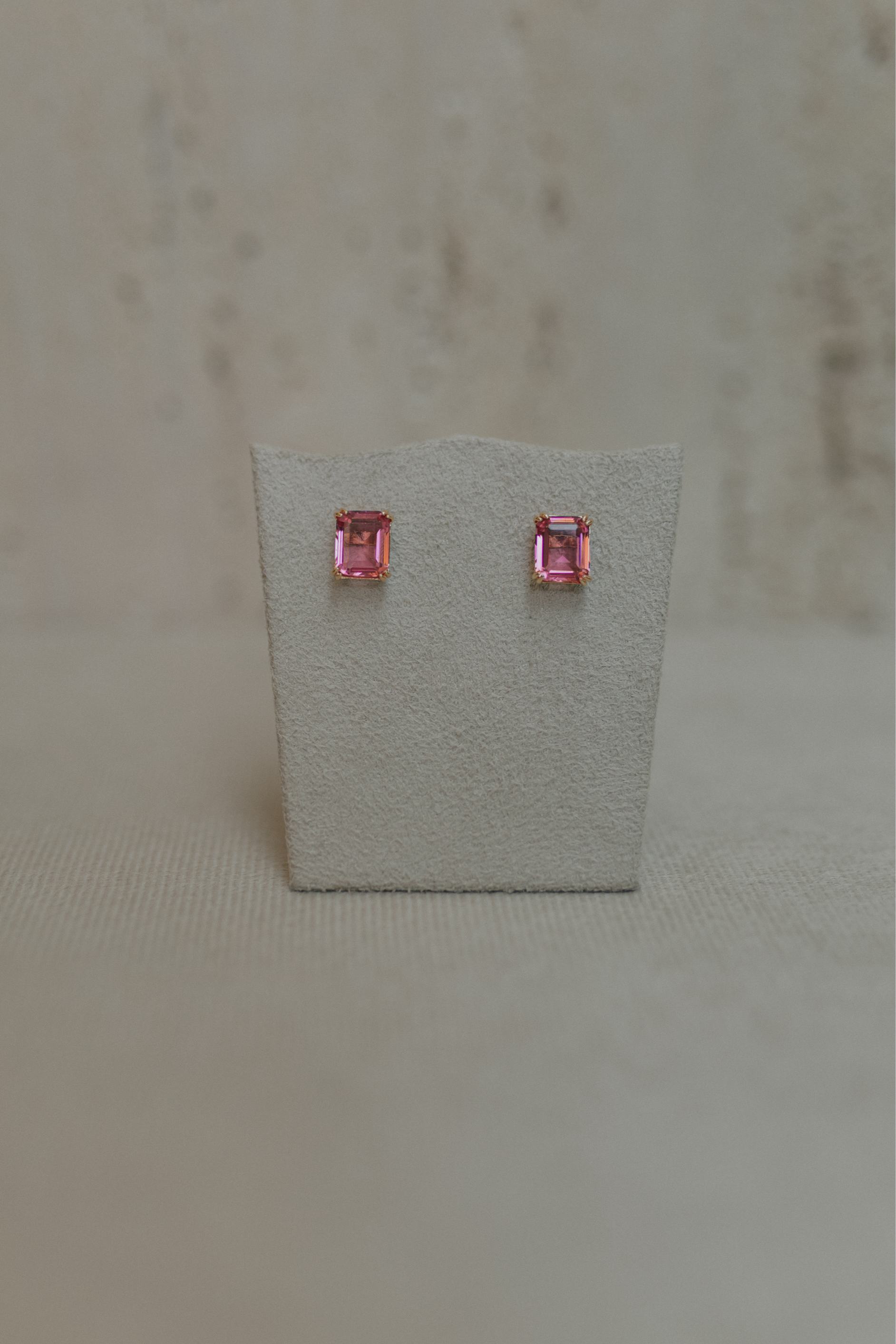 Brinco solitário retangular com pedra safira rosa no banho de ouro 18k.