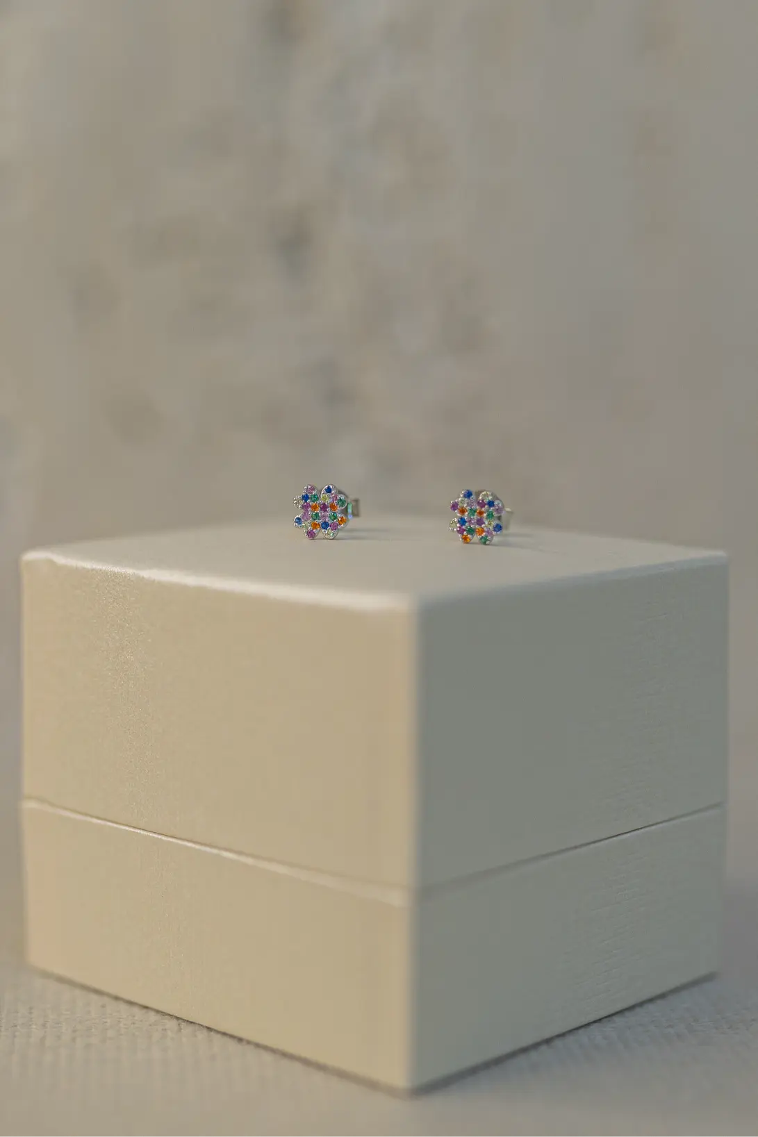 Brinco trevo com zircônias coloridas na prata 925 no banho de ródio branco.