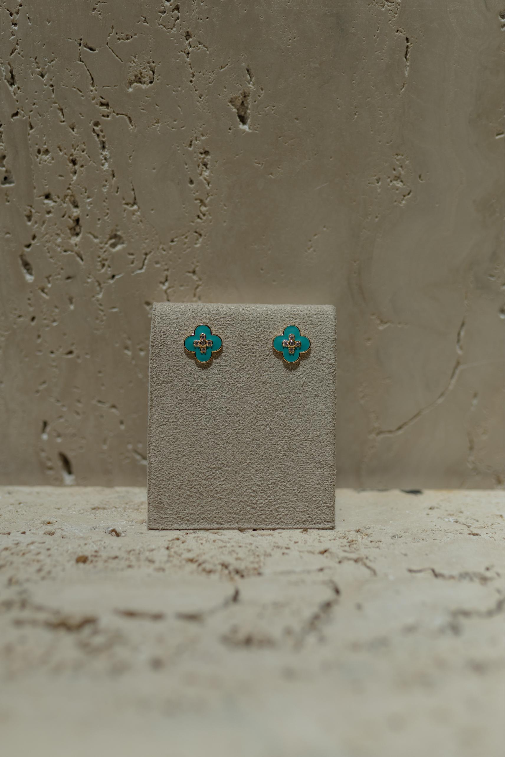 Brinco em formato de trevo com esmaltação italiana na cor turquesa com zircônias no centro no banho de ouro 18k.