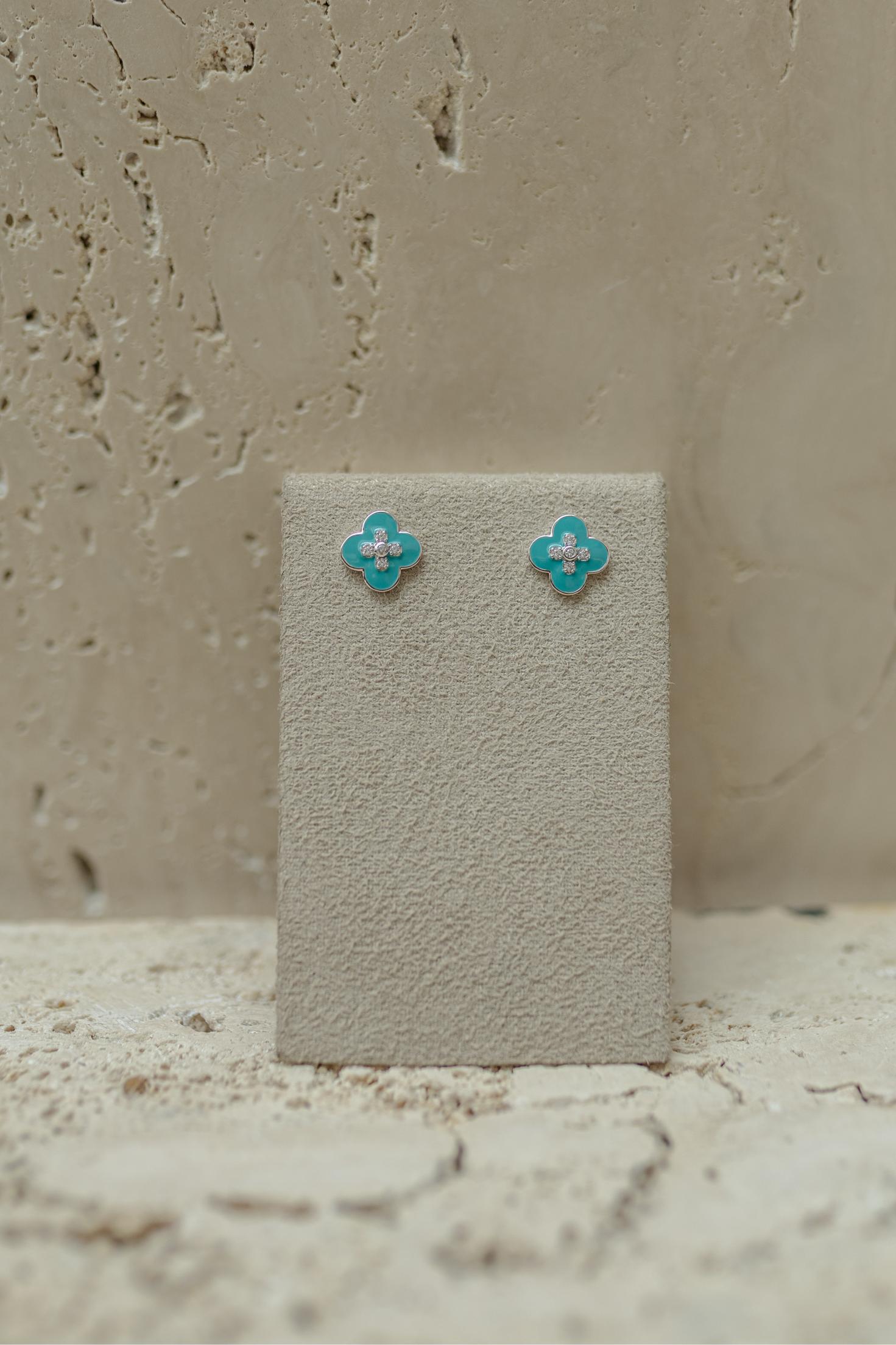 Brinco em formato de trevo com esmaltação italiana na cor turquesa com zircônias no centro no banho de ródio branco.