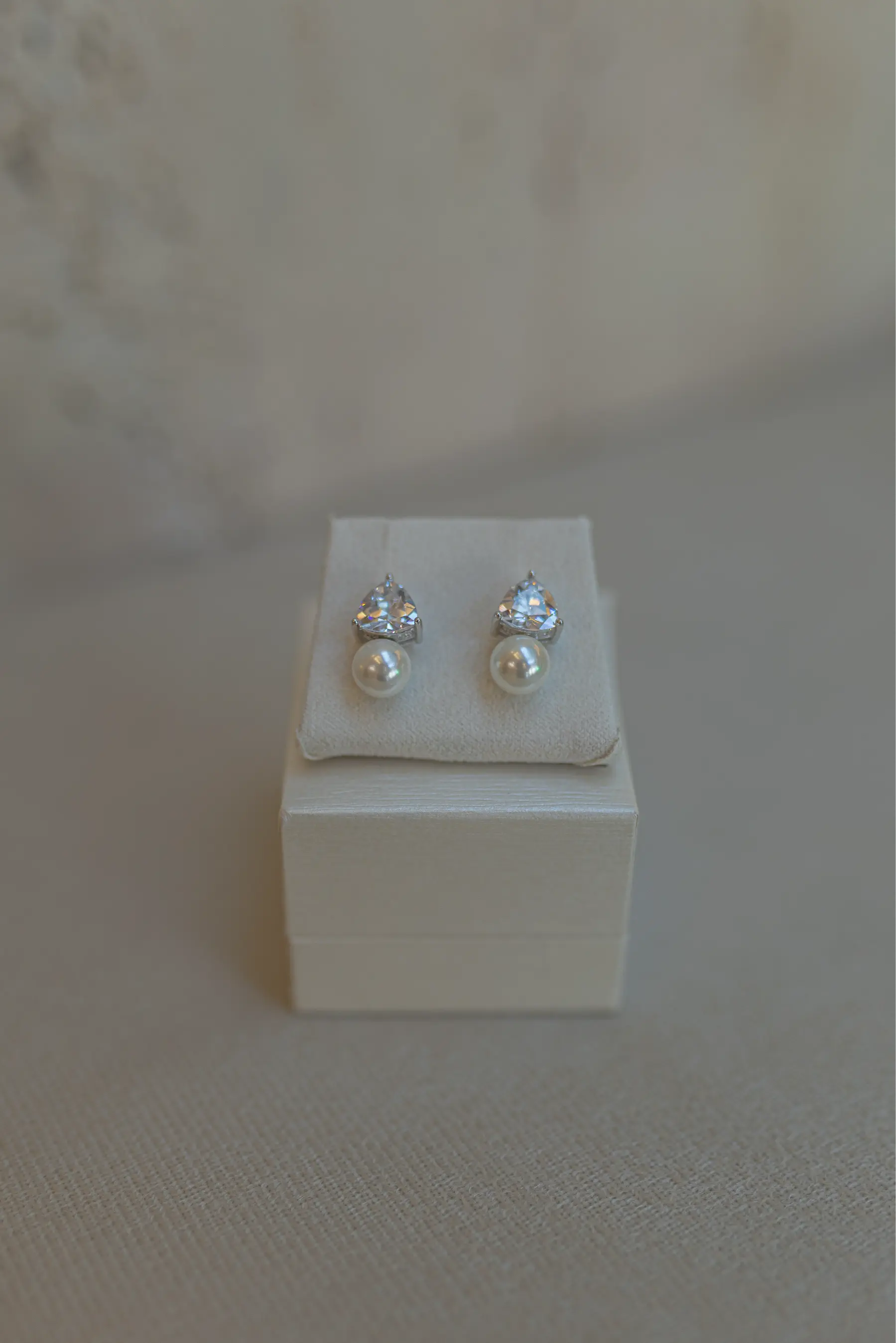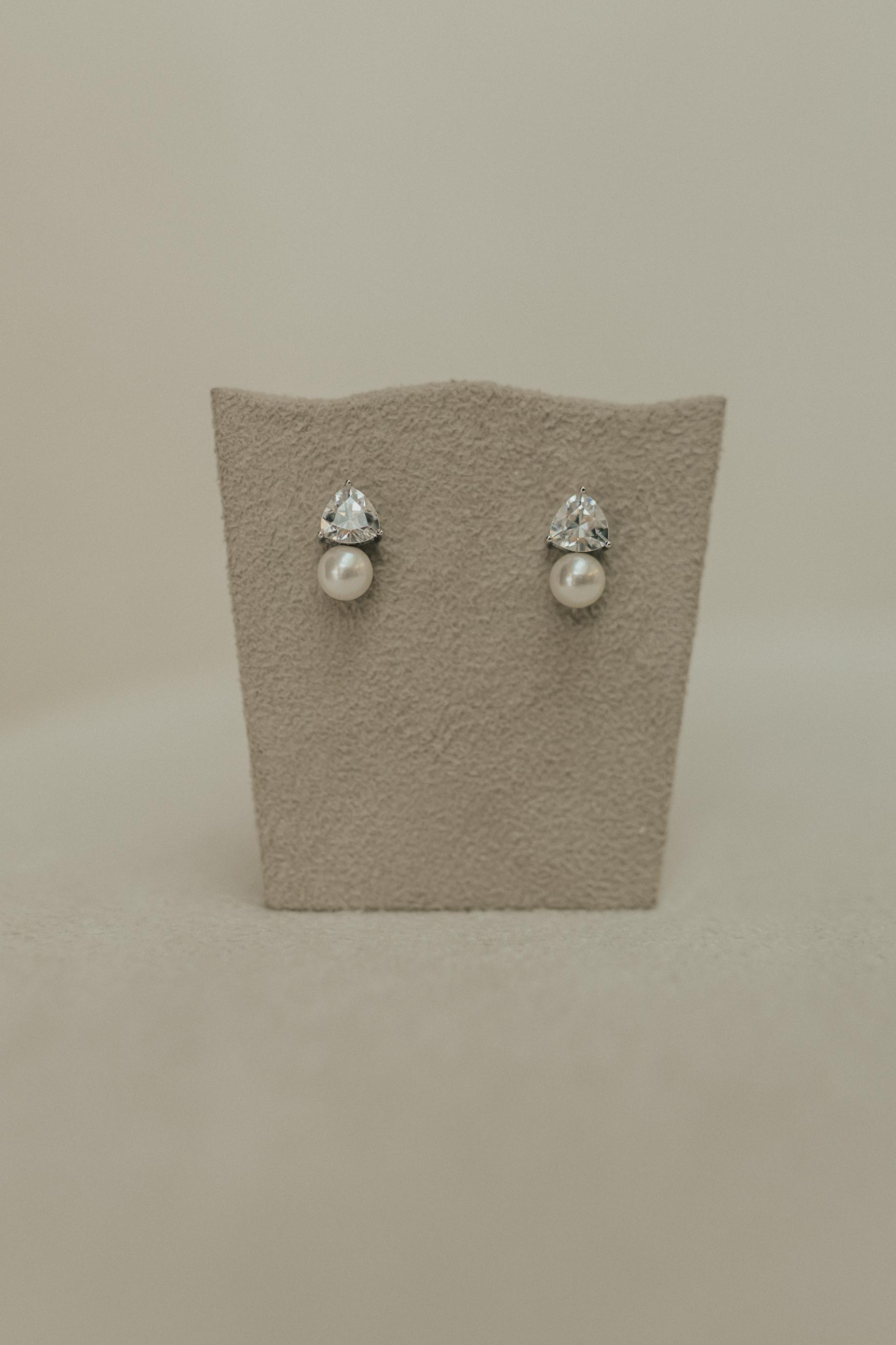 Brinco triângulo 8mm arredondado com cravação na lateral com pérola no banho de ródio branco.