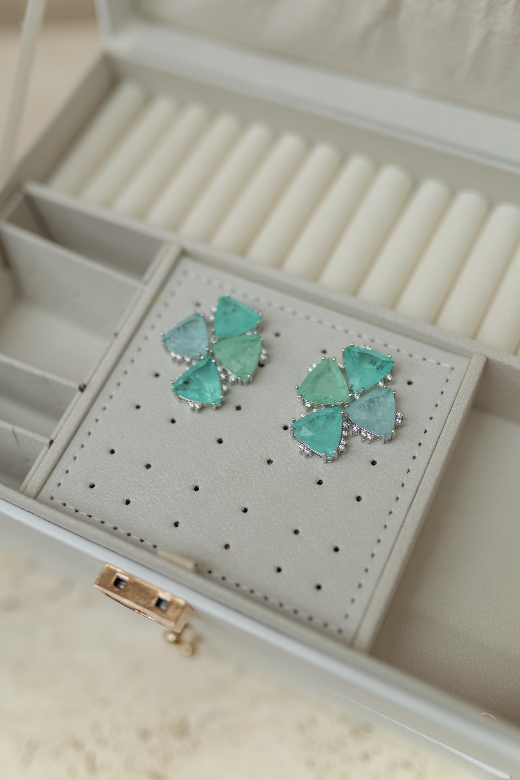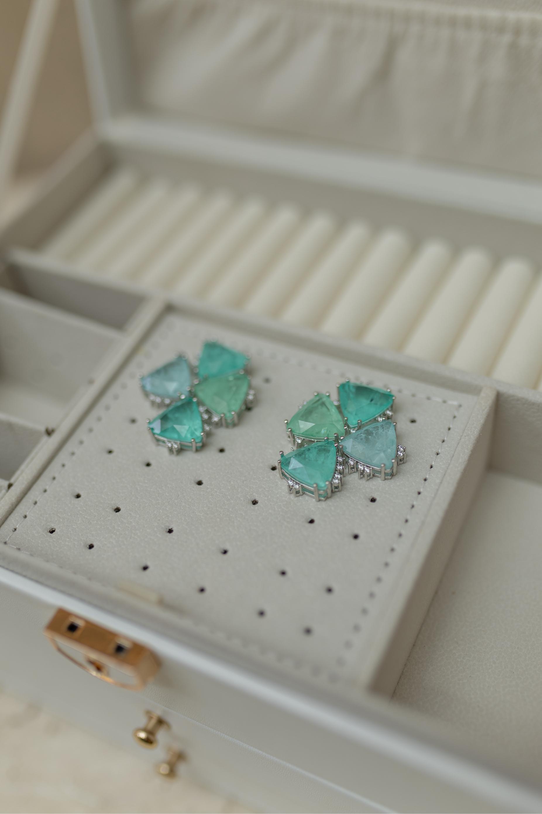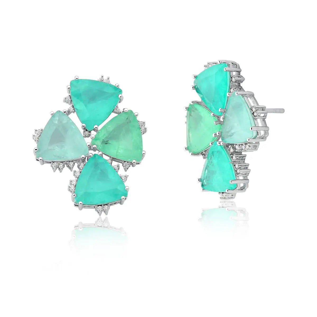Brinco com 4 cristais de Turmalina em formato triangular e pontos de luz cristal, com banho de ródio branco.