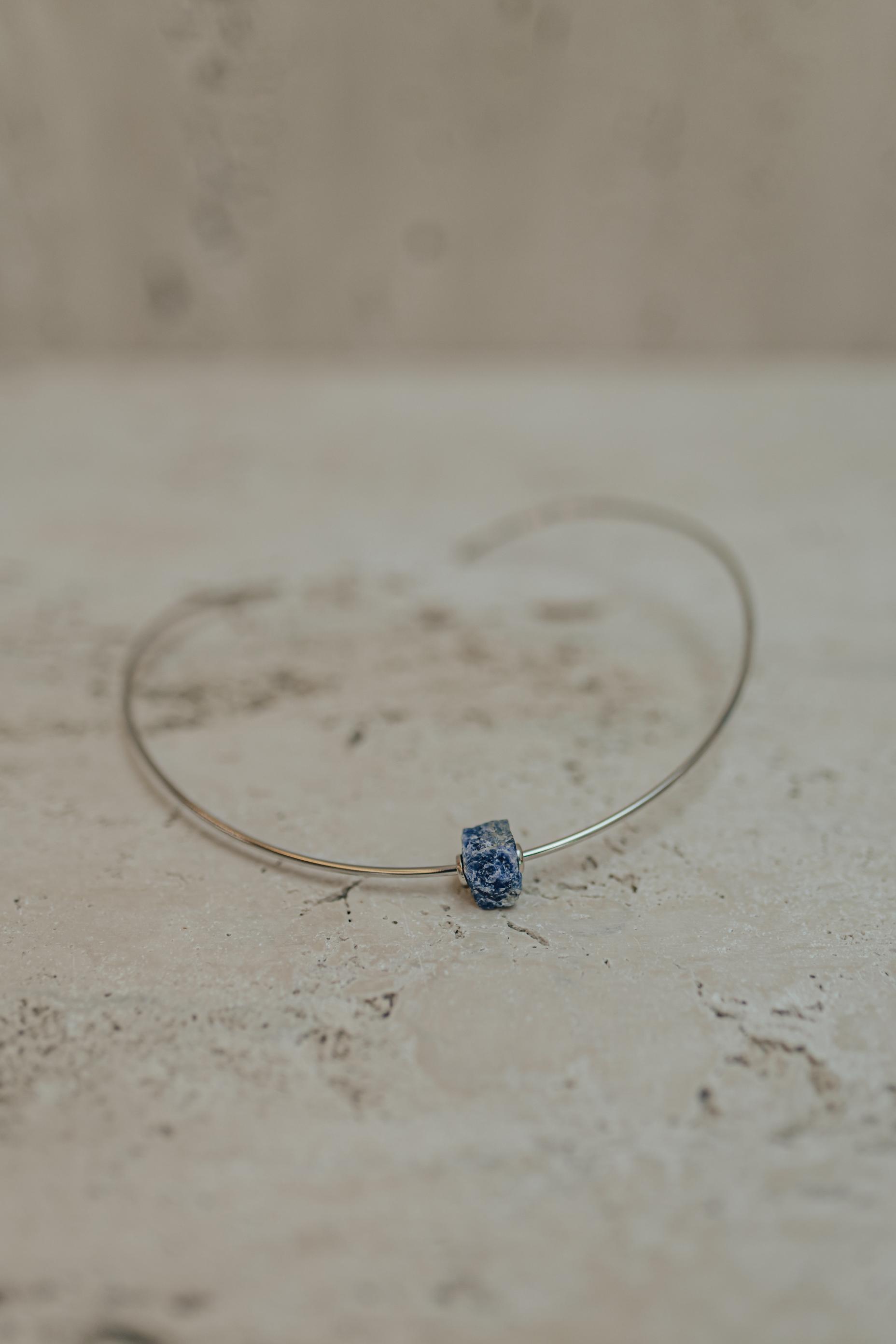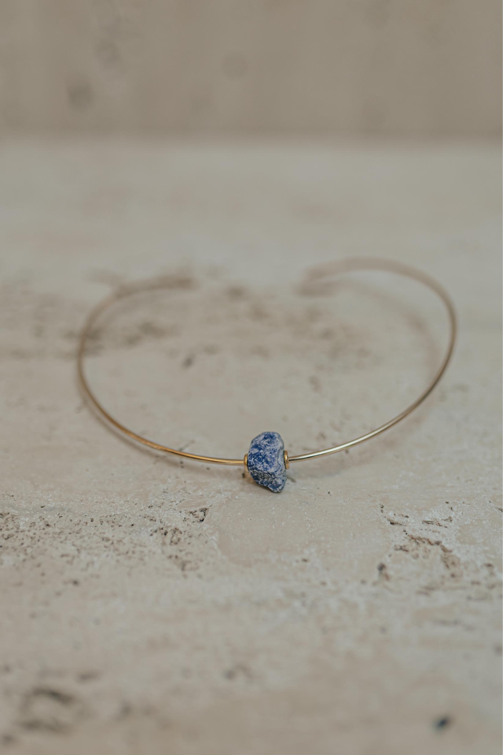 Colar em aro rígidio com uma pedra bruta natural, com formatos e tamanhos variados. As pedras variam de 1,0cm a 1,8cm.