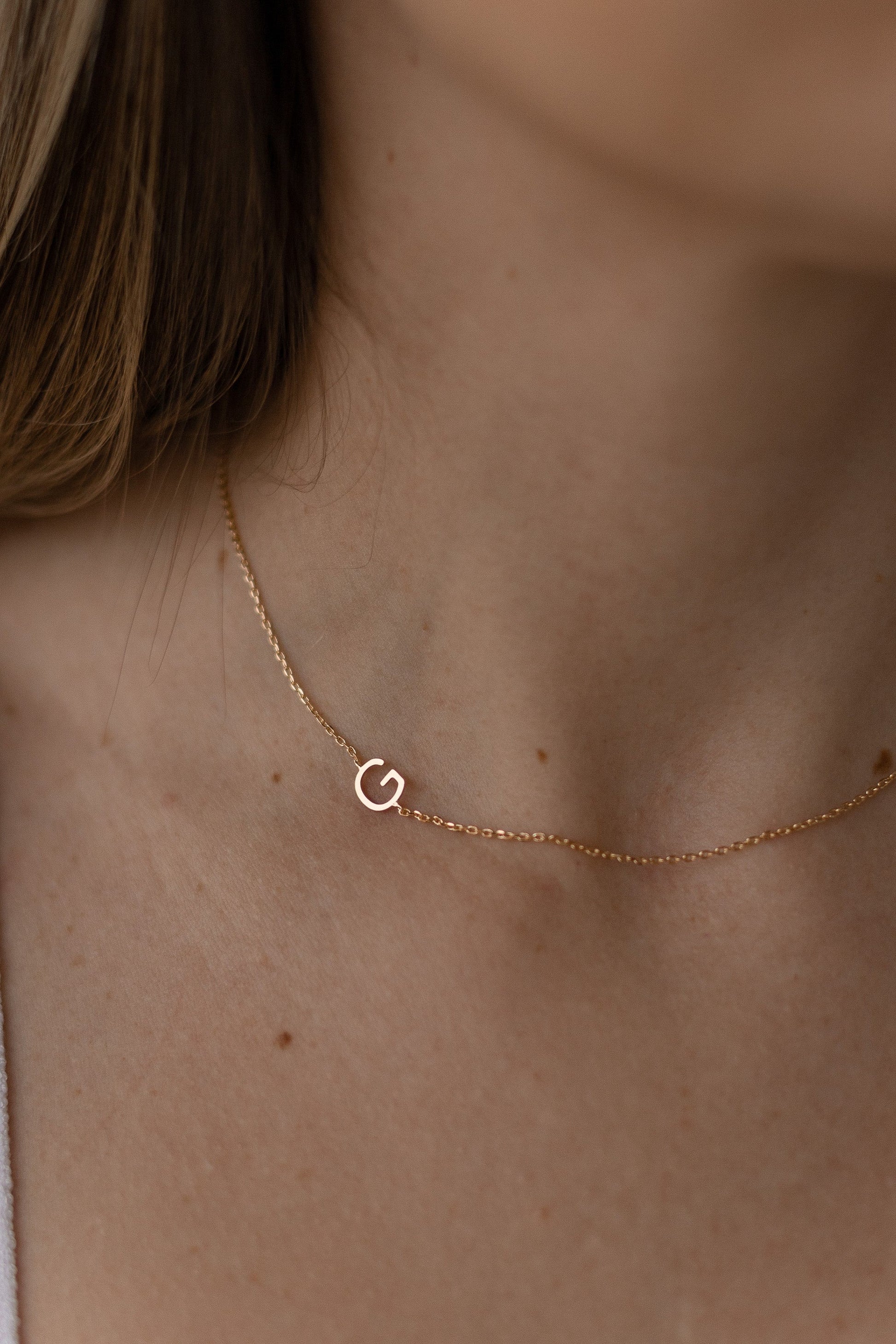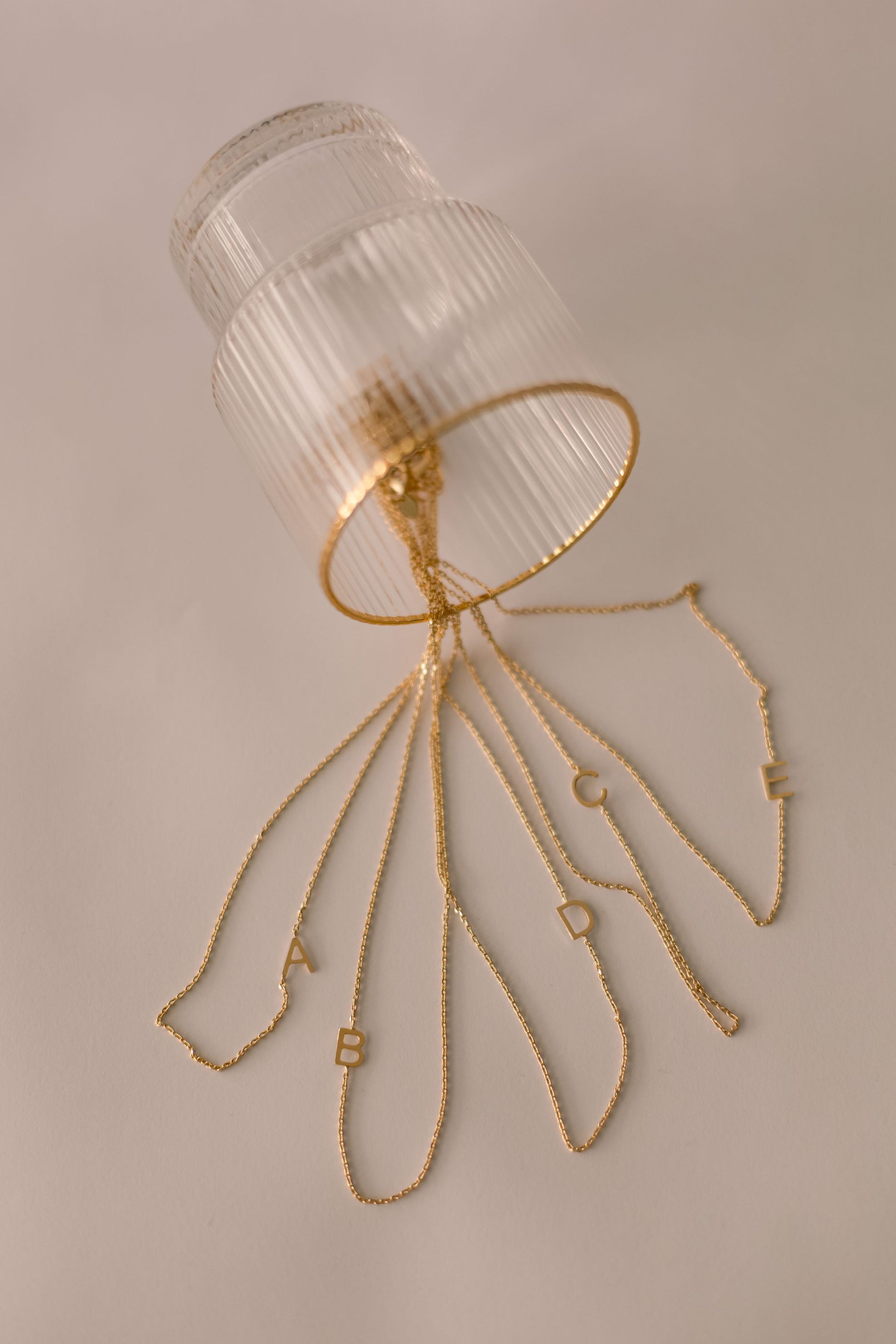 Choker com corrente delicada de elos português com pingente fixo de inicial e acabamento liso no banho de ouro 18k.