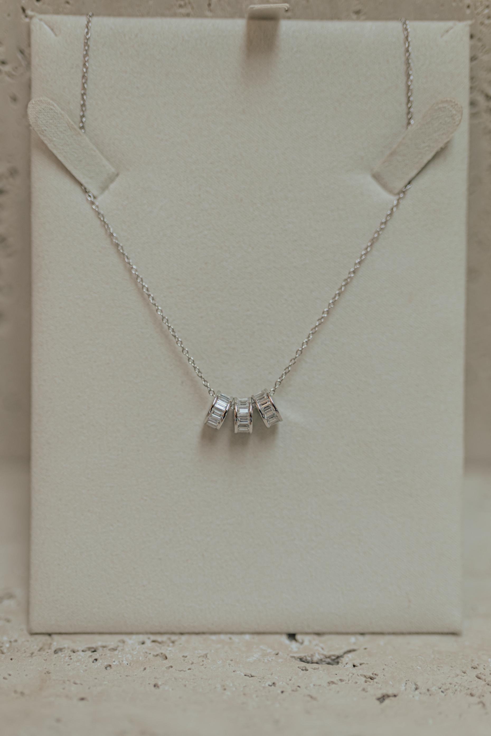 Colar com 3 pingentes círculo de zircônias em corte baguete na prata 925 e banho de ródio branco.