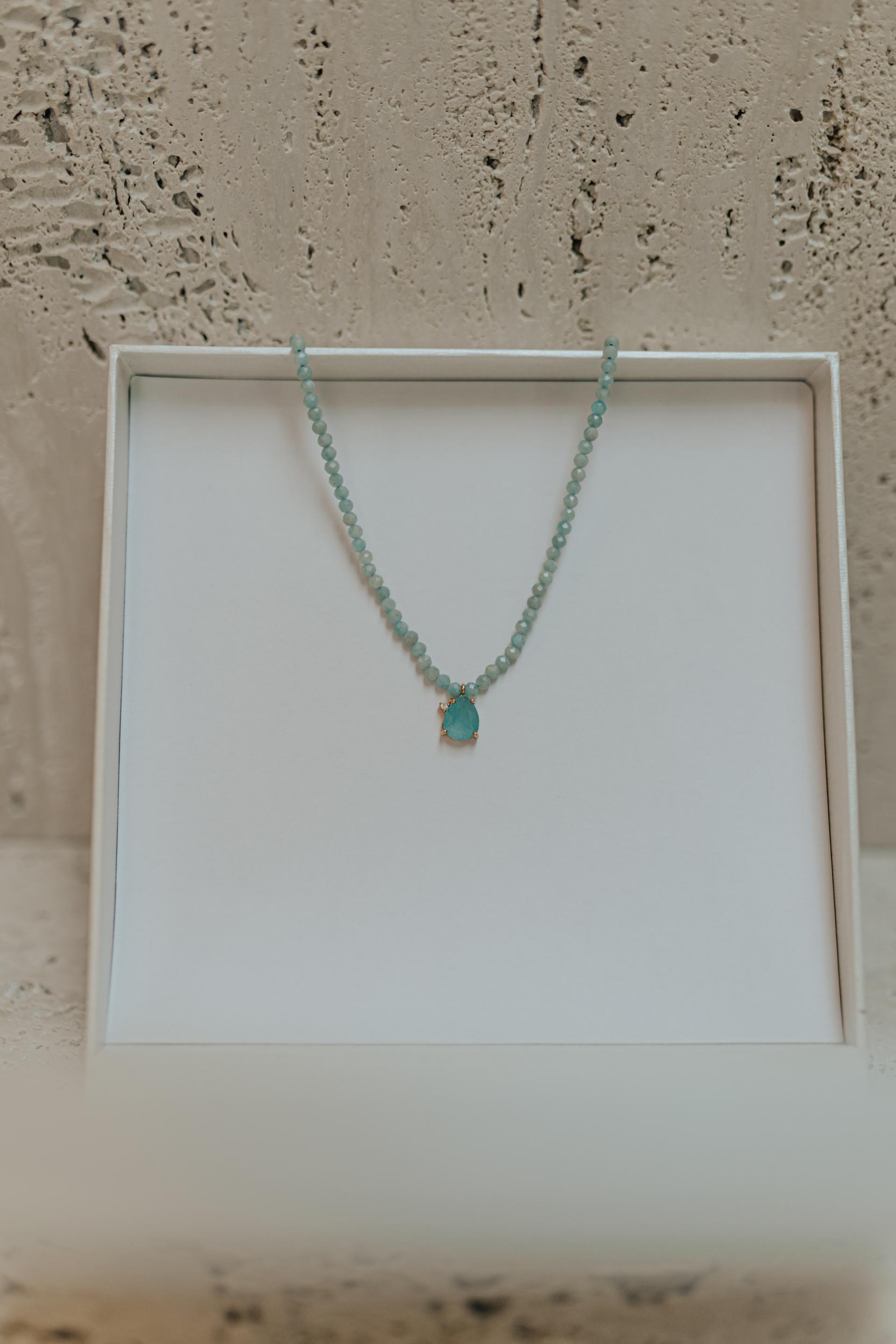 Colar Choker com pedras naturais Amazonita e pingente de gota no banho de ouro 18k.