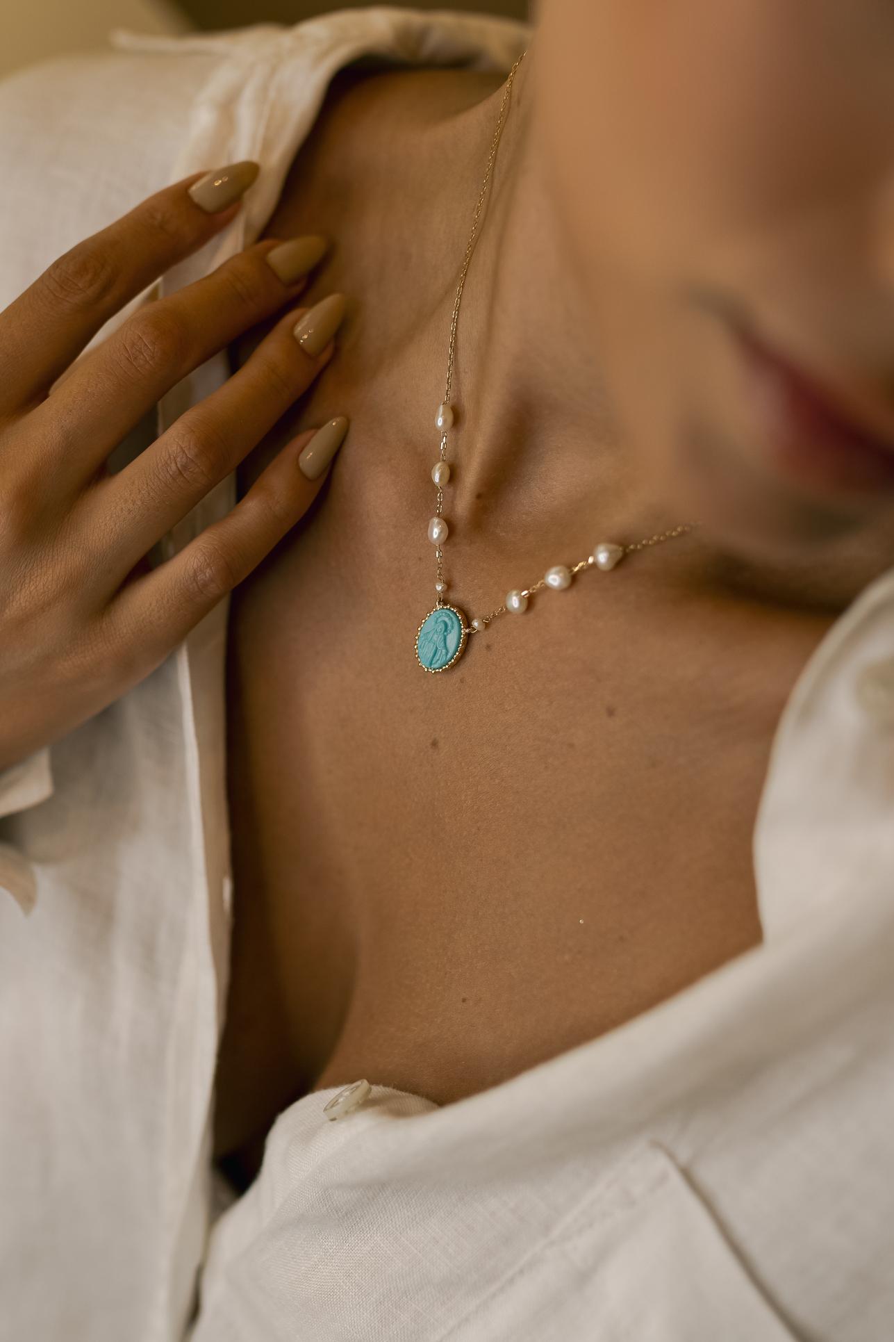 Colar choker com pingente oval de baquelite turquesa de Nossa Senhora das Graças e pérolas de água doce no banho de ouro 18k.