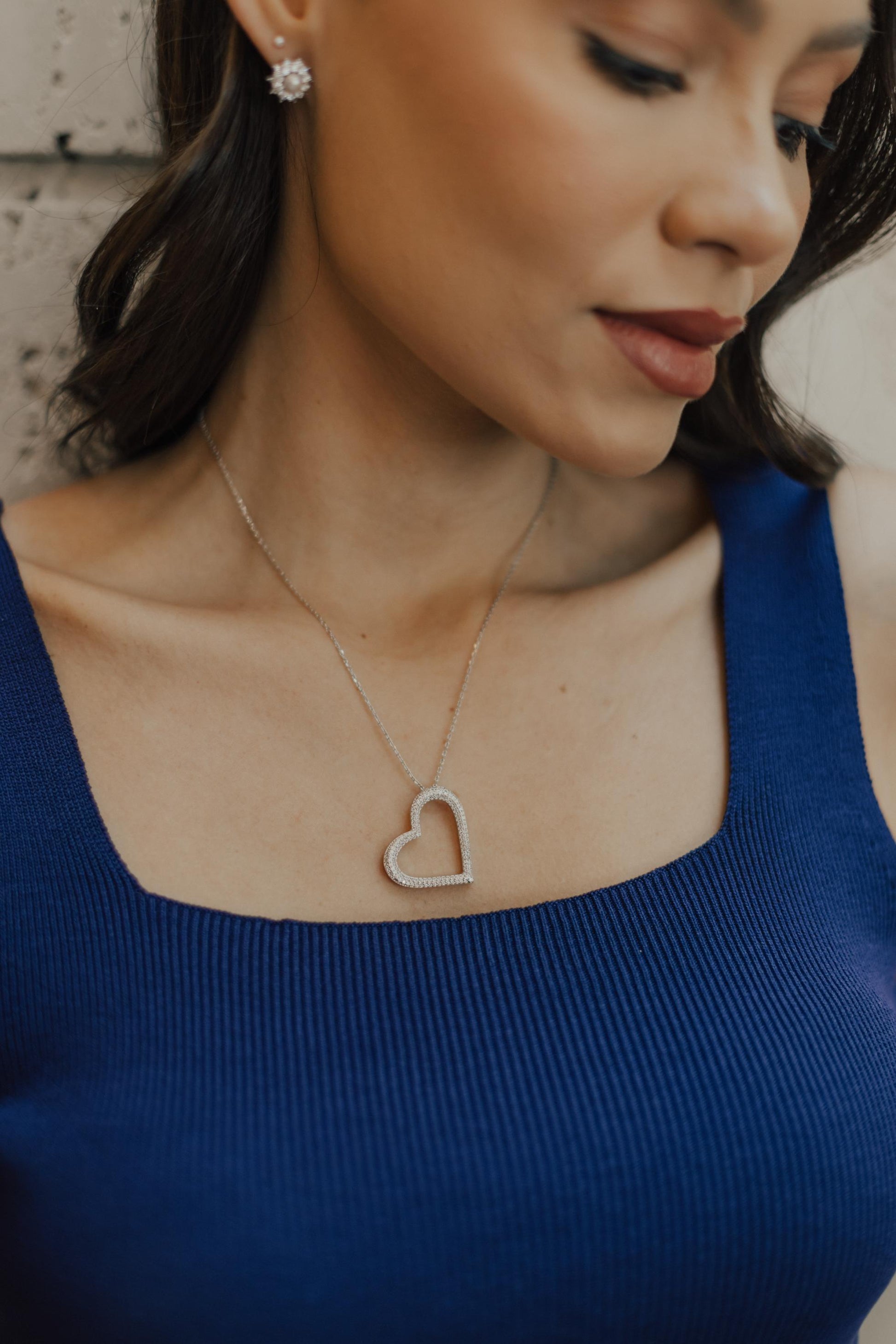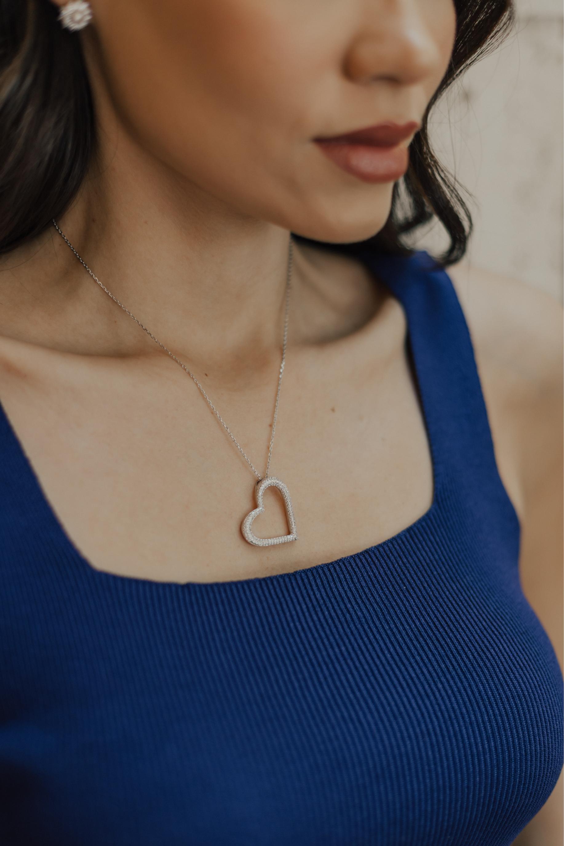 Colar com pingente de coração vazado toda cravejado com microzircônias na cor cristal no banho de ródio branco.