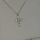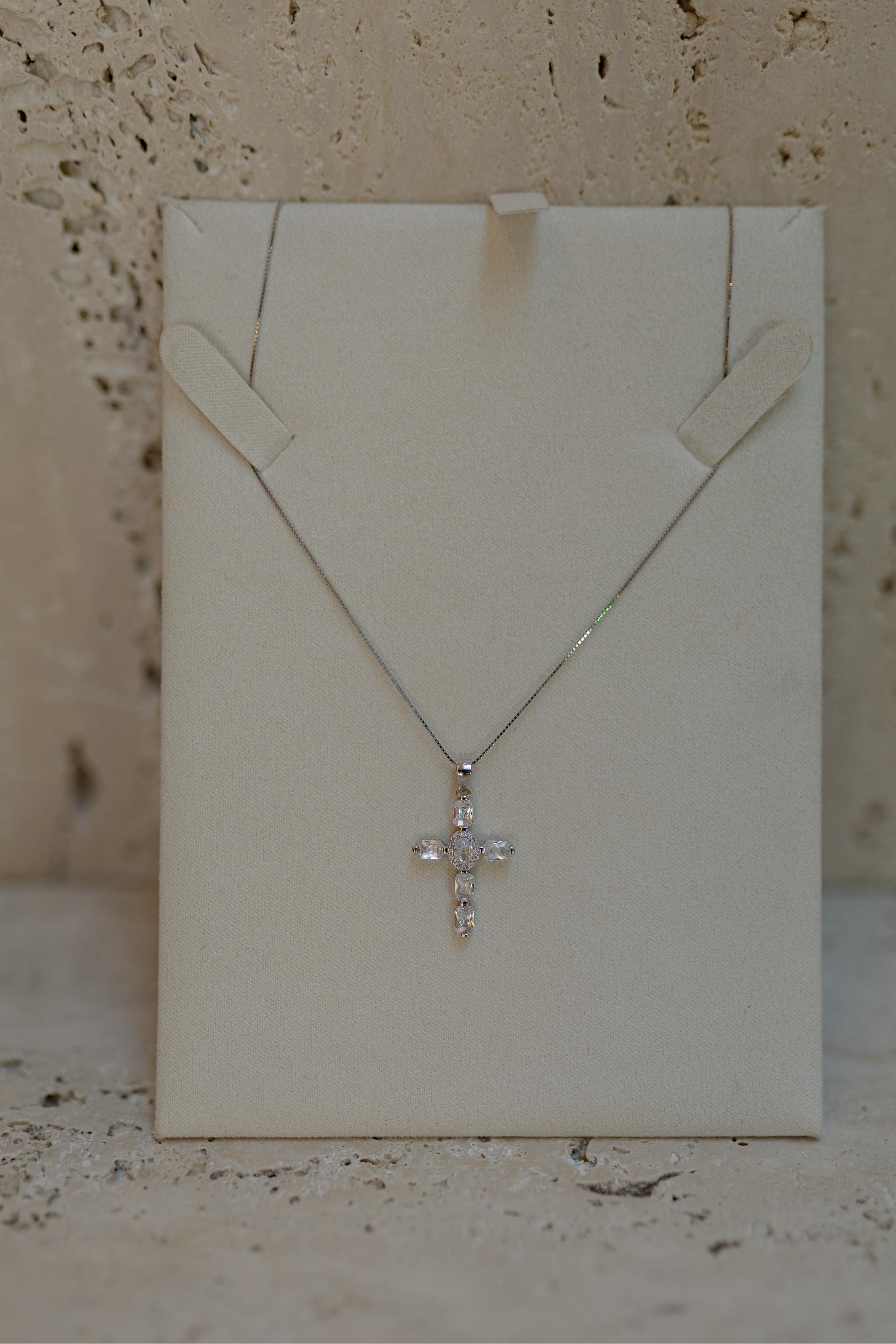 Colar em malha veneziana, com pingente de cruz, cristal retangular e oval, cravejado com zircônias brancas, em prata 925 com banho de ródio branco.