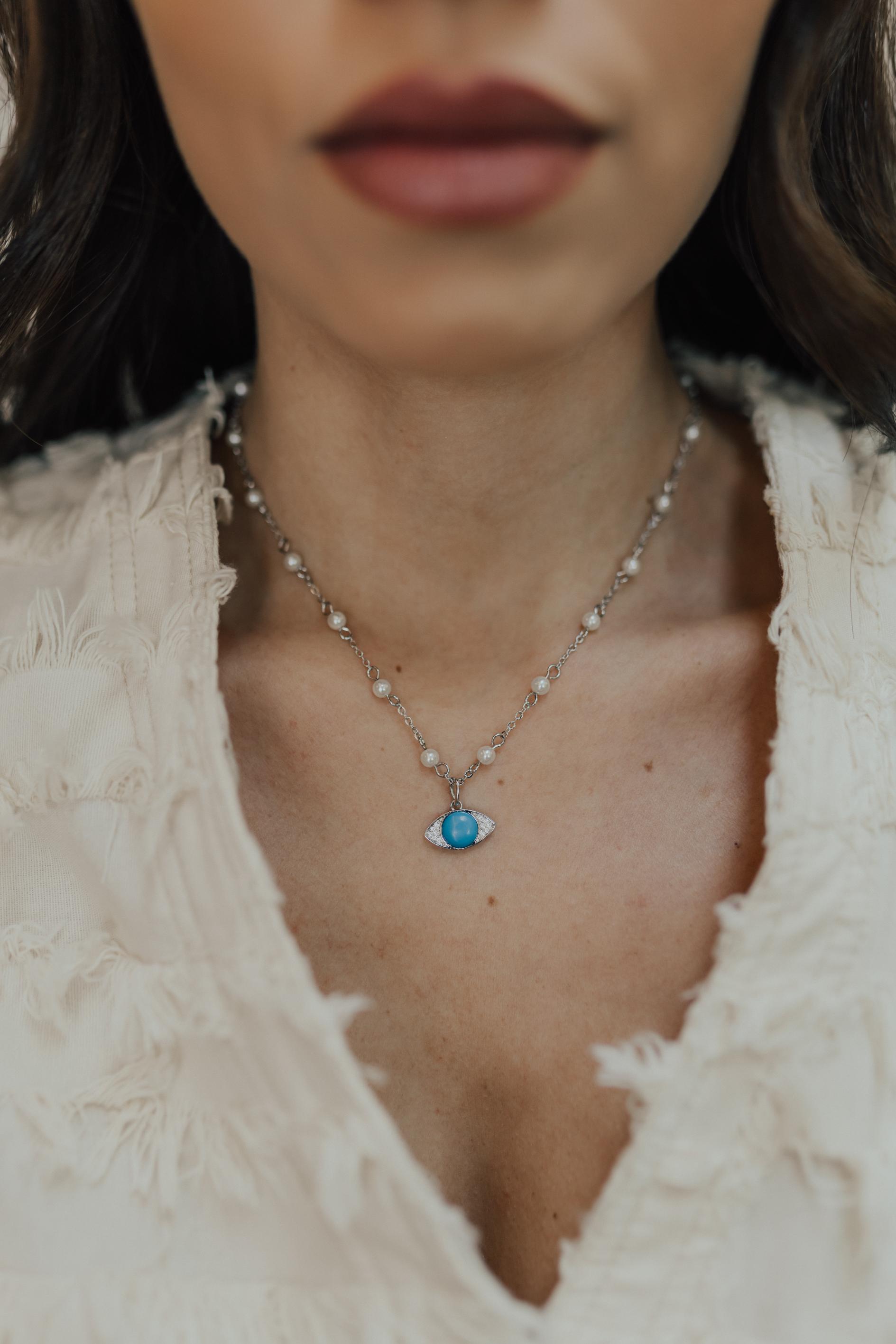 Colar de Elos no banho de ródio branco com pérolas por toda a extensão com pingente de olho grego no banho de ródio branco.
